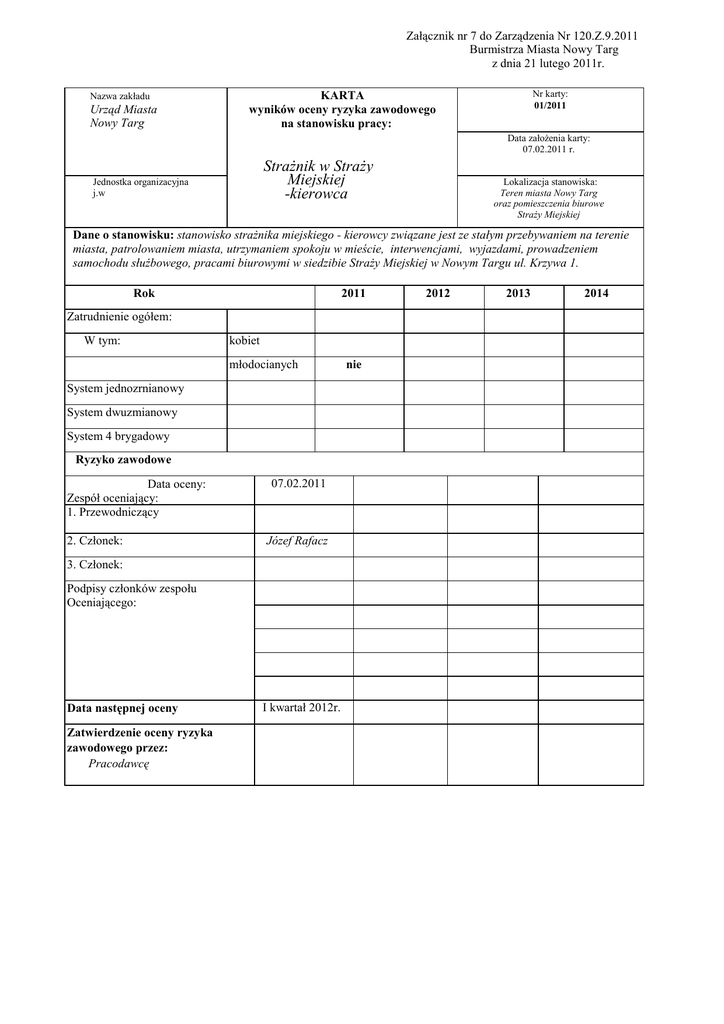 Załącznik nr 7 do Zarządzenia Nr 120.Z.9.2011 Burmistrza Miasta Nowy Targ z dnia 21 lutego 2011r. Nazwa zakładu Urząd Miasta Nowy Targ Nr karty: 01/2011 KARTA wyników oceny ryzyka zawodowego na stanowisku pracy: Data założenia karty: 07.02.2011 r. Strażnik w Straży Miejskiej -kierowca Jednostka organizacyjna j.w Lokalizacja stanowiska: Teren miasta Nowy Targ oraz pomieszczenia biurowe Straży Miejskiej Dane o stanowisku: stanowisko strażnika miejskiego - kierowcy związane jest ze stałym przebywaniem na terenie miasta, patrolowaniem miasta, utrzymaniem spokoju w mieście, interwencjami, wyjazdami, prowadzeniem samochodu służbowego, pracami biurowymi w siedzibie Straży Miejskiej w Nowym Targu ul. Krzywa 1. Rok 2011 Zatrudnienie ogółem: W tym: kobiet młodocianych System jednozrnianowy System dwuzmianowy System 4 brygadowy Ryzyko zawodowe Data oceny: Zespół oceniający: 1. Przewodniczący 2. Członek: 07.02.2011 Józef Rafacz 3. Członek: Podpisy członków zespołu Oceniającego: Data następnej oceny Zatwierdzenie oceny ryzyka zawodowego przez: Pracodawcę I kwartał 2012r. nie 2012 2013 2014 Wykaz operacji występujących na stanowisku pracy L P 1 Nazwa operacji Czas trwania Podstawowe czynności Przygotowanie do pracy Zapoznanie się z bieżącym planem pracy. Ustalenie kolejności czynności do wykonania. Zebranie materiałów potrzebnych do wykonania zadania. Wyjście z biura Komendy. 2 Wyjazdy na patrole do miasta Przygotowanie pojazdu do wyjazdu. Zajęcie miejsca w samochodzie, Wyjazd na ulice i place miejskie. Przejazd ulicami obserwując otoczenie. Zatrzymanie samochodu. Wyjście z samochodu w celu dokładniejszego wyjaśnienia zauważonego podejrzanego faktu. Przejście do miejsca interwencji, Powrót do samochodu, Kontynuowanie obserwacji. 3 Piesze patrole Wyjście z budynku Komendy. Przejście w wyznaczony rejon miasta. Obserwacja mijanych terenów. Bliższe zapoznanie się z zauważonymi nieprawidłowościami. Patrolowanie wyznaczonego terenu. Powrót do siedziby Komendy. 4 Interwencja Zapoznanie się z problemem. Wybór odpowiednich środków do rozwiązania problemu. Zastosowanie wybranych środków. Rozwiązanie powstałego problemu. Podjęcie decyzji. 5 Praca biurowa Przetwarzanie zebranych informacji w trakcie patrolowania miasta. Sporządzanie notatek. Sporządzanie raportów. Sporządzanie wniosków do organów nadzoru. Opracowywanie planów pracy. Bieżąca korespondencja. 6 Monitorowanie miasta i terenu budynku Urzędu Miasta Podejście do monitora ( monitorów). Obserwacja. Sprawdzanie wyników. Przekazanie danych z obserwacji przełożonemu. 7 Ograniczenia ryzyka zawodowego 1. Badania lekarskie; wstępne, okresowe, Wymagania zdrowotne dla stanowiska: sprawność manualna obydwu rąk, dobry wzrok, sprawność fizyczna 2. Profilaktyka organizacyjna Okresowe Szkolenia Instruktażowe Przysługujące Świadczenia Profilaktyczne I rekompensujące Tak -aktualne Tak- aktualne Posiłki profilaktyczne Dodatkowe urlopy Skrócony czas pracy Rotacja stanowisk Pracy 3. Profilaktyka techniczna Czynnik szkodliwy Ocena ryzyka Rodzaj i zakres działania Uraz powodowany wyrzucanymi przedmiotami Poślizgnięcie Stosowanie właściwych metod pracy, właściwa ocena sytuacji Obciążenie fizyczne Stosowanie odpowiednich urządzeń ograniczających wysiłek fizyczny Stosować właściwą organizację pracy Odpowiedzialny Termin realizacji Zachowanie szczególnej ostrożności w czasie pracy. Zmienne warunki atmosferyczne 4. Środki ochrony zbiorowej i indywidualnej Czynnik szkodliwy Ocena ryzyka Zastosowane środki ochrony zbiorowej i indywidualnej Ryzyko zawodowe jest akceptowalne i nie wymaga podjęcia dodatkowych działań poza dotychczas stosowanymi takie jak niżej: Uraz powodowany wyrzucanymi przedmiotami Poślizgnięcie Stosowanie środków ochrony osobistej, stosowanie przepisów bhp Hałas Stosowanie ochronników słuchu, okresowe badania laryngologiczne Obciążenie fizyczne Stosowanie środków ochrony osobistej, Zmienne warunki atmosferyczne Stosować odzież i obuwie ochronne Stosowanie odpowiedniego obuwia na spodach przeciwślizgowych 5. Wyniki oceny ryzyka zawodowego Ryzyko zawodowe na stanowisku pracy strażnika miejskiego - kierowcy występuje w stopniu akceptowalnym. Wykaz zagrożeń występujących na stanowisku prac T P N Ocena ryzyka 1 1 1 2 2 1 2 2 1 2 2 2 1 1 2 2 2 2 1 1 1 1 1 1 2 2 1 1 2 1 2 2 1 1 1 2 2 2 2 2 2 2 2 2 2 1 1 1 1 2 1 - lasery - pola elektryczne wysokiej częstotliwości - pola elektryczne niskiej częstotliwości - pola elektryczne prądu stałego 1 1 1 1 2 1 7 Substancje chemiczne 2 2 2 2 1 1 8 Substancje biologiczne 2 2 2 2 2 2 9 Zapylenie 2 2 2 2 2 2 2 2 2 2 2 2 2 2 2 2 1 2 2 1 1 2 1 2 2 2 1 2 1 2 1 Zagrożenie LP Nr operacji 1 1 5 6 2 2 2 2 2 1 2 2 1 1 1 1 2 2 1 1 1 1 2 2 1 2 2 1 1 1 1 1 1 1 Termiczne - kontakt człowieka z obiektami o wysokiej lub bardzo niskiej temperaturze, jak również z promieniowaniem źródeł ciepła 1 2 Hałas - poziom ekspoz. A dla 8 H pracy (dB) 1 Drgania mechaniczne Promieniowane -łuk elektryczny -źródła promieniowania elektrycznego Mechaniczne - zgniecenia (zmiażdżenia) - obcięcia lub ucięcie - wplatanie, wciągnięcie lub oderwanie - ukłucie lub przebicie - starcie lub otarcie - wytrysk cieczy pod ciśnieniem - wyrzucane przedmioty - poślizgnięcie, potknięcie, upadek - utrata stateczności maszyny (urządzenia) 2 4 2 1 1 1 2 2 1 2 L 2 4 7 2 8 Elektryczne bezpośrednie lub pośrednie dotknięcie elementów będących pod napięciem - zbliżenie do elementów pod wysokim napięć. -elektryczność statyczna - promieniowanie cieplne lub inne zjawiska, takie jak: wyrzucane roztopione cząstki, skutki chemiczne przy zwarciach, przeciążeniach. 3 2 2 23 1 - poziom maksymalny w (dB) - poziom szczytowy w (dB) 5 6 - stężenie pyłu całkowitego - stężenie pyłu respirabilnego - % Si02 10 Warunki klimatyczne ; zmienne - zimne środowisko pracy - gorące środowisko pracy - wilgotność 11 