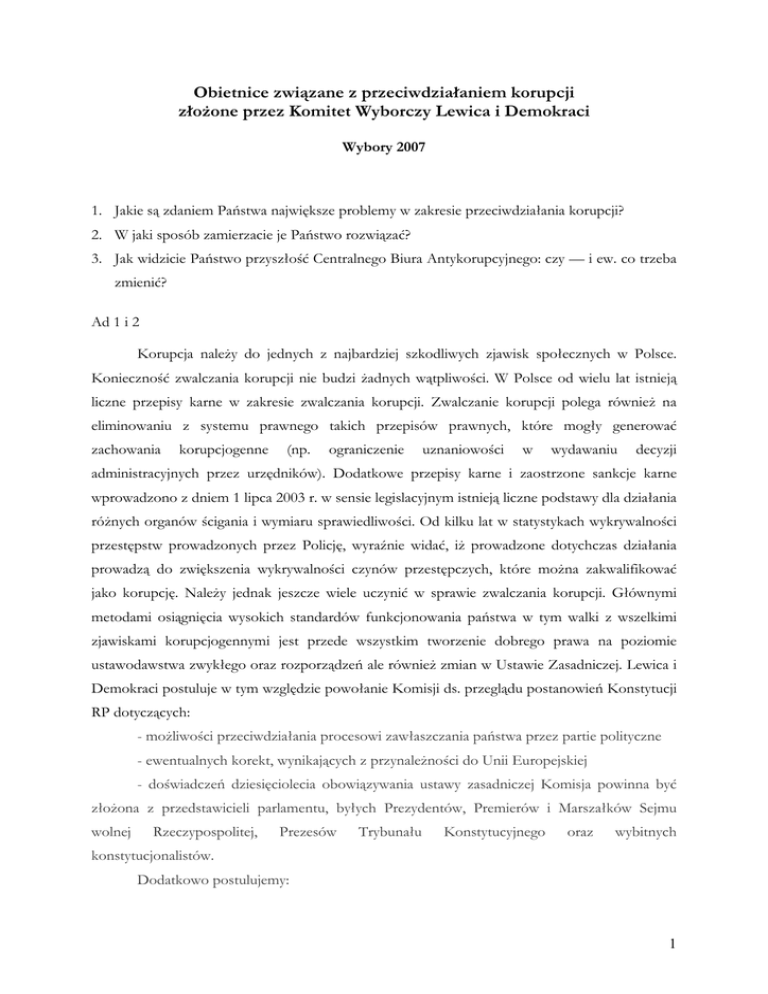 Obietnice związane z przeciwdziałaniem korupcji złożone przez Komitet Wyborczy Lewica i Demokraci Wybory 2007 1. Jakie są zdaniem Państwa największe problemy w zakresie przeciwdziałania korupcji? 2. W jaki sposób zamierzacie je Państwo rozwiązać? 3. Jak widzicie Państwo przyszłość Centralnego Biura Antykorupcyjnego: czy — i ew. co trzeba zmienić? Ad 1 i 2 Korupcja należy do jednych z najbardziej szkodliwych zjawisk społecznych w Polsce. Konieczność zwalczania korupcji nie budzi żadnych wątpliwości. W Polsce od wielu lat istnieją liczne przepisy karne w zakresie zwalczania korupcji. Zwalczanie korupcji polega również na eliminowaniu z systemu prawnego takich przepisów prawnych, które mogły generować zachowania korupcjogenne (np. ograniczenie uznaniowości w wydawaniu decyzji administracyjnych przez urzędników). Dodatkowe przepisy karne i zaostrzone sankcje karne wprowadzono z dniem 1 lipca 2003 r. w sensie legislacyjnym istnieją liczne podstawy dla działania różnych organów ścigania i wymiaru sprawiedliwości. Od kilku lat w statystykach wykrywalności przestępstw prowadzonych przez Policję, wyraźnie widać, iż prowadzone dotychczas działania prowadzą do zwiększenia wykrywalności czynów przestępczych, które można zakwalifikować jako korupcję. Należy jednak jeszcze wiele uczynić w sprawie zwalczania korupcji. Głównymi metodami osiągnięcia wysokich standardów funkcjonowania państwa w tym walki z wszelkimi zjawiskami korupcjogennymi jest przede wszystkim tworzenie dobrego prawa na poziomie ustawodawstwa zwykłego oraz rozporządzeń ale również zmian w Ustawie Zasadniczej. Lewica i Demokraci postuluje w tym względzie powołanie Komisji ds. przeglądu postanowień Konstytucji RP dotyczących: - możliwości przeciwdziałania procesowi zawłaszczania państwa przez partie polityczne - ewentualnych korekt, wynikających z przynależności do Unii Europejskiej - doświadczeń dziesięciolecia obowiązywania ustawy zasadniczej Komisja powinna być złożona z przedstawicieli parlamentu, byłych Prezydentów, Premierów i Marszałków Sejmu wolnej Rzeczypospolitej, Prezesów Trybunału Konstytucyjnego oraz wybitnych konstytucjonalistów. Dodatkowo postulujemy: 1 1. Uchwalenie przez Sejm KARTY STANDARDÓW POLITYCZNYCH. 2. Rozdzielenie stanowiska ministra sprawiedliwości i prokuratora generalnego, którym powinna zostać osoba bezpartyjna, o wysokim autorytecie moralnym (np. sędzia Sądu Najwyższego). Wprowadzimy zasadę siedmioletniej kadencyjności na tym stanowisku. Umocnimy niezależność sądów i trybunałów, anulujemy wszystkie ustawy wprowadzone przez PiS w celu ograniczenia niezależności sądownictwa. 3. Przywrócenie służby cywilnej w administracji rządowej i wprowadzenia jej w instytucjach jednostek samorządu terytorialnego. Dokonanie ustawowego określenia stanowisk o charakterze politycznym, zaś objęcie obsady pozostałych stanowisk związane będzie z procedurą jawnych, przejrzystych konkursów. 4. Publikację podstawowych danych o członkach rad nadzorczych i zarządach spółek skarbu państwa, wraz z podaniem ich ewentualnej przynależności partyjnej. Konkursy na stanowiska w zarządach tych spółek powinny być obowiązkowe. 5. Walka z korupcją odbywać się powinna przede wszystkim poprzez jawność, społeczną kontrolę i przejrzystość działań administracji. W związku z tym przewidujemy: - oparte na kompetencji zasady obsadzania stanowisk; - pełny, nieskrępowany dostęp obywateli do informacji o podstawach decyzji administracyjnych; - jawność działania ministerstw (publiczne wysłuchania w trakcie przygotowywania najważniejszych projektów ustaw, możliwość zgłaszania uwag obywatelskich w Internecie, internetowe informacje o ustaleniach kierownictw ministerstw); - obowiązkowy rejestr korzyści i oświadczenia o braku konfliktu interesów dla doradców politycznych ministrów; - zakaz prowadzenia działalności gospodarczej powodującej konflikt interesów przez kontrolerów i inspektorów państwowych oraz ich bliskich; - upowszechnienie obowiązkowych przetargów internetowych oraz w formie jawnej aukcji dla realizacji zamówień publicznych, - spółki Skarbu Państwa zostaną ustawowo zobowiązane do publikowania dorocznej informacji o wszelkich darowiznach i akcjach sponsorskich. 6. wprowadzeni zapisów zakazu łącznia mandatu posła ze stanowiskiem urzędniczym poniżej ministra-członka Rady Ministrów. Ad 3. Powołanie Centralnego Biura Antykorupcyjnego, tak jak Sojusz Lewicy Demokratycznej prezentował w trakcie prac nad projektem ustawy w Sejmie V Kadencji - zdecydowanie negatywnie wpłynęło na działania innych służb – w szczególności ABW i Policji (CBŚ), które posiadają i posiadały wcześniej ustawowo zapisane zwalczanie korupcji w zakres swoich kompetencji. Powstanie nowej „elitarnej” formacji, a szczególnie powierzenie większości zadań do tej pory realizowanych przez ABW i Policję osobom, które będą przyjmowane do pracy na 2 podstawie rozmowy kwalifikacyjnej i z kryterium posiadania wykształcenia średniego (tak zakłada ustawa o CBA), nie jest dobrym rozwiązaniem. Doprowadziło to do zamieszania organizacyjnego i kompetencyjnego, co w oczywisty sposób wiąże się z brakiem fachowego nadzoru nad prowadzonymi postępowaniami. Ponadto kompetencje operacyjno-rozpoznawcze i dochodzeniowo-śledcze w pełni dublują się w tym zakresie (na stałe) z kompetencjami Policji, (a przez pierwsze 18 miesięcy od powołania CBA) z ABW. Dobre wynagrodzenia dla starannie wyselekcjonowanych przez polityczne kierownictwo CBA funkcjonariuszy może prowadzić w perspektywie czasowej do przekształcenia CBA w instrument walki politycznej przeciwko „niewygodnym” osobom stojącym po przeciwnej stronie sceny politycznej. Dodatkowo należy zaznaczyć, że ustawa narusza w wielu miejscach Konstytucję RP, ograniczając konstytucyjne prawa i wolności obywatelskie