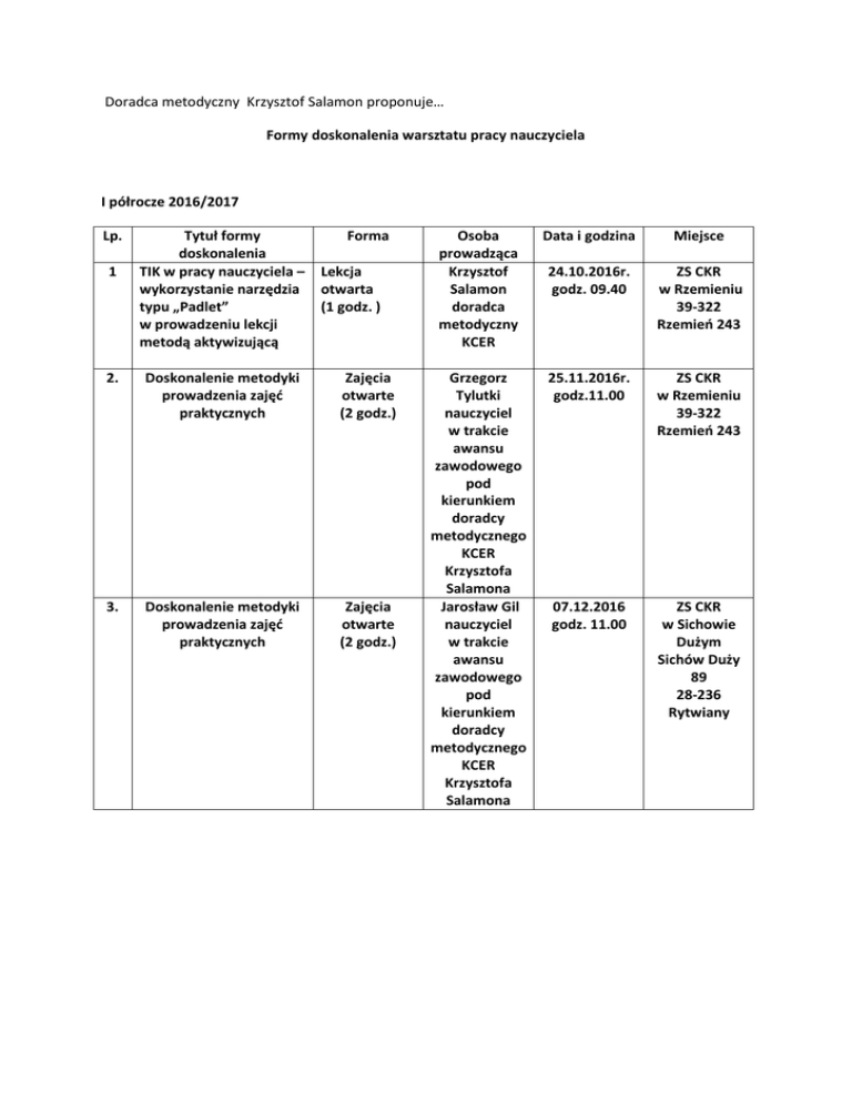 Doradca metodyczny Krzysztof Salamon proponuje… Formy doskonalenia warsztatu pracy nauczyciela I półrocze 2016/2017 Lp. 1 Tytuł formy doskonalenia TIK w pracy nauczyciela – wykorzystanie narzędzia typu „Padlet” w prowadzeniu lekcji metodą aktywizującą Forma Lekcja otwarta (1 godz. ) 2. Doskonalenie metodyki prowadzenia zajęć praktycznych Zajęcia otwarte (2 godz.) 3. Doskonalenie metodyki prowadzenia zajęć praktycznych Zajęcia otwarte (2 godz.) Osoba prowadząca Krzysztof Salamon doradca metodyczny KCER Data i godzina Miejsce 24.10.2016r. godz. 09.40 ZS CKR w Rzemieniu 39-322 Rzemień 243 Grzegorz Tylutki nauczyciel w trakcie awansu zawodowego pod kierunkiem doradcy metodycznego KCER Krzysztofa Salamona Jarosław Gil nauczyciel w trakcie awansu zawodowego pod kierunkiem doradcy metodycznego KCER Krzysztofa Salamona 25.11.2016r. godz.11.00 ZS CKR w Rzemieniu 39-322 Rzemień 243 07.12.2016 godz. 11.00 ZS CKR w Sichowie Dużym Sichów Duży 89 28-236 Rytwiany II półrocze 2017 Lp. 4. 5. Tytuł formy doskonalenia TIK w pracy nauczyciela – wykorzystanie narzędzia typu „Socrative” w prowadzeniu lekcji i sprawdzaniu wiedzy uczniów Doskonalenie metodyki prowadzenia zajęć praktycznych - zajęcia praktyczne na temat: „Kalibracja opryskiwacza”. Wymagania stawiane sprzętowi do stosowania środków ochrony roślin. Wyposażenie i działalnie Stacji Kontroli Opryskiwaczy, Forma Lekcja otwarta (1 godz. ) Zajęcia otwarte połączone z warsztatami (4 godz.) w tym: 2godz. zajęcia otwarte, 2 godz. warsztaty Osoba prowadząca Krzysztof Salamon doradca metodyczny KCER Data i godzina Miejsce 15.02.2017 godz. 11.30 ZS CKR w Rzemieniu 39-322 Rzemień 243 Krzysztof Salamon doradca metodyczny KCER 19.05.2017 godz. 10.00 ZS CKR w Rzemieniu 39-322 Rzemień 243