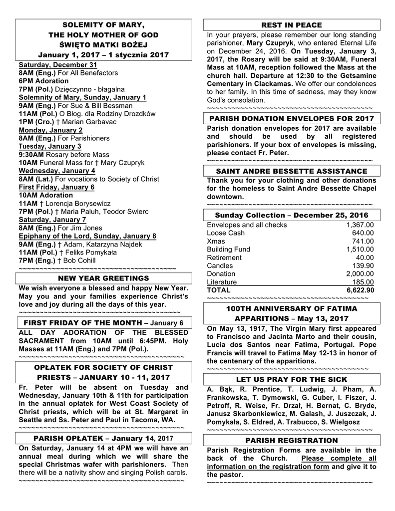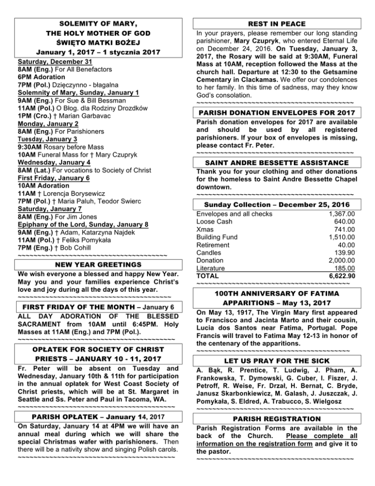 SOLEMITY OF MARY, THE HOLY MOTHER OF GOD ŚWIĘTO MATKI BOŻEJ January 1, 2017 – 1 stycznia 2017 Saturday, December 31 8AM (Eng.) For All Benefactors 6PM Adoration 7PM (Pol.) Dzięczynno - błagalna Solemnity of Mary, Sunday, January 1 9AM (Eng.) For Sue & Bill Bessman 11AM (Pol.) O Błog. dla Rodziny Drozdków 1PM (Cro.) † Marian Garbavac Monday, January 2 8AM (Eng.) For Parishioners Tuesday, January 3 9:30AM Rosary before Mass 10AM Funeral Mass for † Mary Czupryk Wednesday, January 4 8AM (Lat.) For vocations to Society of Christ First Friday, January 6 10AM Adoration 11AM † Lorencja Borysewicz 7PM (Pol.) † Maria Paluh, Teodor Swierc Saturday, January 7 8AM (Eng.) For Jim Jones Epiphany of the Lord, Sunday, January 8 9AM (Eng.) † Adam, Katarzyna Najdek 11AM (Pol.) † Feliks Pomykała 7PM (Eng.) † Bob Cohill ~~~~~~~~~~~~~~~~~~~~~~~~~~~~~~~~~~~~~~ NEW YEAR GREETINGS We wish everyone a blessed and happy New Year. May you and your families experience Christ’s love and joy during all the days of this year. ~~~~~~~~~~~~~~~~~~~~~~~~~~~~~~~~~~~~~~~ FIRST FRIDAY OF THE MONTH – January 6 ALL DAY ADORATION OF THE BLESSED SACRAMENT from 10AM until 6:45PM. Holy Masses at 11AM (Eng.) and 7PM (Pol.). ~~~~~~~~~~~~~~~~~~~~~~~~~~~~~~~~~~~~~~~~ OPŁATEK FOR SOCIETY OF CHRIST PRIESTS – JANUARY 10 - 11, 2017 Fr. Peter will be absent on Tuesday and Wednesday, January 10th & 11th for participation in the annual opłatek for West Coast Society of Christ priests, which will be at St. Margaret in Seattle and Ss. Peter and Paul in Tacoma, WA. ~~~~~~~~~~~~~~~~~~~~~~~~~~~~~~~~~~~~~~~~ PARISH OPŁATEK – January 14, 2017 On Saturday, January 14 at 4PM we will have an annual meal during which we will share the special Christmas wafer with parishioners. Then there will be a nativity show and singing Polish carols. ~~~~~~~~~~~~~~~~~~~~~~~~~~~~~~~~~~~~~~~~ REST IN PEACE In your prayers, please remember our long standing parishioner, Mary Czupryk, who entered Eternal Life on December 24, 2016. On Tuesday, January 3, 2017, the Rosary will be said at 9:30AM, Funeral Mass at 10AM, reception followed the Mass at the church hall. Departure at 12:30 to the Getsamine Cementary in Clackamas. We offer our condolences to her family. In this time of sadness, may they know God’s consolation. ~~~~~~~~~~~~~~~~~~~~~~~~~~~~~~~~~~~~~~~~ PARISH DONATION ENVELOPES FOR 2017 Parish donation envelopes for 2017 are available and should be used by all registered parishioners. If your box of envelopes is missing, please contact Fr. Peter. ~~~~~~~~~~~~~~~~~~~~~~~~~~~~~~~~~~~~~~~~ SAINT ANDRE BESSETTE ASSISTANCE Thank you for your clothing and other donations for the homeless to Saint Andre Bessette Chapel downtown. ~~~~~~~~~~~~~~~~~~~~~~~~~~~~~~~~~~~~~~~~ Sunday Collection – December 25, 2016 Envelopes and all checks 1,367.00 Loose Cash 640.00 Xmas 741.00 Building Fund 1,510.00 Retirement 40.00 Candles 139.90 Donation 2,000.00 Literature 185.00 TOTAL 6,622.90 ~~~~~~~~~~~~~~~~~~~~~~~~~~~~~~~~~~~~~~~ 100TH ANNIVERSARY OF FATIMA APPARITIONS – May 13, 2017 On May 13, 1917, The Virgin Mary first appeared to Francisco and Jacinta Marto and their cousin, Lucia dos Santos near Fatima, Portugal. Pope Francis will travel to Fatima May 12-13 in honor of the centenary of the apparitions. ~~~~~~~~~~~~~~~~~~~~~~~~~~~~~~~~~~~~~~~ LET US PRAY FOR THE SICK A. Bąk, R. Prentice, T. Ludwig, J. Pham, A. Frankowska, T. Dymowski, G. Cuber, I. Fiszer, J. Petroff, R. Weise, Fr. Drzał, H. Bernat, C. Bryde, Janusz Skarbonkiewicz, M. Galash, J. Juszczak, J. Pomykała, S. Eldred, A. Trabucco, S. Wielgosz ~~~~~~~~~~~~~~~~~~~~~~~~~~~~~~~~~~~~~~~~ PARISH REGISTRATION Parish Registration Forms are available in the back of the Church. Please complete all information on the registration form and give it to the pastor. ~~~~~~~~~~~~~~~~~~~~~~~~~~~~~~~~~~~~~~~~ ŻYCZENIA NOWOROCZNE Życzymy wszystkim parafianom szczęśliwego i błogosławionego Nowego Roku. Abyście wraz z rodzinami doświadczyli Bożej miłości nowo Narodzonej Dzieciny przez wszystkie dni tego roku. ~~~~~~~~~~~~~~~~~~~~~~~~~~~~~~~~~~~~~~~ WIECZNY ODPOCZYNEK Pamiętajmy w naszych modlitwach o śp. Marii Czupryk, naszej długoletniej, zasłużonej parafiance, która odszeła do Domu Pana w sobotę, 24 grudnia w Portland. We wtorek, 3 stycznia Różaniec o godz. 9:30, Msza pogrzebowa o godz. 10:00. Przyjęcie bezpośrednio po Mszy w Sali. Wyjazd na cmentarz o godz. 12:30. Wyrazy głębokiego współczucia dla rodziny i przyjaciół. Wieczny odpoczynek racz dać jej Panie, a światłość wiekuista niechaj jej świeci na wieki wieków. ~~~~~~~~~~~~~~~~~~~~~~~~~~~~~~~~~~~~~~~~ CAŁODNIOWA ADORACJA – 6 stycznia 2017 W Pierwszy Piątek Miesiąca – CAŁODNIOWA ADORACJA - od 10:00 do 18:50. Msze św. o godz. 8:00 (ang.), 19:00 (pol.). Wpisujemy się na listę. ~~~~~~~~~~~~~~~~~~~~~~~~~~~~~~~~~~~~~~ SPOTKANIE OPŁATKOWE DLA KSIĘŻY CHRYSTUSOWCÓW – 10 i 11 stycznia 2017 Ksiądz Piotr będzie uczestniczył w dorocznym spotkaniu opłatkowym księży chrystusowców pracujących na zachodnim wybrzeżu Ameryki i Kanady, które będzie w parafii Św. Małgorzaty w Seattle i św. Piotra i Pawła w Tacomie, WA. ~~~~~~~~~~~~~~~~~~~~~~~~~~~~~~~~~~~~~~~~ OPŁATEK PARAFIALNY - 14 stycznia 2017 Spotkanie opłatkowe rozpoczniemy połamaniem się opłatkiem i posiłkiem o godzinie 16:00. W programie Jasełka i śpiewanie kolęd. ~~~~~~~~~~~~~~~~~~~~~~~~~~~~~~~~~~~~~~~~ ADWENTOWA POMOC DLA BEZDOMNYCH z St. Andre Bessette Chapel Podziękowanie dla wszystkich, którzy złożyli donacje ubrań oraz innych rzeczy w czasie tegorocznej adwentowej pomocy dla ludzi bezdomnych i potrzebujących pomocy. ~~~~~~~~~~~~~~~~~~~~~~~~~~~~~~~~~~~~~~~~ PRZYNALEŻNOŚĆ DO PARAFII Rejestracja do parafii jest wyrazem przynależności do wspólnoty Kościoła Katolickiego. Bycie czynnym parafianinem jest koniecznym warunkiem otrzymania sakramentu chrztu św., Pierwszej Komunii św., bierzmowania, ślubów i pogrzebów. Prosi