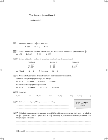 Test diagnozujacy w klasie I (zalacznik I) 1. Wynikiem działania 14 15 − 4 · 0,05 jest: A. 14 B. 0,51 C. 12 1 5 D. 10 2. Który z poniższych ułamków dziesiętnych jest jednocześnie większy od A. 0,75 B. 0,685 C. 0,6 3 3 i mniejszy od 4 ? 5 D. 0,55 3. Które z trójkątów o podanych miarach dwóch kątów są równoramienne? A. Tylko II Trójkąt I Trójkąt II Trójkąt III α = 50◦ β = 80◦ α = 45◦ β = 45◦ α = 110◦ β = 20◦ B. I i III C. Wszystkie D. I i II 4. Prostokąt zbudowano z dwóch kwadratów o obwodach równych 24 cm. a) Obwód otrzymanego prostokąta jest równy: A. 48 cm B. 36 cm C. 42 cm D. 24 cm b) Pole otrzymanego prostokąta wynosi: A. 36 cm2 B. 144 cm2 C. 72 cm2 D. 48 cm2 5. Uzupełnij: 2,6 m = ............ cm 410,5 m = ............ km 182,5 g = ............ dag 5,6 kg = ............ g 6. Oblicz, ile kosztuje 0,3 kilograma sera oliwskiego. ................................................................................................................... ................................................................................................................... 7. Odległość między pewnymi miastami wynosi 240 km. Kierowca przejechał 80 km , h a pozostałą część – z prędkością o 20 km h 2 tej trasy z prędkością 3 mniejszą. W jakim czasie kierowca przejechał całą trasę? Zapisz obliczenia. ............................................................................................................................... .................................... ............................................................................................................................... .................................... ............................................................................................................................... .................................... Odpowiedź: .............................................................................................................................................. 8. Adam codziennie rano odczytywał wskazania termometru zaokiennego. Swoje obserwacje przedstawił w tabeli. Dzień tygodnia Poniedziałek Temperatura −1◦C Wtorek Środa Czwartek Piątek Sobota Niedziela +2◦C −4◦C −6◦C −10◦C −9◦C −4◦C Korzystając z tabeli, uzupełnij tekst: Najniższą temperaturę wana w środę była o ◦C Adam zaobserwował w ............................... . Temperatura odnoto◦C wyższa od temperatury odnotowanej w sobotę, a o ◦C niższa od .......... .......... .......... temperatury odnotowanej we wtorek. 9. Zapisz w postaci wyrażeń algebraicznych odpowiedzi na poniższe pytania: a) Kilogram czereśni kosztuje o 3,60 zł więcej niż kilogram truskawek. Kilogram truskawek kosztuje x złotych. Ile trzeba zapłacić za 2 kg czereśni? ............................................................................................................................... .................................... b) Za wypożyczenie motorówki płaci się następująco: 80 zł za pierwszą godzinę i po y zł za każdą następną. Ile trzeba zapłacić za wynajęcie motorówki na 5 godzin? ............................................................................................................................... .................................... 10. Na mapie sporządzonej w skali 1 : 40 000 odległość między Szyntułami Górnymi a Szyntułami Dolnymi wynosi 24 cm. Oblicz rzeczywistą odległość między tymi miejscowościami. Zapisz obliczenia, a wynik podaj w kilometrach. ............................................................................................................................... .................................... ............................................................................................................................... .................................... ............................................................................................................................... .................................... Odpowiedź: ............................................................................................................................... ............... 11. Objętość prostopadłościanu, którego dwie krawędzie mają długości 8 cm i 6 cm, jest równa 240 cm3 . Oblicz pole powierzchni całkowitej tego prostopadłościanu. Zapisz obliczenia. ......................................................................................................... ......................................................................................................... ......................................................................................................... ......................................................................................................... Odpowiedź: ...................................................................................... Zadanie dodatkowe Ojciec ma 50 lat, a jego dzieci 14, 12 i 8. Za ile lat wiek ojca będzie równy sumie lat jego dzieci? ............................................................................................................................... .................................... ............................................................................................................................... .................................... ............................................................................................................................... .................................... ............................................................................................................................... .................................... Odpowiedź: ............................................................................................................................... ............... BLACK str. 2 1. Wynikiem działania 16 25 − 8 · 0,05 jest: A. 16 B. 0,42 C. 12 2 5 D. 8 1 5 2. Który z poniższych