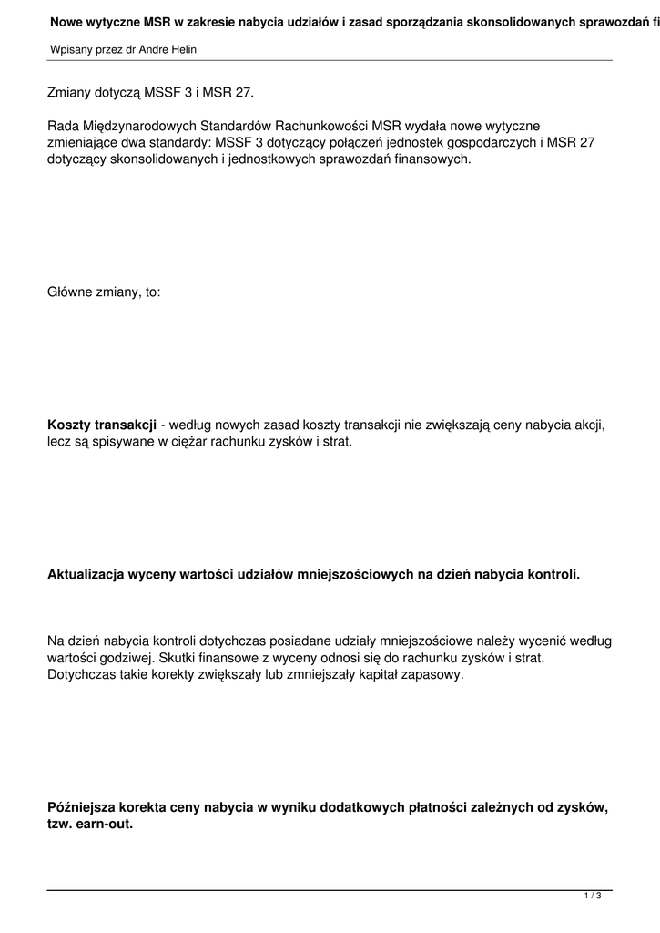 Nowe wytyczne MSR w zakresie nabycia udziałów i zasad sporządzania skonsolidowanych sprawozdań fi Wpisany przez dr Andre Helin Zmiany dotyczą MSSF 3 i MSR 27. Rada Międzynarodowych Standardów Rachunkowości MSR wydała nowe wytyczne zmieniające dwa standardy: MSSF 3 dotyczący połączeń jednostek gospodarczych i MSR 27 dotyczący skonsolidowanych i jednostkowych sprawozdań finansowych. Główne zmiany, to: Koszty transakcji - według nowych zasad koszty transakcji nie zwiększają ceny nabycia akcji, lecz są spisywane w ciężar rachunku zysków i strat. Aktualizacja wyceny wartości udziałów mniejszościowych na dzień nabycia kontroli. Na dzień nabycia kontroli dotychczas posiadane udziały mniejszościowe należy wycenić według wartości godziwej. Skutki finansowe z wyceny odnosi się do rachunku zysków i strat. Dotychczas takie korekty zwiększały lub zmniejszały kapitał zapasowy. Późniejsza korekta ceny nabycia w wyniku dodatkowych płatności zależnych od zysków, tzw. earn-out. 1/3 Nowe wytyczne MSR w zakresie nabycia udziałów i zasad sporządzania skonsolidowanych sprawozdań fin Wpisany przez dr Andre Helin W praktyce cena nabycia akcji jest często uwarunkowana osiągnięciem określonego poziomu dochodów przez nabytą spółkę. W takiej sytuacji standard wymaga, aby jednostka na dzień nabycia akcji oszacowała późniejsze płatności i uwzględniła je w cenie nabycia. Według dotychczasowej praktyki, zmiany w takich szacunkach korygowały wartość firmy z konsolidacji. Według nowych wytycznych późniejsze zmiany w płatnościach dodatkowych nie uwzględnionych w pierwotnej cenie nabycia nie korygują wartości firmy, lecz są elementem kosztów lub przychodów. Pełna wartość firmy. W przypadku nabycia udziałów standard dopuszcza (ale nie wymaga), aby w bilansie skonsolidowanym ujęta została wartość firmy, jaka przypada na udziały mniejszościowe. Dotychczas MSR-y nie dopuszczały takiej możliwości. Ujęcie pełnej wartości firmy zwiększa kapitał własny grupy kapitałowej, ale może też oznaczać w przyszłości wyższe koszty w przypadku, kiedy zaistnieje obowiązek odpisu wartości firmy. Ponadto wszelkie nadwyżki pomiędzy ceną nabycia akcji a aktualną wartością księgową udziałów mniejszościowych obciążają według nowych zasad kapitał własny akcjonariuszy większościowych. Obciążenia te mogą być znaczne, zwłaszcza w sytuacji, kiedy grupa kapitałowa nie rozpoznawała dotychczas wartości firmy z konsolidacji, jaka przypadała na udziały mniejszościowe. Sprzedaż udziałów mniejszościowych osobie trzeciej. Nowy MSR 27 wymaga, aby skutki finansowe ze sprzedaży udziałów mniejszościowych w całości były odnoszone na kapitał własny grupy kapitałowej. 2/3 Nowe wytyczne MSR w zakresie nabycia udziałów i zasad sporządzania skonsolidowanych sprawozdań fin Wpisany przez dr Andre Helin Według wcześniejszej praktyki większość jednostek, które sprzedały część jednostki zależnej, ujmowała zysk lub stratę w rachunku zysków i strat. W przypadku sprzedaży udziałów (części lub całości) i utraty kontroli, skutki finansowe transakcji należy odnieść tak jak dotychczas, do rachunku zysków i strat. 3/3