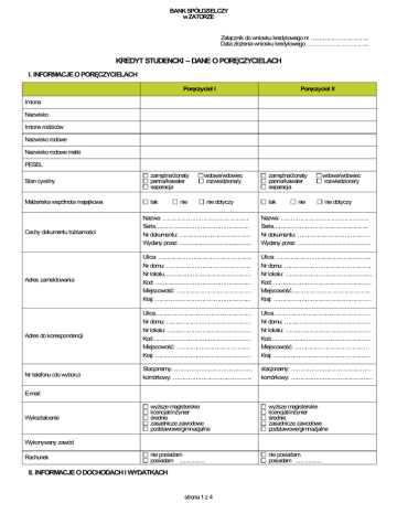 BANK SPÓŁDZIELCZY w ZATORZE Załącznik do wniosku kredytowego nr ….……………………….. Data złożenia wniosku kredytowego …………………………….. KREDYT STUDENCKI – DANE O PORĘCZYCIELACH I. INFORMACJE O PORĘCZYCIELACH Poręczyciel I Poręczyciel II Imiona Nazwisko Imiona rodziców Nazwisko rodowe Nazwisko rodowe matki PESEL Stan cywilny zamężna/żonaty panna/kawaler separacja Małżeńska wspólnota majątkowa tak wdowa/wdowiec rozwiedziona/y nie nie dotyczy zamężna/żonaty panna/kawaler separacja tak nie wdowa/wdowiec rozwiedziona/y nie dotyczy Cechy dokumentu tożsamości Nazwa: …………………………………………. Seria…………………………………………….. Nr dokumentu: ……………….………………… Wydany przez: ................................................ Nazwa: ………………………….………………. Seria…………………………….……………….. Nr dokumentu: …………….…….……………… Wydany przez: ................................................. Adres zameldowania Ulica: ………………………….…………………. Nr domu: ………………….…………………….. Nr lokalu………………….……………………… Kod: ……………………………………………... Miejscowość: …………………….……………… Kraj: ……………………………………………... Ulica: ……………………………………………... Nr domu: …………………………………………. Nr lokalu: …………………….…………………… Kod: …………………………….………………… Miejscowość………………….………………….. Kraj: ………………………….…………………… Adres do korespondencji Ulica……...………………………….…………… Nr domu: ……...………………………………… Nr lokalu: ……...……………...………………… Kod……...………….……….…………………… Miejscowość: ……...…………………………… Kraj: ……...……………………………………… Ulica……...…………………….….……………… Nr domu: ……...…………………….…………… Nr lokalu: ……...…………….…………………… Kod……...………..…………….………………… Miejscowość: …………....……………………… Kraj: ……...…………….………………………… Nr telefonu (do wyboru) Stacjonarny…………………………….………… komórkowy: ………………………….………….. stacjonarny: ……………………………………… komórkowy: ……………………….……………… E-mail: Wykształcenie wyższe magisterskie licencjat/inżynier średnie zasadnicze zawodowe podstawowe/gimnazjalne wyższe magisterskie licencjat/inżynier średnie zasadnicze zawodowe podstawowe/gimnazjalne nie posiadam posiadam ................. nie posiadam posiadam ................. Wykonywany zawód Rachunek II. INFORMACJE O DOCHODACH I WYDATKACH strona 1 z 4 Poręczyciel I Poręczyciel II Całkowity staż pracy Okres zatrudnienia u obecnego pracodawcy/czas prowadzenia obecnej dział. gospodarczej Informacje o pracodawcy (nazwa, adres) właściciel firmy wyższa kadra zarządzająca średnia kadra zarządzająca urzędnik specjalista pracownik inne Stanowisko Miesięczny dochód netto (śr. z ost. 3 m-cy): ..................................... PLN, w tym: umowa o pracę: .................................... emerytura: ............................................ renta: .................................................... zasiłek przedemerytalny: ...................... wolne zawody: ...................................... działalność gospodarcza: ..................... działalność rolnicza: ............................. umowa cywilno-prawna: ....................... umowa najmu: ...................................... umowa o pracę na czas określony do…….................: ............................... inne: ...................................................... Źródła dochodu właściciel firmy wyższa kadra zarządzająca średnia kadra zarządzająca urzędnik specjalista pracownik inne ..................................... PLN, w tym: umowa o pracę: ........................................ emerytura: ................................................ renta: ........................................................ zasiłek przedemerytalny: .......................... wolne zawody: .......................................... działalność gospodarcza: ......................... działalność rolnicza: ................................. umowa cywilno-prawna: ........................... umowa najmu: .......................................... umowa o pracę na czas określony do…….................: ................................... inne: ......................................................... Ilość osób w gosp. (w tym dzieci) Ilość osób w gosp. dom. poza Wnioskodawcami uzyskujących udokumentowany dochód: pomiędzy 400 a 1000 PLN: …….. os. powyżej 1000 PLN: …………. os. pomiędzy 400 a 1000 PLN: …….. os. powyżej 1000 PLN: …………. os. Wydatki stałe gosp. domowego, w tym wydatki na pokrycie kosztów zamieszkania, zróżnicowane w zależności od statusu mieszkaniowego Poręczyciel I i Poręczyciel II należą do tego samego gospodarstwa domowego III. INFORMACJE O ZOBOWIAZANIACH Zobowiązania Kwota zobowiązania** Kwota pozostała do spłaty** Rata miesięczna** Bank Poręczyciel limit ROR I II limit ROR I II limit karty kredytowej I II limit karty kredytowej I II kredyt …………… I II kredyt …………… I II kredyt …………… I II kredyt ………….. Poręczenie / przystąpienie do długu* Poręczenie / przystąpienie do długu* Inne (np. alime