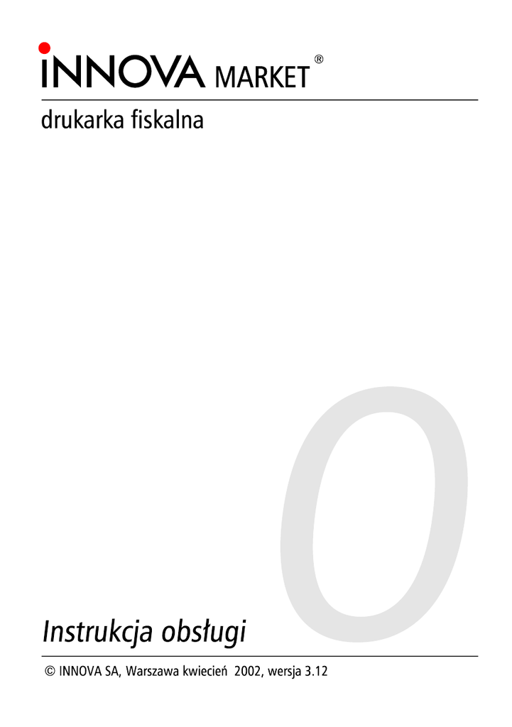 ® INNOVA S. A., ul. Ł opuszań ska 117/123, 02-474 Warszawa, tel.: (022) 863 14 03, 863 14 04, fax.: (022) 863 14 05 http: www.innova-sa.pl, e-mail: [email protected] Warszawa kwiecień 2002, wersja 3.12 Uwagi dotyczą ce formy instrukcji, informacje o zauważonych błę dach proszę kierować na adres [email protected]. Instrukcje opracował: Wojciech Szyfelbein Okładkę zaprojektował: Daniel Zieliń ski Korektę przeprowadziła: Marta Michalska 1. Kompletacja 3 2. Drukarki fiskalne 4 2.1. 2.2. Założenia ogó lne Tryby pracy drukarek 4 6 3. Instalacja drukarki 8 3.1. 3.2. Sposó b podłą czenia drukarki Uwagi do instalacji drukarki 8 10 4. Budowa drukarki 11 5. Znaczenie diod konsolki drukarki 12 6. Wł ączanie, wył ączanie drukarki i przewijanie papieru 13 7. Wymiana papieru 15 7.1. 7.2. Wymiana papieru oryginału Wymiana papieru kopii 16 21 8. Menu operatora drukarki 8.1. 8.2. Zasady poruszania się po menu. Zasady ustawiania wartości przy konfiguracji i realizacji wydrukó w 8.2.1. 8.2.2. 8.2.3. Zasady ustawiania dat i godzin Zasady ustawiania wartości typu „jedna z… ” Zasady ustawiania wartości liczbowych 9. Konfiguracja 9.1. 9.2. 9.3. 9.4. Zmiana trybu zapisu stawek PTU Zmiana czułości papieru Ustawienie trybu oszczę dnego wydruku Ustawienie zegara RTC 30 31 32 32 33 33 35 35 36 37 38 10. Testy drukarki 41 11. Raporty 42 1 11.1. 11.2. 11.3. 11.4. 11.5. 11.6. Raport dobowy Raport okresowy Raport miesię czny Raport informacyjny Raport napisó w stałych z ROM Raport rozliczeniowy 12. Fiskalizacja 42 45 51 53 54 55 56 13. Wykaz komunikató w i bł ędó w sygnalizowanych przez drukarkę 59 13.1. Błę dy wywołane analizą sekwencji 13.2. Komunikaty informacyjne i błę dy wywołane złą pracą podzespołó w sygnalizowane na wyświetlaczu obsługi 13.3. Komunikaty sygnalizowane za pomocą diod konsolki 14. Zał ączniki 14.1. Uwagi dotyczą ce bezpieczeń stwa użytkowania drukarki fiskalnej INNOVA MARKET z zasilaczem zewnę trznym 10,5V 1,5A. 14.2. Wzó r legitymacji serwisanta 14.3. Dane techniczne – opis konstrukcji 2 60 68 78 80 80 81 82 Lp. 1 2 3 4 5 6 7 8 9 Element kompletacji Drukarka INNOVA MARKET Zasilacz impulsowy 10,5V 1,5 A Kabel komunikacyjny INNOVA-RS/1/270 Termiczna rolka kasowa Instrukcja obsługi drukarki INNOVA MARKET Ksią żka kasy rejestrują cej Karta gwarancyjna Zawiadomienie podatnika o miejscu instalacji kasy rejestrują cej Zawiadomienie serwisu o miejscu instalacji kasy rejestrują cej Iloś ć 1 1 1 2 1 1 1 1 1 3 2.1. Zał ożenia ogó lne Drukarki fiskalne są przeznaczone do ewidencji obrotu i kwot podatku w komputerowych systemach sprzedaży. Drukarka fiskalna jako produkt jest adresowana przede wszystkim do użytkownikó w, któ rzy posiadają komputer klasy PC oraz wykorzystują w swoim sklepie (hurtowni) oprogramowanie realizują ce sprzedaż. Urzą dzenie jest tak pomyślane, że jego podłą czenie do istnieją cego systemu sprzedaży jest proste zaró wno pod wzglę dem sprzę towym jak i programowym. Drukarka INNOVA MARKET została dopuszczona do obrotu decyzją Ministerstwa Finansó w: Drukarka ta spełnia wszystkie wymagania określone w rozporzą dzeniu Ministerstwa Finansó w z dnia 23 grudnia 1999 roku. Oprogramowanie drukarki zapewnia wszystkie wymagane funkcje niezbę dne w kasach fiskalnych, a w szczegó lności zapewnia poprawną rejestrację sprzedaży. Drukowanie paragonu fiskalnego oraz elektroniczna rejestracja obrotu są operacjami NIEPODZIELNYMI. Drukarka samodzielnie formatuje paragon fiskalny oraz nalicza podatek PTU na podstawie danych o transakcjach przesłanych z systemu. Ponadto dokonuje kontroli formalnych i obliczeniowych danych transakcji przesyłanych z systemu wykrywają c szereg sytuacji błę dnych, w szczegó lności realizują c algorytm badania poprawności przywią zania kodu stawki PTU do nazwy towaru. Przy tym realizuje także drukowanie raportu dobowego i okresowego. Drukarka jest wyposażona w interfejs szeregowy RS232C. Program aplikacyjny może przygotować sam użytkownik. W najprostszych sytuacjach (niewielka sprzedaż, brak niezależnej komputerowej ewidencji sprzedaży i towaró w) wystarczy tylko transmisja danych z komputera do drukarki. Komunikacja z drukarką jest komunikacją znakową (tzn. dane przesyłane do drukarki stanowią zawsze cią g znakó w ASCII, co dotyczy też danych liczbowych). Drukarki realizują własny zestaw rozkazó w / sekwencji sterują cych (posiadają własny ję zyk programowania). Jest to najistotniejsza cecha urzą dzenia. Mó wią c obrazowo, jeżeli wyślemy do zwykłej (niefiskalnej) drukarki kod litery „A” to znak ten zostanie wydrukowany. W przypadku drukarek fiskalnych kod ten (jeżeli nie stanowi istotnego elementu sekwencji sterują cej) zostanie zignorowany. W tym przypadku nazwa „drukarka fiskalna” może być 4 nieco mylą ca (należałoby raczej używać nazwy np. „rejestrator transakcyjny”). Nie ma zatem dowolności danych przesyłanych do drukarki, muszą one spełniać formalne (syntaktyczne) reguły ję zyka programowania drukarki. Nie można też uzyskać dowolnych formató w wydruku. Zestaw możliwych do uzyskania rodzajó w wydruku jest ściśle określony przez oprogramowanie drukarki i obejmuje nastę pują ce wydruki fiskalne: • paragon fiskalny, • raport dobowy, • raport okresowy, • raport miesię czny, • raport rozliczeniowy oraz kilka dokumentó w niefiskalnych o ściśle określonych formatach wynikają cych z przeznaczenia i instrukcji Ministerstwa Finansó w. Ję zyk programowania drukarki obejmuje kilkanaście sekwencji sterują cych. Do zrealizowania najprostszej sprzedaży wystarczy wykorzystać podzbió r złożony z zaledwie sześciu sekwencji sterują cych: nastawianie / korekta zegara czasu rzeczywistego (sekwencja LBSETCK) oraz sekwencje powodują ce realizację transakcji (LBTRSHDR, LBTRSLN, LBDSP, LBTREXIT, LBTRXEND i LBTRXEND1). Tak prostą aplikację może praktycznie stworzyć nawet nie