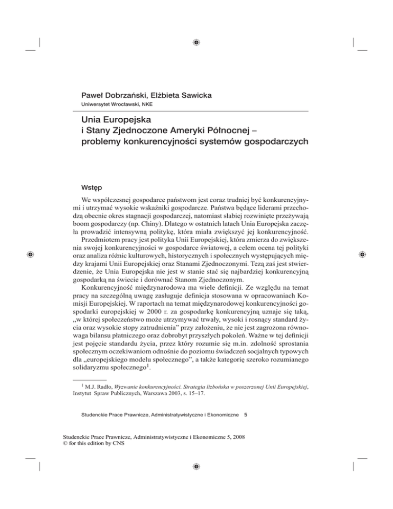 Pawe³ Dobrzañski, El¿bieta Sawicka Uniwersytet Wroc³awski, NKE Unia Europejska i Stany Zjednoczone Ameryki Pó³nocnej – problemy konkurencyjnoœci systemów gospodarczych Wstêp We współczesnej gospodarce państwom jest coraz trudniej być konkurencyjnymi i utrzymać wysokie wskaźniki gospodarcze. Państwa będące liderami przechodzą obecnie okres stagnacji gospodarczej, natomiast słabiej rozwinięte przeżywają boom gospodarczy (np. Chiny). Dlatego w ostatnich latach Unia Europejska zaczęła prowadzić intensywną politykę, która miała zwiększyć jej konkurencyjność. Przedmiotem pracy jest polityka Unii Europejskiej, która zmierza do zwiększenia swojej konkurencyjności w gospodarce światowej, a celem ocena tej polityki oraz analiza różnic kulturowych, historycznych i społecznych występujących między krajami Unii Europejskiej oraz Stanami Zjednoczonymi. Tezą zaś jest stwierdzenie, że Unia Europejska nie jest w stanie stać się najbardziej konkurencyjną gospodarką na świecie i dorównać Stanom Zjednoczonym. Konkurencyjność międzynarodowa ma wiele definicji. Ze względu na temat pracy na szczególną uwagę zasługuje definicja stosowana w opracowaniach Komisji Europejskiej. W raportach na temat międzynarodowej konkurencyjności gospodarki europejskiej w 2000 r. za gospodarkę konkurencyjną uznaje się taką, „w której społeczeństwo może utrzymywać trwały, wysoki i rosnący standard życia oraz wysokie stopy zatrudnienia” przy założeniu, że nie jest zagrożona równowaga bilansu płatniczego oraz dobrobyt przyszłych pokoleń. Ważne w tej definicji jest pojęcie standardu życia, przez który rozumie się m.in. zdolność sprostania społecznym oczekiwaniom odnośnie do poziomu świadczeń socjalnych typowych dla „europejskiego modelu społecznego”, a także kategorię szeroko rozumianego solidaryzmu społecznego1. 1 M.J. Radło, Wyzwanie konkurencyjności. Strategia lizbońska w poszerzonej Unii Europejskiej, Instytut Spraw Publicznych, Warszawa 2003, s. 15–17. Studenckie Prace Prawnicze, Administratywistyczne i Ekonomiczne 5 Studenckie Prace Prawnicze, Administratywistyczne i Ekonomiczne 5, 2008 © for this edition by CNS 108 | PAWEŁ DOBRZAŃSKI, ELŻBIETA SAWICKA W drugiej połowie lat 90. XX w. wystąpiły niekorzystne zmiany w rozwoju gospodarczym państw Unii Europejskiej (szczególnie w porównaniu ze Stanami Zjednoczonymi), co spowodowało konieczność przeanalizowania podstaw gospodarki unijnej. Wprawdzie sytuacja społeczna i gospodarcza w Unii była dobra, ale pojawiły się problemy wynikające z: – globalizacji, – rosnącej konkurencyjności gospodarek światowych, – barier strukturalnych dla wzrostu gospodarczego, – spowolnienia tempa wzrostu gospodarczego, – wysokiego poziomu bezrobocia2. Pilną sprawą stały się reformy, których przeprowadzenie mogło zmniejszyć negatywne skutki tych problemów dla Unii Europejskiej. Lata 90. XX w. ujawniły pewne słabości Unii Europejskiej. W 2000 r. wzrost gospodarczy wynosił w UE ok. 3%, inflacja – 1,5%, deficyt –1,7% PKB. Pogorszył się udział UE w światowym handlu towarami, ale jednocześnie wzrósł jej udział w światowym eksporcie usług. Niepokój budziło porównanie wskaźników ekonomicznych Unii Europejskiej i Stanów Zjednoczonych. Zwłaszcza groźna była 1% różnica w poziomie tempa rozwoju rocznego (w UE – 2,3%, w USA – 3,3%), która zdecydowała o podjęciu działań na rzecz przyspieszenia wzrostu gospodarczego. Porównanie wskaźników gospodarczych dla USA i UE przedstawiają tab. 1–33. Z tabel tych wynika, że w 2000 r. luka między Stanami Zjednoczonymi a Unią Europejską była znaczna. Najbardziej uwidaczniało się to w poziomie PKB per capita: wskaźnik ten w UE wynosił 70,1% PKB Stanów Zjednoczonych. Również wydajność pracy na zatrudnionego i na czas pracy była znacznie niższa w krajach Unii. Wskaźniki dotyczące zasobów ludzkich, takie jak procent populacji w wieku produkcyjnym i stopa zatrudnienia, były gorsze w UE. W Stanach Zjednoczonych ponad trzy czwarte populacji było w wieku produkcyjnym, a w Unii Europejskiej tylko dwie trzecie. Ponadto stopa zatrudnienia w Unii była niższa o 11%, a średni czas pracy na zatrudnionego był mniejszy o 229 godzin w porównaniu ze Stanami Zjednoczonymi. W Stanach Zjednoczonych większy procent populacji w wieku produkcyjnym miał wyższe wykształcenie, mimo że edukacja na tym szczeblu jest płatna. Różnice między Unią a Stanami Zjednoczonymi są również widoczne w strukturze i wielkości wydatków publicznych. Wydatki te są znacznie niższe w Stanach Zjednoczonych i wynoszą tylko 33,62% PKB, natomiast w UE ponad jedną trzecią więcej. Kraje UE zdecydowanie więcej wydają na konsumpcję pu- 2 K. Włodarczyk-Śpiewak (red.), Strategia lizbońska – fakty – mity – rzeczywistość, Katedra Mikroekonomii US, Szczecin 2005, s. 12. 3 Ibidem, s. 13. Studenckie Prace Prawnicze, Administratywistyczne i Ekonomiczne 5, 2008 © for this edition by CNS PROBLEMY KONKURENCYJNOŚCI SYSTEMÓW GOSPODARCZYCH | 109 Tabela 1. Luka między UE i USA i jej wymiary w 2000 r. USA UE PKB per capita 100 70,1 Wydajność na zatrudnionego 100 83,9 Wydajność na czas pracy 100 88,8 Źródło: K. Włodarczyk-Śpiewak (red.), Strategia lizbońska – fakty – mity – rzeczywistość, Katedra Mikroekonomii US, Szczecin 2005, s. 17. Tabela 2. Zasoby ludzkie i ich wykorzystanie w UE i USA w 2000 r. Wyszczególnienie USA UE Populacja w wieku produkcyjnym 77,2% jako % populacji ogółem 66,7% Stopa zatrudnienia 75,0% 64,0% Średni czas pracy (w godz. na zatrudnionego) 1835 1606 Osoby z wyższym wykształceniem (jako % populacji w wieku prod.) 37% 21% Źródło: K. Włodarczyk-Śpiewak (red.), op. cit., s. 17. Tabela 3. Struktura wydatków publicznych w UE i USA (% PKB, 2000 r.) Konsumpcja Inwestycje publiczna publiczne UE USA 19,9 4,57 Subsydia Transfery Ogółem dochodowe 2,54 1,4