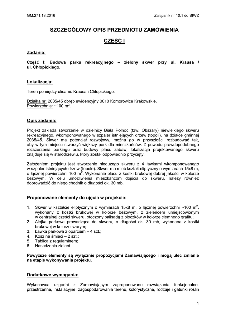 Załącznik nr 10.1 do SIWZ GM.271.18.2016 SZCZEGÓŁOWY OPIS PRZEDMIOTU ZAMÓWIENIA CZĘŚĆ I Zadanie: Część I: Budowa parku rekreacyjnego – zielony skwer przy ul. Krausa / ul. Chłopickiego. Lokalizacja: Teren pomiędzy ulicami: Krausa i Chłopickiego. Działka nr: 2035/45 obręb ewidencyjny 0010 Komorowice Krakowskie. Powierzchnia: ~100 m2. Opis zadania: Projekt zakłada stworzenie w dzielnicy Biała Północ (tzw. Obszary) niewielkiego skweru rekreacyjnego, wkomponowanego w szpaler istniejących drzew (topoli), na działce gminnej 2035/45. Skwer ma potencjał rozwojowy, można go w przyszłości rozbudować tak, aby w tym miejscu stworzyć większy park dla mieszkańców. Z powodu prawdopodobnego rozszerzenia parkingu oraz budowy placu zabaw, lokalizacja projektowanego skweru znajduje się w starodrzewiu, który został odpowiednio przycięty. Założeniem projektu jest stworzenie niedużego skweru z 4 ławkami wkomponowanego w szpaler istniejących drzew (topole). Skwer ma mieć kształt eliptyczny o wymiarach 15x8 m, o łącznej powierzchni 100 m2. Wykonanie placu z kostki brukowej dobrej jakości w kolorze beżowym. W celu umożliwienia mieszkańcom dojścia do skweru, należy również doprowadzić do niego chodnik o długości ok. 30 mb. Proponowane elementy do ujęcia w projekcie: 1. 2. 3. 4. 5. 6. Skwer w kształcie eliptycznym o wymiarach 15x8 m, o łącznej powierzchni ~100 m2, wykonany z kostki brukowej w kolorze beżowym, z zieleńcem umiejscowionym w centralnej części skweru, otoczony palisadą z bloczków w kolorze ciemnego grafitu; Alejka parkowa prowadząca do skweru, o długości ok. 30 mb, wykonana z kostki brukowej w kolorze szarym; Ławka parkowa z oparciem – 4 szt.; Kosz na śmieci – 2 szt.; Tablica z regulaminem; Nasadzenia zieleni. Powyższe elementy są wyłącznie propozycjami Zamawiającego i mogą ulec zmianie na etapie wykonywania projektu. Dodatkowe wymagania: Wykonawca uzgodni z Zamawiającym zaproponowane rozwiązania funkcjonalnoprzestrzenne, instalacyjne, zagospodarowania terenu, kolorystyczne, rodzaje i gatunki roślin 1 GM.271.18.2016 Załącznik nr 10.1 do SIWZ zaproponowanych do nasadzenia oraz uzyska jego akceptację w zakresie przyjętych rozwiązań. Dodatkowe załączniki: 1. Mapa poglądowa – zał. nr 10.1a; 2. Koncepcja – załączniki do projektu zgłoszonego w ramach Budżetu Obywatelskiego na 2016 rok, na podstawie którego będzie realizowana nin. Część zamówienia – zał. nr 10.1b. Legenda dotycząca rysunków parku rekreacyjnego (w załączniku nr 10.1b): Rys. 1: 1. Istniejące topole, 2. Palisada z bloczków kolor ciemny grafit, 3. Ławki kute osadzone na fundamencie, 4. Powierzchnia skweru, bruk bezowy, 5. Kosz na śmieci. Rys. 2: 1. Berberys Erecta, 2. Świerk kłujący, 3. Tawuła japońska, 4. Berberys wąskolistny, 5. Różanecznik, 6. Cyprysik groszkowy. 2
