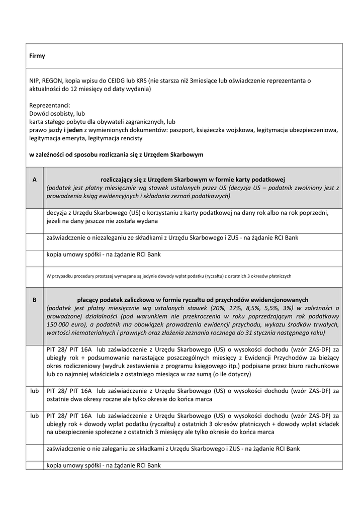 Firmy NIP, REGON, kopia wpisu do CEIDG lub KRS (nie starsza niż 3miesiące lub oświadczenie reprezentanta o aktualności do 12 miesięcy od daty wydania) Reprezentanci: Dowód osobisty, lub karta stałego pobytu dla obywateli zagranicznych, lub prawo jazdy i jeden z wymienionych dokumentów: paszport, książeczka wojskowa, legitymacja ubezpieczeniowa, legitymacja emeryta, legitymacja rencisty w zależności od sposobu rozliczania się z Urzędem Skarbowym A rozliczający się z Urzędem Skarbowym w formie karty podatkowej (podatek jest płatny miesięcznie wg stawek ustalonych przez US (decyzja US – podatnik zwolniony jest z prowadzenia ksiąg ewidencyjnych i składania zeznań podatkowych) decyzja z Urzędu Skarbowego (US) o korzystaniu z karty podatkowej na dany rok albo na rok poprzedni, jeżeli na dany jeszcze nie została wydana zaświadczenie o niezaleganiu ze składkami z Urzędu Skarbowego i ZUS - na żądanie RCI Bank kopia umowy spółki - na żądanie RCI Bank W przypadku procedury prostszej wymagane są jedynie dowody wpłat podatku (ryczałtu) z ostatnich 3 okresów płatniczych B płacący podatek zaliczkowo w formie ryczałtu od przychodów ewidencjonowanych (podatek jest płatny miesięcznie wg ustalonych stawek (20%, 17%, 8,5%, 5,5%, 3%) w zależności o prowadzonej działalności (pod warunkiem nie przekroczenia w roku poprzedzającym rok podatkowy 150 000 euro), a podatnik ma obowiązek prowadzenia ewidencji przychodu, wykazu środków trwałych, wartości niematerialnych i prawnych oraz złożenia zeznania rocznego do 31 stycznia następnego roku) PIT 28/ PIT 16A lub zaświadczenie z Urzędu Skarbowego (US) o wysokości dochodu (wzór ZAS-DF) za ubiegły rok + podsumowanie narastające poszczególnych miesięcy z Ewidencji Przychodów za bieżący okres rozliczeniowy (wydruk zestawienia z programu księgowego itp.) podpisane przez biuro rachunkowe lub co najmniej właściciela z ostatniego miesiąca w raz sumą (o ile dotyczy) lub PIT 28/ PIT 16A lub zaświadczenie z Urzędu Skarbowego (US) o wysokości dochodu (wzór ZAS-DF) za ostatnie dwa okresy roczne ale tylko okresie do końca marca lub PIT 28/ PIT 16A lub zaświadczenie z Urzędu Skarbowego (US) o wysokości dochodu (wzór ZAS-DF) za ubiegły rok + dowody wpłat podatku (ryczałtu) z ostatnich 3 okresów płatniczych + dowody wpłat składek na ubezpieczenie społeczne z ostatnich 3 miesięcy ale tylko okresie do końca marca zaświadczenie o nie zaleganiu ze składkami z Urzędu Skarbowego i ZUS - na żądanie RCI Bank kopia umowy spółki - na żądanie RCI Bank W przypadku procedury prostszej wymagane są jedynie dowody wpłat podatku (ryczałtu) z ostatnich 3 okresów płatniczych C płacący podatek na zasadach ogólnych (prowadzących podatkową książkę przychodów i rozchodów, obowiązani do złożenia zeznania rocznego do 30 kwietnia następnego roku) PIT 36 lub PIT 36L lub PIT 40 lub PIT B za rok ubiegły z potwierdzeniem złożenia (nadania) do US (warunek przyjęcia: w okresie nie dłuższym niż do końca maja oraz deklaracja musi być podpisana (*wyjątek stanowią deklaracje wysłane elektronicznie - te mają elektroniczny dowód przekazania do US wymagany przez Bank), jako potwierdzenie złożenia deklaracji dopuszczalne jest przedstawienie zapłaty należnego podatku lub zwrot z nadpłaconego + kopia książki przychodów i rozchodów (wydruk zestawienia z programu księgowego itp.) podpisane przez biuro rachunkowe lub co najmniej właściciela z ostatniego miesiąca w raz sumą (narastająco w roku bieżącym) lub Zaświadczenie z Urzędu Skarbowego (US) o wysokości dochodu (wzór ZAS-DF) za ubiegły rok (warunek przyjęcia: w okresie nie dłuższym niż do końca maja oraz deklaracja musi być podpisana (*wyjątek stanowią deklaracje wysłane elektronicznie - te mają elektroniczny dowód przekazania do US wymagany przez Bank) , jako potwierdzenie złożenia deklaracji dopuszczalne jest przedstawienie zapłaty należnego podatku lub zwrot z nadpłaconego + kopia książki przychodów i rozchodów (wydruk zestawienia z programu księgowego itp.) podpisane przez biuro rachunkowe lub co najmniej właściciela z ostatniego miesiąca w raz sumą (narastająco w roku bieżącym) Uwaga. W okresie od początku stycznia do końca marca PIT za ostatnie dwa okresy roczne np. mamy luty 2012 to możliwe jest przedstawienie PIT za 2010 oraz 2011 (podpisane (* wyjątek jw.) z dowodem nadania / złożenia do US) zaświadczenie o nie zaleganiu ze składkami z Urzędu Skarbowego i ZUS - na żądanie RCI Bank dowody wpłat składek na ubezpieczenie społeczne z ostatnich 3 miesięcy - na żądanie RCI Bank kopia umowy spółki - na żądanie RCI Bank W przypadku procedury prostszej wymagana jest jedynie kopia książki przychodów i rozchodów (wydruk zestawienia z programu księgowego itp.) podpisane przez biuro rachunkowe lub co najmniej właściciela z ostatniego miesiąca w raz sumą (narastająco w roku bieżącym) D płacący podatek dochodowy od osób prawnych – pełna księgowość (księgi handlowe) CIT 8 (warunek przyjęcia: w okresie nie dłuższym niż do końca maja (deklaracje składa się do końca marca) oraz deklaracja musi być podpisana) + bilans oraz rzis za rok bieżący lub CIT 8 (warunek przyjęcia: w okresie nie dłuższym niż do końca maja (deklaracje składa się do końca marca) oraz deklaracja musi być podpisana) + F01 za ostatni kwartał (podpisany) lub bilans oraz rachunek zysków i strat za ostatni rok (może być porównawczy z latami poprzednimi) podpisany + bilans oraz rzis za rok bieżący lub bilans oraz rachunek zysków i strat za ostatni rok (może być porównawczy z latami poprzednimi) podpisany + F01 za ostatni kwartał (podpisany) zaświadczenie o nie zaleganiu ze składkami z Urzędu Skarbowego i ZUS - na żądanie RCI Bank dowody wpłat składek na ubezpieczenie społeczne z ostatnich 3 miesięcy - na żądanie RCI Bank kopia umowy spółki - na żądan