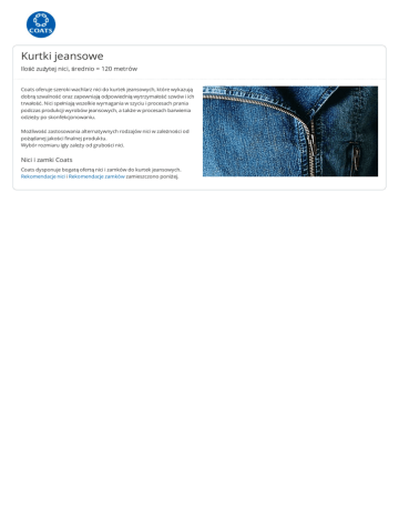 Kurtki jeansowe Ilość zużytej nici, średnio = 120 metrów Coats oferuje szeroki wachlarz nici do kurtek jeansowych, które wykazują dobrą szwalność oraz zapewniają odpowiednią wytrzymałość szwów i ich trwałość. Nici spełniają wszelkie wymagania w szyciu i procesach prania podczas produkcji wyrobów jeansowych, a także w procesach barwienia odzieży po skonfekcjonowaniu. Możliwość zastosowania alternatywnych rodzajów nici w zależności od pożądanej jakości finalnej produktu. Wybór rozmiaru igły zależy od grubości nici. Nici i zamki Coats Coats dysponuje bogatą ofertą nici i zamków do kurtek jeansowych. Rekomendacje nici i Rekomendacje zamków zamieszczono poniżej. 1 2 3 4 Numer ściegu Rodzaj ściegu Produkt 301 Ścieg stębnowy dwunitkowy (301) Dual Duty Więcej 301x2 Ścieg stębnowy czteronitkowy, dwuigłowy (301x2) Dual Duty Więcej Dual Duty Więcej Dual Duty Więcej Dual Duty Więcej Dual Duty Więcej 504 516 Ścieg trzynitkowy overlokowy (504) Scieg piecionitkowy overlokowy, obrzucanie trzema nitkami + lancuszek 5 304-5 Ścieg stębnowy, ozdobny prostokątny (301) 6 404 Uszycie dziurki (404) Premium Tkaniny Pranie zwykłe Nici przemysłowe Coats dostępne są w szerokiej gamie rodzajów włókien i wykończeń, z których każdy opracowany jest pod kątem konkretnych potrzeb naszych klientów. Zapraszamy do zapoznania się z naszą bogatą ofertą poniżej. W przypadku dostępności innych opcji, proszę wybrać odpowiednią opcję z listy. Wygląd szwu Numer ściegu Rodzaj ściegu Ścieg stębnowy dwunitkowy (301) Ścieg stębnowy czteronitkowy, dwuigłowy (301x2) Ścieg trzynitkowy overlokowy (504) Scieg piecionitkowy overlokowy, obrzucanie trzema nitkami + lancuszek Ścieg stębnowy, ozdobny prostokątny (301) 1 2 3 4 5 Uszycie dziurki (404) 6 Gęstość ściegu (na 3cm) Górna nitka Grubość igły Nm Dolna nitka Produkt Tex Tkt Produkt Tex Tkt 301 10 - 12 Dual Duty 40 75 Dual Duty 40 75 90 - 110 301x2 10 - 12 Dual Duty 80 36 Dual Duty 60 50 110 - 125 504 10 - 12 Dual Duty 40 75 Dual Duty 24 120 90 - 110 516 10 - 12 Dual Duty 60 50 Dual Duty 40 75 100 - 110 304-5 - Dual Duty 60 50 Dual Duty 40 75 100 - 110 404 - Dual Duty 80 36 Dual Duty 60 50 110 - 125 Key: Nierozdzielczy = Nierozdzielczy; Rozdzielczy = Rozdzielczy; Dwustronnie rozdzielczy = Dwustronnie rozdzielczy; Dwustronnie nierozdzielczy = Dwustronnie nierozdzielczy; X-Forma / O-Forma Opti M Zastosowanie Opcje specjalne Odpinana podszewka Kieszenie Opti S Opcje specjalne Opti LUX Opcje specjalne Opcje specjalne M60 OE Taśma bawełniana RT10 OE - S60 OE - - - M40 OE Taśma bawełniana - - S40 OE - - - M80 2W Taśma bawełniana RT10 2W Reversed S60 2W Reversed, Odblaskowy, Contrast LUX4 OE - M40 OE Taśma bawełniana RT10 OE Reversed S60 OE Reversed, Odblaskowy, Contrast LUX8 2W - M60 OE Taśma bawełniana - - - - LUX8 OE - M60 2W Taśma bawełniana - - - - LUX6 2W - M80 OE Taśma bawełniana - - - - LUX4 2W - - - - - - - LUX6 OE - - - RT10 OE - S40 OE - - - - - - - S60 OE - - - M40 CE Taśma bawełniana RT10 CE Reversed S60 CE Reversed LUX8 CE - M60 CE Taśma bawełniana, Contrast - - S40 CE Reversed LUX6 CE - M80 CE Taśma bawełniana - - - - LUX4 CE - M80 CE Taśma bawełniana RT10 CE Reversed S60 CE Reversed LUX4 CE - Kołnierz odpinany Zapięcie z przodu Opti RT Rękawy M40 CE M60 CE Taśma bawełniana Taśma bawełniana, Contrast - - - - LUX6 CE - - - - - LUX8 CE - Suwaki Możemy wykonać indywidualną przywieszkę z logo twojej firmy. Fishbone Werra Spree Regus Mosel Fulda Opcje specjalne Informacje dodatkowe Rekomendacje nici do szycia zamieszczone powyżej pełnią funkcję pomocniczą w produkcji odzieży o wysokiej jakości szwach. Ponieważ elementy tego samego rodzaju mogą różnić się surowcem, konstrukcją, oraz metodami produkcji i postprodukcji, rekomendacje te należy traktować jako wstępne wskazówki w wyborze nici. Szczegółowe rekomendacje w wyborze nici i igieł, precyzyjny szacunek zużycia nici oraz wsparcie techniczne można uzyskać kontaktując się z lokalnym oddziałem Coats. Niniejsze zalecenia i dane na temat zużycia stanowią jedynie wskazówki i udzielone są w dobrej wierze, lecz bez gwarancji lub odpowiedzialności ze strony firmy lub jej pracowników.