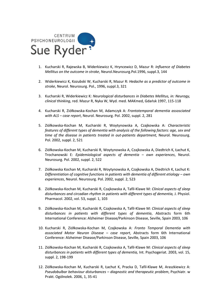 1. Kucharski R, Rajewska B, Widerkiewicz K, Hryncewicz D, Mazur R: Influence of Diabetes Mellitus on the outcome in stroke, Neurol.Neurosurg.Pol.1996, suppl.3, 144 2. Widerkiewicz K, Kozubski W, Kucharski R, Mazur R: Hedache as a predictor of outcome in stroke, Neurol. Neurosurg. Pol., 1996, suppl.3, 321 3. Kucharski R, Widerkiewicz K: Neurological disturbances in Diabetes Mellitus, in: Neurogy, clinical thinking, red. Mazur R, Nyka W, Wyd. med. MAKmed, Gdańsk 1997, 115-118 4. Kucharski R, Ziółkowska-Kochan M, Adamczyk A: Frontotemporal dementia assosciated with ALS – case report, Neurol. Neurosurg. Pol. 2002, suppl. 2, 281 5. Ziółkowska-Kochan M, Kucharski R, Woytynowska A, Czajkowska A: Characteristic features of different types of dementia with analysis of the following factors: age, sex and time of the disease in patients treated in out-patients department, Neurol. Neurosurg. Pol. 2002, suppl. 2, 521 6. Ziółkowska-Kochan M, Kucharski R, Woytynowska A, Czajkowska A, Diedtrich K, Łachut K, Trochanowski E: Epidemiological aspects of dementia – own experiences, Neurol. Neurosurg. Pol. 2002, suppl. 2, 522 7. Ziółkowska Kochan M, Kucharski R, Woytynowska A, Czajkowska A, Diedtrich K, Łachut K: Differentiation of cognitive functions in patients with dementia of different etiology – own experiences, Neurol. Neurosurg. Pol. 2002, suppl. 2, 523 8. Ziółkowska-Kochan M, Kucharski R, Czajkowska A, Tafil-Klawe M: Clinical aspects of sleep disturbances and circadian rhythm in patients with different types of dementia, J. Physiol. Pharmacol. 2002, vol. 53, suppl. 1, 103 9. Ziółkowska-Kochan M, Kucharski R, Czajkowska A, Tafil-Klawe M: Clinical aspects of sleep disturbances in patients with different types of dementia, Abstracts form 6th International Conference: Alzheimer Disease/Parkinson Disease, Seville, Spain 2003, 106 10. Kucharski R, Ziółkowska-Kochan M, Czajkowska A: Fronto Temporal Dementia with associated Motor Neuron Disease – case report, Abstracts form 6th International Conference: Alzheimer Disease/Parkinson Disease, Seville, Spain 2003, 106 11. Ziółkowska-Kochan M, Kucharski R, Czajkowska A, Tafil-Klawe M: Clinical aspects of sleep disturbances in patients with different types of dementia, Int. Psychogeriat. 2003, vol. 15, suppl. 2, 198-199 12. Ziółkowska-Kochan M, Kucharski R, Łachut K, Pracka D, Tafil-Klawe M, Araszkiewicz A: Pseudobulbar behaviour disturbances – diagnostic and therapeutic problem, Psychiatr. w Prakt. Ogólnolek. 2006, 1, 35-41 13. red.Kucharski R, Łachut K: Memory disturbances, Bydgoskie Towarzystwo Opieki Paliatywnej, Bydgoszcz 2006 14. Kucharski R, Ziółkowska-Kochan M, Łachut K: Abbreviated neurological examination – proposal for GP. Part 1. Methodology, Ess. Med. 2007, 2 (38), 4-14 15. Kucharski R, Ziółkowska-Kochan M, Łachut K: Abbreviated neurological examination – proposal for GP. Part 2. Conclusions and diagnosis, Ess. Med. 2007, 3 (39), 12-15 16. Łachut K, Seredyka A, Kucharski R, Ziółkowska-Kochan M: Anxiety disorders in elderly – selected data, Ess. Med. 2007, 4 (40), 27-38 17. Ziółkowska-Kochan M, Furtak J, Sokólska E, Szylberg T, Czajkowska-Malinowska M, Kucharski R, Multiple brain metastases with focus on miliary brain metastases, Neurologica 2007, 2, 2-5 18. Ziółkowska-Kochan M, Kucharski R, Łachut K, Kochan J: Migraine: diagnosis and therapy, Ess. Med. 2007, 5 (41), 5-10 19. Kucharski R, Ziółkowska-Kochan M, Łachut K, Seredyka A: Alzheimer Disease – basic information, Ess. Med. 2007, 5 (41), 29-38 20. Łachut K, Seredyka A, Kucharski R, Ziółkowska-Kochan M: Mood and personality disorders – diagnostic basis, Ess. Med. 2007, 6-7 (42), 13-21 21. Kucharski R, Binek M, Ziółkowska-Kochan M, Łachut K, Seredyka A: Parkinson`s Disease – Basic information, Ess. Med. 2007, 6-7 (42), 43-50 22. Ziółkowska-Kochan M, Kucharski R, Łachut K, Kochan J, Seredyka A: Different, non Alzheimer`s types of dementia (part 1), Ess. Med. 2007, 8 (43), 26-32 23. Ziółkowska-Kochan M, Kucharski R, Łachut K, Seredyka A: Epilepsy – selected data, Ess. Med. 2007, 9 (44), 5-10 24. Ziółkowska-Kochan M, Kucharski R, Łachut K, Kochan J, Seredyka A: Different, non Alzheimer`s types of dementia (part 2), Ess. Med. 2007, 9 (44), 24-28 25. Ziółkowska-Kochan M, Kucharski R, Kochan J, Łachut K, Seredyka A, Pracka D: Nonmigraine headaches, Ess. Med. 2007, 10 (45), 5-10 26. Ziółkowska-Kochan M, Kucharski R, Łachut K, Seredyka A, Pracka D, Kochan J: Movement disturbances, Ess. Med. 2008, 1(46), 27-31 27. red. Kucharski R, Łachut K: Memory disorders – Management In Practice, Stowarzyszenie im. Sue Ryder, Solec Kujawski 2009 28. Rybka J, Kędziora-Kornatowska K, Kędziora J, Kucharski R: Late-life diseases. Not only a medical problem, Med. Rodz., 2009, 4, 78-81 29. Rybka J, Kędziora-Kornatowska K, Kędziora J, Kucharski R: Immunosenescence and latelife depression, Central. Eur. J. Immunol, 2009 (34), 4, 271-275 30. Jochim K, Kucharski R, Woźniak M, Nowak M, Łachut K, Ziółkowska-Kochan M, Motyl D: Cognitive impairment and psychopatological symptoms in Fahr Syndrome – case report, Neuropsychiatria i Neuropsychologia, 2010, 5 (2), 1-5 31. Łachut K, Ziółkowska-Kochan M, Kucharski R, Jochim K, Nowak M: Fronto-temporal dementia related sundrome after encephalitis caused probably by herpes simplex virus, Family Medicine & Prim. Car. Rev, 2010, 12 (4), 1099-1102 32. Styczyńska M, Pepłońska B, Barczak A, Łachut K, Kucharski R, Jochim K, Nowak M, Woźniak M, Szary C, Barcikowska M: Early Onset Familiar Alzheimer Disease – case report, Sesja plakatowa XXI Zjazdu PTN, OT-12 33. Kucharski R, Woźniak M, Nowak M, Jochim K, Łachut K, Motyl D, Pilecki S, Stusińska M: Primary Progressive Aphasia – neuropsychological report of two cases, Neuropsychiatria – przegląd kliniczny, 2012, 4 (1), 50-55