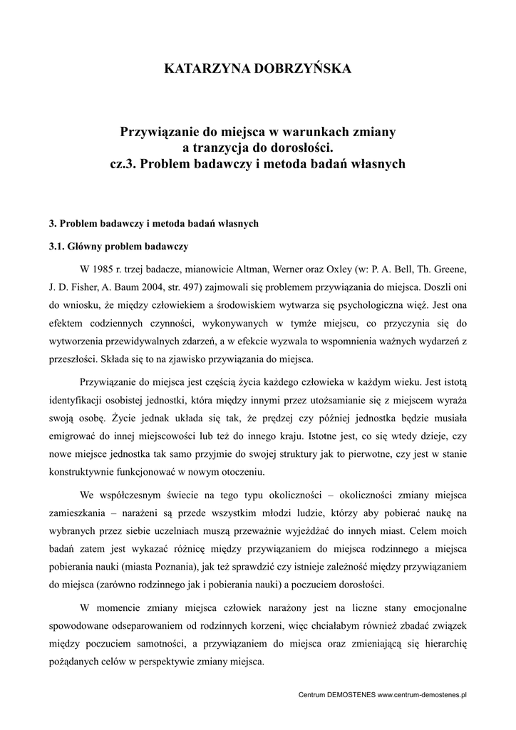 KATARZYNA DOBRZYŃSKA Przywiązanie do miejsca w warunkach zmiany a tranzycja do dorosłości. cz.3. Problem badawczy i metoda badań własnych 3. Problem badawczy i metoda badań własnych 3.1. Główny problem badawczy W 1985 r. trzej badacze, mianowicie Altman, Werner oraz Oxley (w: P. A. Bell, Th. Greene, J. D. Fisher, A. Baum 2004, str. 497) zajmowali się problemem przywiązania do miejsca. Doszli oni do wniosku, Ŝe między człowiekiem a środowiskiem wytwarza się psychologiczna więź. Jest ona efektem codziennych czynności, wykonywanych w tymŜe miejscu, co przyczynia się do wytworzenia przewidywalnych zdarzeń, a w efekcie wyzwala to wspomnienia waŜnych wydarzeń z przeszłości. Składa się to na zjawisko przywiązania do miejsca. Przywiązanie do miejsca jest częścią Ŝycia kaŜdego człowieka w kaŜdym wieku. Jest istotą identyfikacji osobistej jednostki, która między innymi przez utoŜsamianie się z miejscem wyraŜa swoją osobę. śycie jednak układa się tak, Ŝe prędzej czy później jednostka będzie musiała emigrować do innej miejscowości lub teŜ do innego kraju. Istotne jest, co się wtedy dzieje, czy nowe miejsce jednostka tak samo przyjmie do swojej struktury jak to pierwotne, czy jest w stanie konstruktywnie funkcjonować w nowym otoczeniu. We współczesnym świecie na tego typu okoliczności – okoliczności zmiany miejsca zamieszkania – naraŜeni są przede wszystkim młodzi ludzie, którzy aby pobierać naukę na wybranych przez siebie uczelniach muszą przewaŜnie wyjeŜdŜać do innych miast. Celem moich badań zatem jest wykazać róŜnicę między przywiązaniem do miejsca rodzinnego a miejsca pobierania nauki (miasta Poznania), jak teŜ sprawdzić czy istnieje zaleŜność między przywiązaniem do miejsca (zarówno rodzinnego jak i pobierania nauki) a poczuciem dorosłości. W momencie zmiany miejsca człowiek naraŜony jest na liczne stany emocjonalne spowodowane odseparowaniem od rodzinnych korzeni, więc chciałabym równieŜ zbadać związek między poczuciem samotności, a przywiązaniem do miejsca oraz zmieniającą się hierarchię poŜądanych celów w perspektywie zmiany miejsca. Centrum DEMOSTENES www.centrum-demostenes.pl Centrum DEMOSTENES www.centrum-demostenes.pl 3.2. Definicja i struktura zmiennych 3.2.1. Zmienne badawcze Zmienna zaleŜna Y: Y: Poczucie dorosłości Poziom poczucia dorosłości mierzony Kwestionariuszem Poczucia Dorosłości Arnetta. Zmienne niezaleŜne X: X1: Przywiązanie do miejsca, badane za pomocą Skali Przywiązania do Miejsca według William’a. Zmienna ta została poddana analizie na podstawie dwóch podskal w odniesieniu do przywiązania do Poznania i przywiązania do miasta rodzinnego: 1. poczucie toŜsamości z Poznaniem 2. poczucie zaleŜności od Poznania 3. poczucie toŜsamości z miastem rodzinnym 4. poczucie zaleŜności od miasta rodzinnego X2: poŜądane cele, badane za pomocą Inwentarza PoŜądanych Celów (Conceptions of the Desirable – Lorr, Suziedelis, Tomesk). Struktura poŜądanych celów scharakteryzowana została na podstawie analizy skupień uzyskanych wyników, na podstawie której wyszczególniono pięć podskal: 1. altruizmu i konformizmu 2. autodeterminacji, nonkonformizmu i ryzyka 3. egalitaryzmu i kolektywizmu 4. buntowniczości i beztroski 5. smakowanie Ŝycia i nienadwyręŜanie nerwów Zmienna niezaleŜna uboczna: X3: poczucie samotności, badane za pomocą Skali Poczucia Samotności UCLA. Zmienna określa poczucie samotności w nowym miejscu zamieszkania (Poznań). Centrum DEMOSTENES www.centrum-demostenes.pl 3.2.2. Struktura zmiennych W Tab. 3.1. przedstawiono strukturę zmiennych zaleŜnej i niezaleŜnych. Na ich podstawie określono zaleŜności między tymi zmiennymi – Rys. 3.1. Tab. 3.1. Struktura zmiennej zaleŜnej i zmiennych niezaleŜnych Zmienna Zmienna zaleŜna Zmienne niezaleŜne Zmienna niezaleŜna uboczna Metoda Wskaźnik Skala pomiarowa Poczucie dorosłości Kwestionariusz Poczucia Dorosłości Arnett Wyniki zsumowane Poziom ilościowy Przywiązanie do miejsca Skala Przywiązania do miejsca William’a Wynik na danej skali Poziom ilościowy PoŜądane cele Inwentarza PoŜądanych Celów (Conceptions of the Desirable – Lorr, Suziedelis, Tomesk). Wynik na danej skali Poziom ilościowy Poczucie samotności Skala Poczucia Samotności UCLA Wynik zsumowane Poziom ilościowy Źródło: opracowanie własne Rys. 3.1. Zakładane interakcje między zmiennymi Źródło: opracowanie własne Centrum DEMOSTENES www.centrum-demostenes.pl 3.3. Hipotezy badawcze Sformułowano pięć grup hipotez mówiących o związkach między badanymi zmiennymi. Prezentują się one następująco. 3.3.1. Hipoteza 1 Związek miedzy poziomem poczucia przywiązania do miejsca osób badanych, a poziomem samotności w nowym miejscu H01: Nie istnieje związek między poziomem poczucia przywiązania do miejsca osób badanych, a poziomem samotności w nowym miejscu. H1: Istnieje związek między poziomem poczucia przywiązania do miejsca osób badanych, a poziomem poczucia samotności w nowym miejscu. 3.3.2. Hipoteza 2 Związek pomiędzy poŜądanymi celami osób badanych, a poziomem ich przywiązania do miasta Poznania H02 : Nie istnieje związek pomiędzy poŜądanymi celami osób badanych, a poziomem ich przywiązania do miasta Poznania. H2: Istnieje związek pomiędzy poŜądanymi celami osób badanych, a poziomem ich przywiązania do Poznania. 3.3.3. Hipoteza 3 Związek pomiędzy poŜądanymi celami osób badanych, a poczuciem ich przywiązania do miasta rodzinnego H03: Nie istnieje związek pomiędzy poŜądanymi celami osób badanych, a poczuciem ich przywiązania do miasta rodzinnego. H3: Istnieje związek pomiędzy poŜądanymi celami osób badanych, a poczuciem ich przywiązania do miasta rodzinnego. 3.3.4. Hipoteza 4 Centrum DEMOSTENES www.centrum-demostenes.pl Związek pomiędzy poŜądanymi celami osób badanych, a poczuciem ich dorosłości H04: Nie istnieje związek po