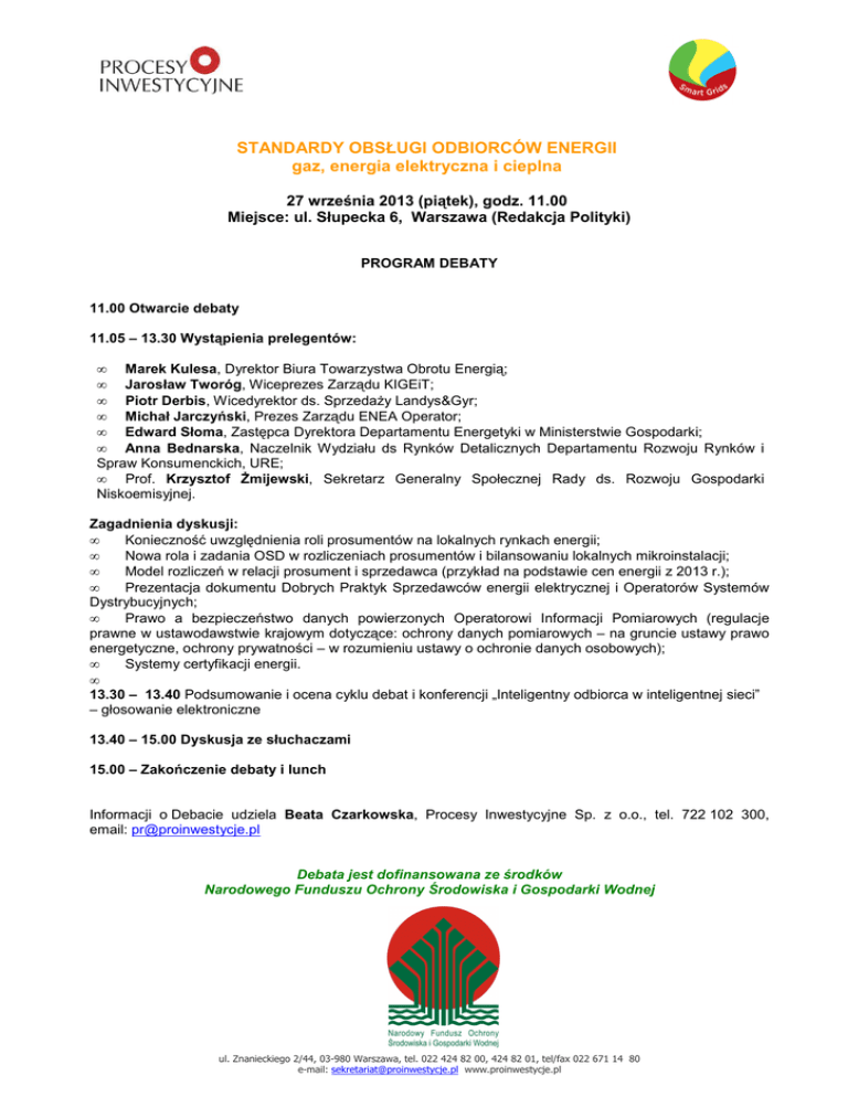 STANDARDY OBSŁUGI ODBIORCÓW ENERGII gaz, energia elektryczna i cieplna 27 września 2013 (piątek), godz. 11.00 Miejsce: ul. Słupecka 6, Warszawa (Redakcja Polityki) PROGRAM DEBATY 11.00 Otwarcie debaty 11.05 – 13.30 Wystąpienia prelegentów: • Marek Kulesa, Dyrektor Biura Towarzystwa Obrotu Energią; • Jarosław Tworóg, Wiceprezes Zarządu KIGEiT; • Piotr Derbis, Wicedyrektor ds. Sprzedaży Landys&Gyr; • Michał Jarczyński, Prezes Zarządu ENEA Operator; • Edward Słoma, Zastępca Dyrektora Departamentu Energetyki w Ministerstwie Gospodarki; • Anna Bednarska, Naczelnik Wydziału ds Rynków Detalicznych Departamentu Rozwoju Rynków i Spraw Konsumenckich, URE; • Prof. Krzysztof Żmijewski, Sekretarz Generalny Społecznej Rady ds. Rozwoju Gospodarki Niskoemisyjnej. Zagadnienia dyskusji: • Konieczność uwzględnienia roli prosumentów na lokalnych rynkach energii; • Nowa rola i zadania OSD w rozliczeniach prosumentów i bilansowaniu lokalnych mikroinstalacji; • Model rozliczeń w relacji prosument i sprzedawca (przykład na podstawie cen energii z 2013 r.); • Prezentacja dokumentu Dobrych Praktyk Sprzedawców energii elektrycznej i Operatorów Systemów Dystrybucyjnych; • Prawo a bezpieczeństwo danych powierzonych Operatorowi Informacji Pomiarowych (regulacje prawne w ustawodawstwie krajowym dotyczące: ochrony danych pomiarowych – na gruncie ustawy prawo energetyczne, ochrony prywatności – w rozumieniu ustawy o ochronie danych osobowych); • Systemy certyfikacji energii. • 13.30 – 13.40 Podsumowanie i ocena cyklu debat i konferencji „Inteligentny odbiorca w inteligentnej sieci” – głosowanie elektroniczne 13.40 – 15.00 Dyskusja ze słuchaczami 15.00 – Zakończenie debaty i lunch Informacji o Debacie udziela Beata Czarkowska, Procesy Inwestycyjne Sp. z o.o., tel. 722 102 300, email: [email protected] Debata jest dofinansowana ze środków Narodowego Funduszu Ochrony Środowiska i Gospodarki Wodnej ul. Znanieckiego 2/44, 03-980 Warszawa, tel. 022 424 82 00, 424 82 01, tel/fax 022 671 14 80 e-mail: [email protected] www.proinwestycje.pl