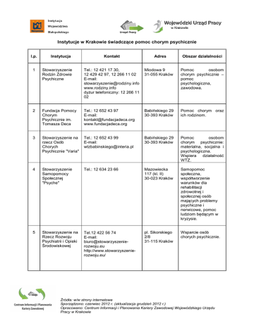 Instytucje w Krakowie świadczące pomoc chorym psychicznie l.p. Instytucja Kontakt Adres Obszar działalności 1 Stowarzyszenie Rodzin Zdrowie Psychiczne Tel.: 12 421 17 30, 12 429 42 97, 12 266 11 02 E-mail: [email protected] www.rodziny.info dyŜur telefoniczny: 12 266 11 02 Miodowa 9 31-055 Kraków Pomoc osobom chorym psychicznie – pomoc psychologiczna, zawodowa. 2 Fundacja Pomocy Chorym Psychicznie im. Tomasza Deca Tel.: 12 652 43 97 E-mail: [email protected] www.fundacjadeca.org Babińskiego 29 30-393 Kraków Pomoc chorym oraz ich rodzinom. 3 Stowarzyszenie na rzecz Osób Chorych Psychicznie "Varia" Tel.: 12 652 43 99 E-mail: [email protected] Babińskiego 29 30-393 Kraków Pomoc osobom chorym psychicznie: materialna, socjalna i psychologiczna. Wspiera działalność WTZ. 4 Stowarzyszenie Samopomocy Społecznej "Psyche" Tel.: 12 634 23 66 Mazowiecka 117 (kl. II) 30-023 Kraków Samopomoc społeczna, współtworzenie warunków dla rehabilitacji zdrowotnej i społecznej osób mających problemy psychiczne i nerwicowe, pomoc ludziom będącym w kryzysie. 5 Stowarzyszenie na Rzecz Rozwoju Psychiatrii i Opieki Środowiskowej Tel.12 422 56 74 E-mail: [email protected] http://www.stowarzyszenierozwoju.eu/ pl. Sikorskiego 2/8 31-115 Kraków Wsparcie osób chorych psychicznie. Źródła: w/w strony internetowe Sporządzono: czerwiec 2012 r. (aktualizacja grudzień 2012 r.) Opracowano: Centrum Informacji i Planowania Kariery Zawodowej Wojewódzkiego Urzędu Pracy w Krakowie 6 Fundacja Pomocy Chorym Psychicznie im. A. Kępińskiego tel. 12 652 42 01 e-mail: [email protected] dr. Babińskiego 29-1a Wspiera osoby chore psychicznie. 30-393 Kraków Instytucje w Krakowie świadczące pomoc osobą z niepełnosprawnością intelektualną l.p. Instytucja 1 Chrześcijańskie Stowarzyszenie Osób Niepełnosprawnych Ich Rodzin i Przyjaciół "Ognisko" Kontakt Tel.: 12 423 12 31 E-mail: [email protected] www.ognisko.org.pl Adres Obszar działalności Floriańska 15/10 31-019 Kraków Wspiera dorosłe osoby z niepełnosprawnością intelektualną w zakresie terapii, rehabilitacji i aktywizacji społecznej, zawodowej. Prowadzi: Środowiskowy Dom Samopomocy, Warsztaty Terapii Zajęciowej. Źródła: w/w strony internetowe Sporządzono: czerwiec 2012 r. (aktualizacja grudzień 2012 r.) Opracowano: Centrum Informacji i Planowania Kariery Zawodowej Wojewódzkiego Urzędu Pracy w Krakowie