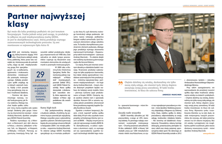 Laureaci konkursu „Biznes. Dobry wybór” Gedia Poland Assembly – Andrzej Marcinek Być może dla laika produkcja podłużnic nie jest tematem fascynującym. Trzeba jednak wziąć pod uwagę, że produkcja ta odbywa się pod międzynarodową marką GEDIA, że jest to skomplikowana część, której produkcja wymaga zaawansowanych technologicznie procesów. Są one montowane w najnowszym Oplu Astra IV. G EDIA jest niemiecką korporawosolski zakład produkcyjny działacją, której korzenie sięgają 1910 jący nieprzerwanie od 1998 roku. Dziś roku. Dwaj bracia założyli wtedy zatrudnia on około tysiąca pracowfirmę jubilerską, która przez lata rozników i zajmuje się tłoczeniem oraz wijała się i dostosowywała do potrzeb montażem elementów do wiodących rynku, stając się dziś międzynarodomarek w przemyśle motoryzacyjnym. wą grupą firm specjalizuW 2009 roku w Kojących się w wytłaczaniu, strzyńsko-Słubickiej zgrzewaniu i znakowaniu Specjalnej Strefie Ekoelementów metalowych nomicznej, jednej z największych w Polsce dla przemysłu motoryzastref inwestycyjnych, cyjnego. Zakłady produkprocent powstał Zakład GPL2, cyjne spółki znajdują się w różnych częściach świaczyli GEDIA Poland Aszatrudnionych ta. Każdy z nich posiada sembly. Nowa spółka w polskich inną specjalizację, inny zaskorzystała z doskonazakładach kres i możliwości działania. łych warunków streGEDIA – Pomimo tak dynafy, która zapewnia najstanowią micznego rozwoju, nawiększe w Polsce ulgi kobiety podatkowe dla swoich dal funkcjonujemy jak firinwestorów. ma rodzinna. Dlatego też, choć każda spółka córka jest inna, mamy wspólne cele i jeden Rama high-tech zarząd. Działamy jako grupa i stara– Gdy podejmowaliśmy decyzję my się równomiernie rozwijać – mówi o budowie zakładu, chcieliśmy, by poAndrzej Marcinek, dyrektor zarządzamimo kryzysu powstał jak najszybciej. jący GEDIA Poland Assembly. Dlatego wszystkie prace wykonaliśmy Rodzina wywodząca się z Attenzgodnie z planem. Od wbicia pierwszej dorn w Niemczech jest dziś obecna łopaty do uroczystego otwarcia fabryki w Polsce, z dwoma zakładami w Now listopadzie 2009 r. nie minęło półtowej Soli, na Węgrzech, w Hiszpanii, ra roku – wspomina Andrzej Marcinek. w Meksyku i Chinach. Pierwszą zaTo właśnie załoga GEDIA Assembly graniczną inwestycją firmy był nospecjalizuje się w montażu podłużni- 29 cy do Astry IV, czyli elementu nośnego konstrukcji całego podwozia. Jak sama nazwa wskazuje, podłużnica biegnie wzdłuż samochodu i jest kluczowym elementem całego szkieletu auta. To bardzo skomplikowany przestrzennie element podwozia, dlatego jego produkcja wymaga stosowania najnowszych technologii. – Dysponujemy takimi technologiami – zaznacza Andrzej Marcinek. – To właśnie dzięki nim staliśmy się dostawcą pierwszego rzędu dla General Motors. Co więcej, firma jest również cenionym doradcą w dziedzinie badań i rozwoju. W procesie produkcji wykorzystuje nie tylko pojedyncze stanowiska, lecz także roboty zgrzewalnicze i modułowe automatyczne linie produkcyjne. – Jesteśmy najwyższej klasy partnerem międzynarodowym – nie kryje dumy Andrzej Marcinek. – Innym, równie złożonym projektem będzie wahacz do kolejnej wersji modelu Astra – pierwsza ruchoma część produkowana w Grupie GEDIA. Cieszymy się, że zaufano właśnie nam ć opowiada dyrektor. Koncern GM w uznaniu wysokiej jakości produktów uhonorował firmę prestiżową nagrodą Supplier Quality Excellence Award. Zgodnie z mottem korporacji „Razem, o krok naprzód” polska spółka idzie dalej. W tym roku uzyskała nowe projekty od kolejnego klienta, tym razem od BMW. – Między innymi jest to cały tył najnowszego modelu BMW i8. To skomplikowana, w całości wykonana z aluminium część, co wymaga od nas wprowadzenia zupełnie nowych technologii obróbki tego meta- FOT. gedia poland assembly Partner najwyższej klasy Chętnie dzielimy się wiedzą, doskonalimy nie tylko naszą stałą załogę, ale również tych, którzy dopiero zaczynają swoją pracę zawodową. W ludzi trzeba inwestować, to klucz do sukcesu firmy. Andrzej Marcinek lu – spawania laserowego – mówi Andrzej Marcinek. Zasady nade wszystko GEDIA Assembly zatrudnia już 182 pracowników, z czego aż 29% stanowią kobiety. To pewnego rodzaju ewenement w przemyśle motoryzacyjnym. – Chcemy poszerzać zatrudnienie. W obu zakładach GEDII w Nowej Soli znalazło pracę już 1200 mieszkańców miasta i okolic oraz Kożuchowa, co czy- ni nas największym pracodawcą w mieście – mówi dyrektor. Niektórzy pracownicy dojeżdżają z Głogowa czy Zielonej Góry. Duża, stabilna spółka to dobry pracodawca, odpowiedzialny za swoją załogę, środowisko i działania lokalne. – Nie stronimy od działalności charytatywnej. Prowadzimy własną komisję dotacyjną, przeznaczamy pieniądze na rzecz szkół oraz straży pożarnej, sponsorujemy także sport. Nic dziwnego, że GEDIA Poland Assembly została w 2012 r. uhonorowana tytułem i statuetką Ambasadora Nowosolskiego Odpowiedzialnego Biznesu. Przy takim zaangażowaniu we wprowadzanie do produkcji nowości spółka daje także możliwość zdobywania wiedzy na stażach i praktykach. – Chętnie dzielimy się wiedzą, doskonalimy nie tylko naszą stałą załogę, ale również tych, którzy dopiero zaczynają swoją pracę zawodową. W ludzi trzeba inwestować, to klucz do sukcesu firmy. Wyzwania rynku i oczekiwania klientów są na tyle duże, że stale motywujemy naszych pracowników do rozwoju, ale także jesteśmy otwarci na ich własne inicjatywy. Bez ich wiedzy i umiejętności nie moglibyśmy spełnić oczekiwań, jakie stawia dostawcy nowoczesny rynek – mówi dyrektor Andrzej Marcinek. www.gedia.com