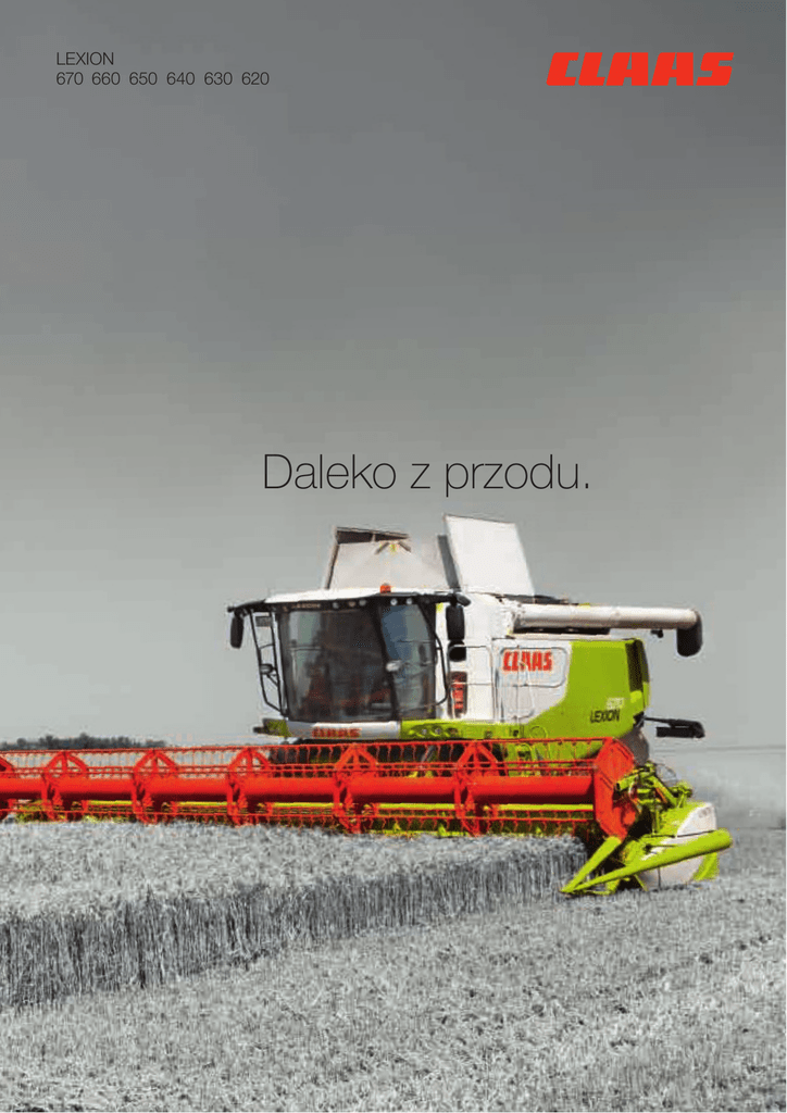 LEXION 670 660 650 640 630 620 Daleko z przodu. Wymagania rosną. Jest tylko jedna siła, która mogła stworzyć z LEXION sukces trwający od wielu lat aż do dzisiaj: nasi klienci. Właśnie dlatego ich opinia jest najlepszą oceną rzeczy. Dokładnie wysłuchaliśmy, zrozumieliśmy, zbudowaliśmy, dostosowaliśmy. Sprawdziliśmy każdy szczegół. Poprawiliśmy to, co należało, zintegrowaliśmy najnowsze technologie, dostroiliśmy wszystko od nowa nadając całości świeżą formę. Wynik: to nowy LEXION. Są funkcje, usługi, możliwości, których nie bez racji oczekują Państwo od najwyższej jakości CLAAS. Są także głęboko przemyślane rozwiązania, które na całym świecie znajdują się tylko w CLAAS. Przykładem jest system omłotu APS połączony z efektywną technologią wytrząsaczy. Postęp w wydajności oferowany przez takie rozwiązania wspierają liczne, wyjątkowe nowości, jak na przykład superkomfortowa kabina, CEBIS o poprawionej obsłudze oraz GPS PILOT pomagający pracować jeszcze dokładniej. LEXION ponownie udowadnia swoją przekonującą funkcjonalność, wybiegającą daleko do przodu i spełniającą wymagania przyszłości. Na polu. Na drodze, na rynku i wśród konkurencji. Nowy LEXION. Daleko z przodu. Nowy LEXION. Spis treści: Komfortowa kabina Kabina, oświetlenie EASY – Efficient Agriculture Systems by CLAAS Ekran CEBIS, puplit obsługowy Wielofunkcyjny uchwyt CEBIS CLAAS TELEMATICS Zarządzanie zleceniami, mapy wydajności, CRUISE PILOT Systemy automatycznego kierowania 6 8 10 12 14 16 18 20 Przyrządy robocze Kanał wciągający Komfort w przyrządzie żniwnym Przyrząd żniwny VARIO, rzepak Przyrządy do ryżu, soi i składany przyrząd żniwny CONSPEED, CONSPEED LINEAR, SUNSPEED RAKE UP, SWATHMASTER MAXFLO Automatyka przyrządu żniwnego 22 24 26 28 Technologia omłotu System omłotu APS Technologia wytrząsaczy, MULTIFINGER SEPARATOR SYSTEM (MSS) Czyszczenie Zbiornik ziarna, ochrona ziarna, QUANTIMETER Zarządzanie słomą 40 42 CLAAS POWER SYSTEMS Silnik, chłodzenie 52 54 MONTANA Ochrona gleby, TERRA TRAC Napęd jezdny, Ultra Flex, technologia opon Ogumienie, przeglądy FIRST CLAAS SERVICE®, MAXI CARE® Nowy LEXION w skrócie Argumenty Dane techniczne 56 58 30 32 34 36 38 44 46 48 50 60 62 64 66 68 70 Nowa kabina. Wymagania rosną. „Moi kierowcy zawsze pracują przez długie dni. Kabina musi być być bardzo komfortowa.“ Komfortowa kabina Optymalne warunki pracy. Nowy LEXION oferuje kierowcy jeszcze więcej miejsca, niż poprzedni model, dużą swobodę ruchów, przejrzystość i znakomitą widoczność. Zawsze przyjemny klimat, niski poziom hałasu, trójstopniowo przestawiana kolumna kierownicy tworzą doskonałe warunki do pracy. Amortyzuje, podpiera, przewietrza, ogrzewa: fotel klasy Premium. Ten, kto musi w fotelu udowadniać dynamikę i aktywność, otrzyma tu pełne wsparcie. Aktywna kontrola klimatu troszczy się o optymalne przewietrzanie oraz odprowadzanie potu bez narażania kierowcy na szkodliwe przeciągi, Pneumatyczna amortyzacja z automatyczną kontrolą wysokości samoczynnie dostosowuje się do masy ciała kierowcy skutecznie tłumiąc do 40% drgań. Dwustopniowe, pneumatyczne podparcie kręgosłupa dba o zdrowe plecy. Ogrzewanie siedziska pracuje z automatycznym termostatem. Pełnowartościowy: fotel pasażera z chłodzonym schowkiem. š Zintegrowane w drzwiach oparcie ramienia š Składane oparcie zmieniane w "stolik śniadaniowy" š Duży, chłodzony schowek o pojemności 43 l z uchwytem na butelki š Wiele innych schowków Najwyższy komfort to również lodówka i fotel pasażera. 8 Więcej miejsca, wyższy komfort, większa wydajność kierowcy. Kiedy Państwo zechcą, jasno jak w dzień. Koncepcja oświetlenia także w ciemnościach gwarantuje doskonałą widoczność pola pracy oraz komponentów maszyny. Cały pakiet uzupełnia inteligentne wyposażenie np. w funkcję doświetlania. Żarówki H9 i reflektory ksenonowe zamieniają noc w dzień. š š š š š š š š Do dziesięciu reflektorów roboczych Oświetlenie składanych przyrządów roboczych Oświetlenie boczne, ścierniska, osi kierującej Automatyczne oświetlenie rury rozładowczej Automatyczne reflektory jazdy do tyłu Oświetlenie układu czyszczenia, zbiornika ziarna, zgonin Światła serwisowe pod pokrywami bocznymi Przenośne reflektory robocze Przejrzyste i łatwe sterowanie oświetleniem roboczym wykonywane jest w polu obsługowym. Konfigurację lamp można łatwo wykonać w CEBIS. Kolumna kierownicy jest przestawiana trójstopniowo. Kabina Oświetlenie 9 EASY. Po prostu wydobyć więcej. Nazwa jest programem. Go on. Go easy. Swoją kompetencję w dziedzinie elektoniki CLAAS określił mianem: EASY. EASY dzieli się na cztery zakresy. Każdy jest oddzielnym specjalistą a razem tworzą silny zespół. Efficient Agriculture Systems daje to, co obiecuje: Ustawienia maszyny, systemy kierowania i rozwiązania programowych są w EASY bardzo proste. Wszystkie systemy można perfekcyjnie wzajemnie dopasować i wydobyć ze swoich maszyn oraz gospodarstwa to, co w nich najlepsze. š on board - sterowanie maszyny i optymalizacja wydajności wykonywane z kabiny š on field - wzrost produktywności bezpośrednio na polu š on track - nadzór maszyny i zdalna diagnoza š on farm - rozwiązania programowe dla gospodarstwa „Jedną maszyną jeździ trzech kierówców o różnych kwalifikacjach. Ale każdy z nich musi umieć wydobyć z maszyny optimum jej możliwości.“ EASY Efficient Agriculture Systems by CLAAS Wszystko pod kontrolą. Nowy CEBIS. Kierowca ma tu wszystko jak na obrazku. CEBIS na drodze. Informacja, rejestracja, sterowanie i nadzór to zadania elektronicznego systemu informacji pokładowej CEBIS. Wyróżnia się on jasnym, logicznym podziałem struktury menu. 1 2 3 4 Wystarczy jedno spojrzenie a CEBIS pokaże aktualne przebiegi czynności i stany maszyny: Obraz jazdy wzgl. obraz żniw przejrzyście zbierają wszystkie istotne inf