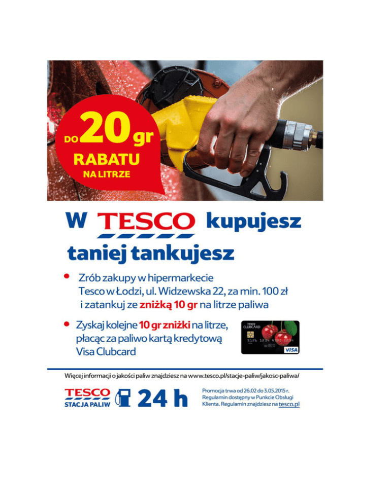 REGULAMIN PROMOCJI „W TESCO kupujesz, taniej tankujesz” Organizatorem Promocji jest TESCO (Polska) Sp. z o.o. z siedzibą w Krakowie przy ul. Kapelanka 56, 30-347 Krąków, wpisana do rejestru przedsiębiorców prowadzonego przez Sąd Rejonowy dla Krakowa – Śródmieścia, XI Wydział Gospodarczy Krajowego Rejestru Sądowego pod numerem KRS 0000016108, NIP: 526-10-37-737 1. Definicje Terminy użyte w niniejszym Regulaminie, o ile z kontekstu nie wynika inaczej, otrzymały następujące znaczenie: 1.1 Promocja – promocja „W TESCO kupujesz, taniej tankujesz”. 1.2 Klient – każda osoba fizyczna posiadająca pełną zdolność do czynności prawnych, konsument w rozumieniu art. 221 k.c., dokonująca zakupów w Placówkach. 1.3 Produkt/-y – artykuły spożywcze i przemysłowe z wyłączeniem wyrobów tytoniowych, napojów alkoholowych, mleka początkowego dla niemowląt, doładowań PREPAID, płatności z tytułu „WYGODNE RACHUNKI". 1.4 Kupon rabatowy – odcinek niefiskalny drukowany w Placówkach na stoisku kasowym wraz z paragonem po spełnieniu warunków uczestnictwa w nin. Promocji. 1.5 Placówka – hipermarket Tesco biorący udział w Promocji, zlokalizowany pod adresem: Łódź ul. Widzewska 22. Promocja nie obowiązuję na terenie innych sklepów Tesco w Łodzi. Przez Placówkę rozumie się halę sprzedaży, nie sklepy firm zewnętrznych na pasażu handlowym w Placówkach. 1.6 POK – Punkt Obsługi Klienta na terenie Placówki 1.7 Stacja Paliw – stacja paliw TESCO przy sklepie Łódź ul. Widzewska 22. 1.8 Paliwo – paliwo napędowe do pojazdów mechanicznych sprzedawane na Stacji paliw: etylina Pb95, etylina Pb98, Olej Napędowy, Gaz Płynny LPG. Za paliwo nie uznaje się gazu sprzedawanego w butlach. 1.9 Rabat za zakupy w TESCO („Rabat/-y”) – upust o wartości 0,10 zł przyznawany do każdego Pełnego zakupionego litra/decymetra sześciennego (LPG) paliwa, po spełnieniu warunku dokonania w Placówce zakupów/-ów odpowiednio na kwotę minimum 100 zł, brutto i zeskanowaniu karty Clubcard zarejestrowanego/ych na jednym paragonie fiskalnym. Rabat można łączyć z rabatem, o którym mowa w pkt 1.10, na warunkach określonych w niniejszym Regulaminie. 1.10 Rabat z kartą Visa Clubcard („Rabat/-y”) - Upust wartości 0,10 zł brutto przyznawany do każdego zakupionego litra/decymetra sześciennego (LPG) paliwa przy każdej płatności pełnej sumy rachunku za paliwo na Stacji Paliw, dokonanej kartą kredytową Visa Clubcard. Rabat można łączyć z rabatem, o którym mowa w pkt 1.9, na warunkach określonych w niniejszym Regulaminie. 1.10. Regulamin – nin. regulamin 2. Zasady Promocji 2.1. Promocja ma na celu wsparcie sprzedaży Paliwa na Stacji Paliwa poprzez udzielanie Rabatu za zakupy w hipermarkecie TESCO, na podstawie Kuponów rabatowych przyznawanych za zakupy w hipermarkecie TESCO, na kwotę minimum 100 zł brutto z użyciem karty Clubcard. UWAGA: Akcją nie jest objęty sklep internetowy TESCO E-Zakupy 2.2. Promocja trwa od 26.02.2015 r. do 03.05.2015 r., w tym okresie będą wydawane Kupony rabatowe w Placówce oraz realizowane na Stacjach Paliw. 2.3. Rabaty przyznawane do każdego pełnego zakupionego litra/decymetra sześciennego Paliwa (LPG) na Stacjach Paliw. 2.4. Rabat za zakupy w Tesco jest przyznawany po spełnieniu warunku dokonania zakupu Produktów odpowiednio za minimum 100 zł brutto z użyciem karty Clubcard udokumentowanego na jednym paragonie fiskalnym. 2.5. Osoby, które na Stacji Paliw zapłacą za Paliwo kartą kredytową Visa Clubcard niezależnie od Rabatu za zakupy w Tesco uzyskają dodatkowo Rabat z kartą Visa Clubcard - zgodnie z punktem 3.4.b. 2.6. Tankowanie może odbywać się tylko do jednego zbiornika paliwowego pojazdu. Pojemność zbiornika jest limitem górnym otrzymywanego rabatu. Rabat nie będzie udzielony w przypadku tankowania do kanistra lub przy jednoczesnym tankowaniu do zbiornika paliwowego pojazdu i kanistra. 2.7. Klient realizuje Kupon rabatowy w kasie Stacji Paliw podczas płatności za zakupione Paliwo. 2.8. Aby zrealizować Kupon rabatowy Klient zobowiązany jest na początku transakcji okazać kasjerowi Stacji Paliw paragon, stanowiący dowód dokonania w Placówkach zakupów na kwotę, co najmniej 100 zł, brutto w dniach trwania Promocji . Kasjer odbiera paragon, odcina część niefiskalną z Kuponem rabatowym i zachowuje w kasie; pozostała część paragonu jest zwracana Klientowi. 2.9. W sytuacji, gdy Klient za zakupy w Placówce otrzymuje fakturę VAT, Kupon rabatowy z paragonu zostaje odcięty i przyczepiony do faktury VAT. Klient korzystający z Promocji na początku transakcji przekazuje kasjerowi Stacji Paliw fakturę VAT z dołączonym Kuponem rabatowym. Kasjer ma obowiązek odczepić kupon od faktury. 2.10. Aby otrzymać Rabat z kartą Visa Clubcard Klient zobowiązany jest zapłacić za Paliwo zakupione na Stacji Paliw (pełna wartość tankowania) kartą Visa Clubcard. Rabat naliczany jest automatycznie. Kasjer Stacji Paliw odnotowuje na wręczanym klientowi paragonie ilość zakupionych pełnych litrów/dm3 Paliwa, przybija pieczątkę TESCO i dołącza do paragonu potwierdzenie dokonania płatności kartą Visa Clubcard. 2.11. Promocja nie obejmuje zakupów Paliw dla pojazdów o dopuszczalnej masie całkowitej powyżej 3,5 tony (samochody ciężarowe), autobusów, ciągników rolniczych, oraz innych pojazdów niebędących samochodami osobowymi, motorowerami, motocyklami. 3. Warunki otrzymania i realizacja Kuponu rabatowego 3.1. Warunkiem otrzymania Kuponu rabatowego przez Klienta jest dokonanie zakupu/-od Produktu/-od w Placówce na kwotę minimum 100 zł z użyciem karty Clubcard w okresie od trwania Promocji, zarejestrowanego na jednym paragonie fiskalnym. 3.2. Realizacja Kuponu rabatowego jest możliwa na Stacjach Paliw w okresie trwania Promocji, podczas zakupu Paliwa. 3.3. Udział w Promocji jest równoznaczny z akceptacją wszystkich jej warunków określonych w niniejsz