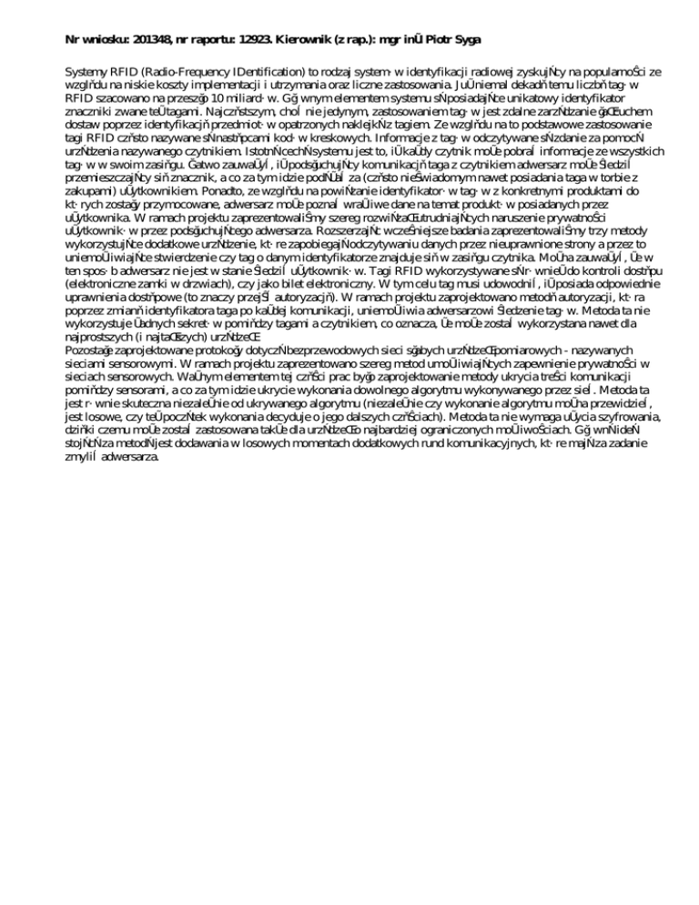 Nr wniosku: 201348, nr raportu: 12923. Kierownik (z rap.): mgr inż. Piotr Syga Systemy RFID (Radio-Frequency IDentification) to rodzaj systemów identyfikacji radiowej zyskujący na popularności ze względu na niskie koszty implementacji i utrzymania oraz liczne zastosowania. Już niemal dekadę temu liczbę tagów RFID szacowano na przeszło 10 miliardów. Głównym elementem systemu są posiadające unikatowy identyfikator znaczniki zwane też tagami. Najczęstszym, choć nie jedynym, zastosowaniem tagów jest zdalne zarządzanie łańcuchem dostaw poprzez identyfikację przedmiotów opatrzonych naklejką z tagiem. Ze względu na to podstawowe zastosowanie tagi RFID często nazywane są następcami kodów kreskowych. Informacje z tagów odczytywane są zdanie za pomocą urządzenia nazywanego czytnikiem. Istotną cechą systemu jest to, iż każdy czytnik może pobrać informacje ze wszystkich tagów w swoim zasięgu. Łatwo zauważyć, iż podsłuchujący komunikację taga z czytnikiem adwersarz może śledzić przemieszczający się znacznik, a co za tym idzie podążać za (często nieświadomym nawet posiadania taga w torbie z zakupami) użytkownikiem. Ponadto, ze względu na powiązanie identyfikatorów tagów z konkretnymi produktami do których zostały przymocowane, adwersarz może poznać wrażliwe dane na temat produktów posiadanych przez użytkownika. W ramach projektu zaprezentowaliśmy szereg rozwiązań utrudniających naruszenie prywatności użytkowników przez podsłuchującego adwersarza. Rozszerzając wcześniejsze badania zaprezentowaliśmy trzy metody wykorzystujące dodatkowe urządzenie, które zapobiegają odczytywaniu danych przez nieuprawnione strony a przez to uniemożliwiające stwierdzenie czy tag o danym identyfikatorze znajduje się w zasięgu czytnika. Można zauważyć, że w ten sposób adwersarz nie jest w stanie śledzić użytkowników. Tagi RFID wykorzystywane są również do kontroli dostępu (elektroniczne zamki w drzwiach), czy jako bilet elektroniczny. W tym celu tag musi udowodnić, iż posiada odpowiednie uprawnienia dostępowe (to znaczy przejść autoryzację). W ramach projektu zaprojektowano metodę autoryzacji, która poprzez zmianę identyfikatora taga po każdej komunikacji, uniemożliwia adwersarzowi śledzenie tagów. Metoda ta nie wykorzystuje żadnych sekretów pomiędzy tagami a czytnikiem, co oznacza, że może zostać wykorzystana nawet dla najprostszych (i najtańszych) urządzeń. Pozostałe zaprojektowane protokoły dotyczą bezprzewodowych sieci słabych urządzeń pomiarowych - nazywanych sieciami sensorowymi. W ramach projektu zaprezentowano szereg metod umożliwiających zapewnienie prywatności w sieciach sensorowych. Ważnym elementem tej części prac było zaprojektowanie metody ukrycia treści komunikacji pomiędzy sensorami, a co za tym idzie ukrycie wykonania dowolnego algorytmu wykonywanego przez sieć. Metoda ta jest równie skuteczna niezależnie od ukrywanego algorytmu (niezależnie czy wykonanie algorytmu można przewidzieć, jest losowe, czy też początek wykonania decyduje o jego dalszych częściach). Metoda ta nie wymaga użycia szyfrowania, dzięki czemu może zostać zastosowana także dla urządzeń o najbardziej ograniczonych możliwościach. Główną ideą stojącą za metodą jest dodawania w losowych momentach dodatkowych rund komunikacyjnych, które mają za zadanie zmylić adwersarza.