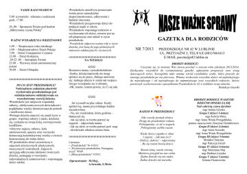 NASZE KALENDARIUM 5.09. (czwartek)– zebrania z rodzicami godz. 17.00 20..09. - Sprzątanie Świata pod hasłem „0dkrywamy czystą Polskę” WAŻNE WYDARZENIA WRZEŚNIOWE 1.09. – Rozpoczęcie roku szkolnego 1.09. – Międzynarodowy Dzień Pokoju 7.09. – Dzień Umiejętności Czytania 13.09. – Dzień Kolejarza 20-22 .09. – Sprzątanie Świata 23.09. - Pierwszy dzień astronomicznej jesieni 30.09. – Dzień Chłopaka PO CO JEST PRZEDSZKOLE? Nadrzędnym zadaniem placówki wychowania przedszkolnego jest wielokierunkowe oddziaływanie na wszechstronny rozwój dziecka. •Przedszkole jest miejscem wspaniałej zabawy, zdobywania nowych doświadczeń i pogłębiania wiedzy dostosowanej do potrzeb i możliwości dzieci. •Pomaga dziecku nauczyć się zasad życia w grupie: wspólnej zabawy i nauki, dzielenia się, czekania na swoją kolej, rozwiązywania konfliktów. •Aktywne zajęcia, zabawy, koła zainteresowań, spacery oraz wycieczki dostarczają konstruktywnej wiedzy o świecie dostosowanej do wieku dzieci. •W przedszkolu dzieci uczestniczą w zajęciach artystycznych: plastycznych, muzycznych i teatralnych. Zajęcia te sprzyjają odkrywaniu zdolności twórczych dziecka, pomagają w rozwijaniu indywidualnych zainteresowań i wspomagają dzieci zdolne. •Przedszkole umożliwia poznawanie świata przez samodzielne eksperymentowanie, odkrywanie i badanie otoczenia. •Przedszkole przygotowuje dzieci do podjęcia nauki w szkole. •Przedszkole wspomaga rodziców w wychowaniu ich dzieci, otwarte jest na ich propozycje oraz udział w życiu przedszkola. Przedszkole odgrywa ważna rolę w życiu dziecka, jest bazą do jego późniejszych sukcesów edukacyjnych i życiowych. NA WESOŁO Rozmowa mamy z przedszkolakiem: -Synku, dzisiaj naprawdę nie mogę spóźnić się do pracy, dlatego umówmy się: żadnego płaczu w szatni ani rozpaczliwego wczepiania się w ubranie. -OK, mamo. Jestem pewny, że Ci się uda. GAZETKA DLA RODZICÓW NR 7/2013 PRZEDSZKOLE NR 42 W LUBLINIE UL. PRZYJAŹNI 3, TEL/FAX (081)7461613 E-MAIL [email protected] DRODZY RODZICE! Cieszymy się, że możemy Was znowu powitać w nowym roku szkolnym 2013/2014. Zachęcamy wszystkich do czytanianaszej gazetki, zgłaszania propozycji oraz uwag dotyczących treści. Szczególnie miło witamy wśród czytelników osoby, które przyszły do naszego przedszkola po raz pierwszy. Witamy serdecznie wszystkie dzieci od najmniejszego do największego i od największego do najmniejszego oraz wszystkich rodziców, którzy powierzyli wychowawcom i specjalistom Przedszkola nr 42 w Lublinie swoje dziecko. Redakcja Gazetki Jaś wyszedł na plac zabaw. Kiedy spóźnił się, mama przywitałago bardzo niezadowlona . - No, nie wiedziałem, która godzina tłumaczył się. - Jak się idzie, to trzeba patrzeć na zegarek – odpowiada mama. - Jak się idzie, to trzeba patrzeć pod nogi - skwitowała młodsza siostra Jasia. Literatura: • „Przedszkolak” Nr 4/2011 • „Wychowanie przedszkolne. Pomagamy uczyć” WSiP • „Bliżej przedszkola” 9/2012 Opracowanie: M.Maj , A.Szwedo, S.Mróz RAZEM W PRZEDSZKOLU Gdy wesoły promyk słońca Drogę do przedszkola wskaże, Pobiegniemy, co sił w nogach, Pobiegniemy szybko razem. Kiedy deszcz zapuka w okno I zapyta: - Jak tam leci? - Dobrze, dobrze! – odpowiemy. - Bo się razem bawią dzieci. Razem zimą, razem wiosną; Mnóstwo przygód na nas czeka. Żadne dziecko się nie nudzi, Żadne dziecko nie narzeka. DRODZY RODZICE WASZYMI DZIEĆMI OPIEKUJĄ SIĘ Nad całością czuwa dyrektor mgr Janina Górska Grupa I (dzieci 3-letnie) mgr Sylwia Mróz, mgr Anna Wnuk-Przegalińska, pomoc nauczyciela: Grażyna Ozimkiewicz Grupa II (dzieci 4-letnie) mgr Anna Szwedo, mgr Anna Wnuk-Przegalińska Grupa III (dzieci 5-letnie) Monika Charmas mgr Patrycja Grzyb Grupa IV (dzieci 6-letnie) mgr Marzanna Maj mgr Barbara Łazuka Grupa V (dzieci 5-letnie) Jolanta Oszatowska RADY DLA RODZICÓW 3 – LATKÓW 1. Nie przeciągaj pożegnania w szatni. Pomóż dziecku rozebrać się, pocałuj je i wyjdź. 2.Nie zabieraj dziecka do domu, kiedy płacze. Jeśli zrobisz to choć raz, będzie wiedziało, że łzami można wszystko wymusić. 3.Nie obiecuj: jeśli pójdziesz do przedszkola, to coś dostaniesz. 4.Kontroluj to, co mówisz. Zamiast: już możemy wracać do domu, powiedz: teraz możemy iść do domu. To niby niewielka różnica, a jednak pierwsze zdanie ma negatywny wydźwięk. 5.Nie wymuszaj na dziecku, żeby zaraz po przyjściu do domu opowiedziało, co się wydarzyło w przedszkolu. Powoduje to niepotrzebny stres. 6.Jeśli dziecko przy pożegnaniu płacze, postaraj się, żeby przez kilka dni odprowadzał je tato. Rozstania z tatą są mniej bolesne. 7.Pamiętaj: zawsze żegnaj i witaj swoje dziecko uśmiechem. RODZICU PAMIĘTAJ!!! Nie strasz dziecka przedszkolem. Nie mów, że powiesz pani o jego złym zachowaniu w domu. Nie opowiadaj w towarzystwie dziecka o swoich obawach lub wątpliwościach związanych z przedszkolem lub panią. Nie strasz dziecka swoimi przykrymi przedszkolnymi przeżyciami. Dziecko powinno wiedzieć, że miejsce, w którym ma spędzać czas bez rodziców, jest dobre i bezpieczne. Nie obiecuj rzeczy, co, do których nie masz pewności, np. że dziecko nie będzie musiało kłaść się na leżaku lub codziennie będzie mogło przynosić do przedszkola swoją ulubioną zabawkę. Lepiej wcześniej porozmawiać z panią, by upewnić się, jakie zasady obowiązują w danej grupie i w przedszkolu. JAK POZNAĆ, ŻE DZIECKO ZAADOPTOWAŁO SIĘ W PRZEDSZKOLU dziecko mówi o tym, co wydarzyło się w przedszkolu, co samo robiło, kto odwiedził je w grupie dziecko chce iść do przedszkola, nawet w wolne dni wstaje wcześniej podejmuje zabawy, w których wyraża swoje emocje, doświadczenia, zabawa pochłania je całkowicie przejawia zainteresowanie i akceptację dla nowych kolegów, często o nich opowiada rodzicom akceptuje spotkanych w przedszkolu dorosłych, ufnie podchodzi do nich w