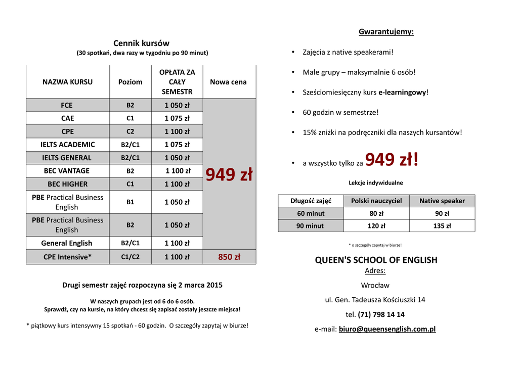Gwarantujemy: Cennik kursów (30 spotkań, dwa razy w tygodniu po 90 minut) NAZWA KURSU Poziom OPŁATA ZA CAŁY SEMESTR FCE B2 1 050 zł CAE C1 1 075 zł CPE C2 1 100 zł IELTS ACADEMIC B2/C1 1 075 zł IELTS GENERAL B2/C1 1 050 zł BEC VANTAGE B2 1 100 zł BEC HIGHER C1 1 100 zł PBE Practical Business English B1 1 050 zł PBE Practical Business English B2 1 050 zł General English B2/C1 1 100 zł CPE Intensive* C1/C2 1 100 zł • Zajęcia z native speakerami! • Małe grupy – maksymalnie 6 osób! • Sześciomiesięczny kurs e-learningowy! • 60 godzin w semestrze! • 15% zniżki na podręczniki dla naszych kursantów! • a wszystko tylko za Nowa cena 949 zł 949 zł! Lekcje indywidualne Długość zajęć Polski nauczyciel Native speaker 60 minut 80 zł 90 zł 90 minut 120 zł 135 zł * o szczegóły zapytaj w biurze! 850 zł QUEEN'S SCHOOL OF ENGLISH Adres: Drugi semestr zajęć rozpoczyna się 2 marca 2015 Wrocław W naszych grupach jest od 6 do 6 osób. Sprawdź, czy na kursie, na który chcesz się zapisać zostały jeszcze miejsca! ul. Gen. Tadeusza Kościuszki 14 * piątkowy kurs intensywny 15 spotkań - 60 godzin. O szczegóły zapytaj w biurze! tel. (71) 798 14 14 e-mail: [email protected]