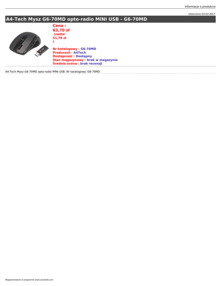Informacje o produkcie Utworzono 03-03-2017 A4-Tech Mysz G6-70MD opto-radio MINI USB - G6-70MD Cena : 63,70 zł (netto: 51,79 zł ) Nr katalogowy : G6-70MD Producent : A4Tech Dostępność : Dostępny Stan magazynowy : brak w magazynie Średnia ocena : brak recenzji A4-Tech Mysz G6-70MD opto-radio MINI USB. Nr katalogowy: G6-70MD Wygenerowano w programie www.oscGold.com