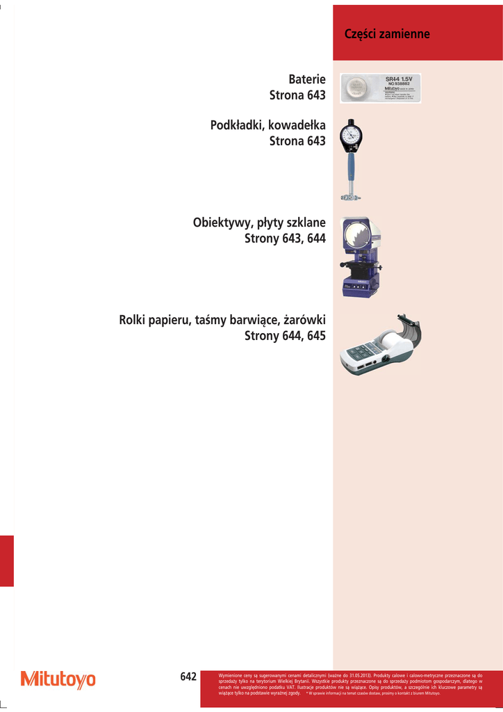Części zamienne Baterie Strona 643 Podkładki, kowadełka Strona 643 Obiektywy, płyty szklane Strony 643, 644 Rolki papieru, taśmy barwiące, żarówki Strony 644, 645 642 Wymienione ceny są sugerowanymi cenami detalicznymi (ważne do 31.05.2013). Produkty calowe i calowo-metryczne przeznaczone są do sprzedaży tylko na terytorium Wielkiej Brytanii. Wszystkie produkty przeznaczone są do sprzedaży podmiotom gospodarczym, dlatego w cenach nie uwzględniono podatku VAT. Ilustracje produktów nie są wiążące. Opisy produktów, a szczególnie ich kluczowe parametry są wiążące tylko na podstawie wyraźnej zgody. * W sprawie informacji na temat czasów dostaw, prosimy o kontakt z biurem Mitutoyo. Części zamienne Kowadełka węglikowe dla serii 511 Nr Zakres Numer kowadełka 21DZA213A 18/35 mm 1 21DZA213B 18/35 mm 2 21DZA213C 18/35 mm 3 21DZA213D 18/35 mm 4 21DZA213E 18/35 mm 5 21DZA213F 18/35 mm 6 21DZA213G 18/35 mm 7 21DZA213H 18/35 mm 8 21DZA213J 18/35 mm 9 21DZA232A 35/60 mm lub 50/150 mm 1 21DZA232B 35/60 mm lub 50/150 mm 2 21DZA232C 35/60 mm lub 50/150 mm 3 21DZA232D 35/60 mm lub 50/150 mm 4 21DZA232E 35/60 mm lub 50/150 mm 5 21DZA232F 35/60 mm lub 50/150 mm 6 21DZA232G 50/150 mm 7 21DZA232H 50/150 mm 8 21DZA232J 50/150 mm 9 21DZA232L 50/150 mm 10 21DZA232M 50/150 mm 11 102178 Przedłużacz dla 35/150 mm Zakres pomiarowy Cena € 18 mm 4,00 20 mm 4,50 22 mm 4,50 24 mm 5,50 26 mm 5,50 28 mm 5,50 30 mm 6,00 32 mm 6,00 34 mm 6,00 35 mm lub 50 mm 6,00 40 mm lub 55 mm 6,00 45 mm lub 60 mm 6,00 50 mm lub 65 mm 6,00 55 mm lub 70 mm 6,50 60 mm lub 75 mm 6,50 80 mm 7,00 85 mm 7,00 90 mm 8,00 95 mm 8,00 100 mm 8,00 Długość 50 mm 16,00 Wymienne podkładki dla serii 511 Grubość 0.5 mm Grubość 1 mm Grubość 2 mm Grubość 3 mm Nr Cena € Nr Cena € Nr Cena € Nr Cena € 18/35 mm 205623 3,00 205624 3,00 — — 35/60 mm lub 50/150 mm 205457 3,00 205458 3,00 205459 3,00 205460 3,00 Zakres Baterie Nr Opis Dla produktu Nr produktu Cena € QM-Height 518-22x DP-1DX 264-501 011037 4 x LR-6 Digi-Test 209-5xx 9,50 DP-1VR 264-504-5D DP-1VR (tylko WB) 264-504-5E 011076* 4x DP-1HS 264-503 16,50 011263 1 x LCR-123A Czujnik 209-xxx 12,50 011372 2x Contact Block 900xxx 5,00 05SAA217D 1 x CR-2032 Wysokościomierz 192-6xx 5,00 352011* 1x MST201/401/402 178-121/178-907 Mikrometr/Suwmiarka Wszystkie modele 938882 1 x SR-44 Wysokościomierz 192-6xx 5,00 Wysokościomierz 570-xxx MST-501 178-961 353489* 3 x LR-14 6,00 CBH-400 218-982 Obiektywy i lustra dla projektorów PJ250 Powiększenie 10X 20X Lustro oświetlenia Zespół luster Obiektyw bocznego oświetlenia bocznego Nr Cena € Nr Cena € Nr Cena € 515514 23,00 172-125 505,00 172-290 75,00 515515 16,00 172-126 505,00 172-291 72,00 PJ300 Powiększenie 10X 20X Lustro oświetlenia Zespół luster Obiektyw bocznego oświetlenia bocznego Nr Cena € Nr Cena € Nr Cena € 515516 26,00 172-202 730,00 172-292 72,00 515517 24,00 172-203 730,00 172-293 66,50 Wymienione ceny są sugerowanymi cenami detalicznymi (ważne do 31.05.2013). Produkty calowe i calowo-metryczne przeznaczone są do sprzedaży tylko na terytorium Wielkiej Brytanii. Wszystkie produkty przeznaczone są do sprzedaży podmiotom gospodarczym, dlatego w cenach nie uwzględniono podatku VAT. Ilustracje produktów nie są wiążące. Opisy produktów, a szczególnie ich kluczowe parametry są wiążące tylko na podstawie wyraźnej zgody. * W sprawie informacji na temat czasów dostaw, prosimy o kontakt z biurem Mitutoyo. 643 Części zamienne Płyty szklane dla projektorów i mikroskopów Nr 384316 200674 200662 200673 383141 200666* 200667 511451* 384111 380405 510408 380495 12BAE041 011014 510166 510042 Wymiary ø50 mm ø60 mm ø66 mm ø80 x 5 mm ø84 mm ø90 mm ø100 x 5 mm ø146 mm ø180 mm 96 x 96 x 5 mm 150 x 92 x 5 mm 154 x 96 x 5 mm 154 x 154 x 5 mm 170 x 270 x 6 mm 180 x 130 x 5 mm 190 x 92 x 5 mm 190 x 160 x 5 mm lub 190 x 160 x 6 mm 196 x 96 x 5 mm 280 x 180 mm 280 x 180 x 6 mm 310 x 170 x 8 mm 380 x 180 mm 486 x 336 x 8 mm 515264 381349 381952 382762 517505 384261* 382255* Cena € 110,00 21,00 22,00 28,00 19,00 27,00 34,00 65,30 142,00 43,00 45,00 50,00 17,50 250,00 72,00 72,00 110,00 23,00 245,00 118,00 140,00 242,00 315,00 Taśmy barwiące Nr Liczba Dla produktu Nr produktu Cena € MST201 178-121/921 995446* 1 198728 5 MST301 DP-1HS 178-127/128 178-927/928 264-503 16,00 60,00 Rolki papieru Nr 353535 Liczba 1 908353-1 2 011074 5 011046 10 09EAA082-5 5 12AAA802 10 225703* 10 270004 10 270490* 10 997471 10 997662 998698D 10 10 Dla produktu Nr produktu Cena € MST501 178-961 5,00 MPK10 264-103 MPK100 264-xxx 10,00 MPK120 264-xxx DP-1HS 264-503 20,00 MST201 178-121 MST301 178-127/178-128 25,00 MST4 178-911 DP-1VR 264-504-5D 24,00 DP-1VR (tylko WB) 264-504-5E LH-600B (drukarka termiczna) 518-321-00 LH-600C (drukarka termiczna) 518-331-20/518-332-20 83,00 LH-600D (drukarka termiczna) 518-341-20/518-342-20 LHN450/600/900900 518-903/904/905 92,00 STP2 178-802 50,00 DP-1DX/1AT 264-501/502 Multiprinter 164-515 30,00 RA300 211-961/211-962 90,00 RA400 211-963/211-964 RA112/122 211-921/941 86,00 RA114 211-705 135,00 644 Wymienione ceny są sugerowanymi cenami detalicznymi (ważne do 31.05.2013). Produkty calowe i calowo-metryczne przeznaczone są do sprzedaży tylko na terytorium Wielkiej Brytanii. Wszystkie produkty przeznaczone są do sprzedaży podmiotom gospodarczym, dlatego w cenach nie uwzględniono podatku VAT. Ilustracje produktów nie są wiążące. Opisy produktów, a szczególnie ich kluczowe parametry są wiążące tylko na podstawie wyraźnej zgody. * W sprawie informacji na temat czasów dostaw, prosimy o kontakt z biurem Mitutoyo. Części zamienne Żarówki Nr 011300 011315 011381 011382 02AKJ023D 050108* 101479 11BAC224* 162151 19BAA095 19BAA097 200672 200727 201131 383038D 510187 512305 512437 513614 513666 513667N 515557 515558 515559 Opis 8V 20W 10,8V 30W 12V 20W 12V 10W 8W Dla produktu Mikroskop stereoskopowy 6.3V AVK-A 6V 10W DV 4 DV4 377-090-1DD 176-15