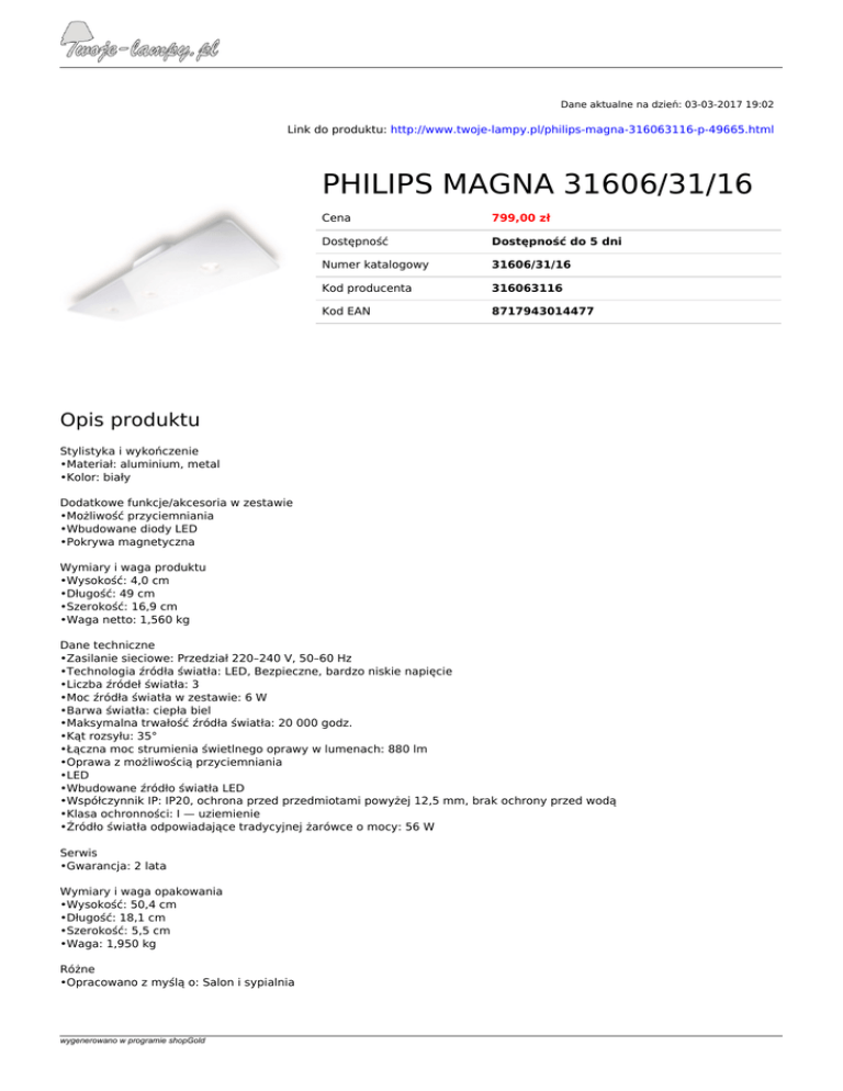 Dane aktualne na dzień: 03-03-2017 19:02 Link do produktu: http://www.twoje-lampy.pl/philips-magna-316063116-p-49665.html PHILIPS MAGNA 31606/31/16 Cena 799,00 zł Dostępność Dostępność do 5 dni Numer katalogowy 31606/31/16 Kod producenta 316063116 Kod EAN 8717943014477 Opis produktu Stylistyka i wykończenie •Materiał: aluminium, metal •Kolor: biały Dodatkowe funkcje/akcesoria w zestawie •Możliwość przyciemniania •Wbudowane diody LED •Pokrywa magnetyczna Wymiary i waga produktu •Wysokość: 4,0 cm •Długość: 49 cm •Szerokość: 16,9 cm •Waga netto: 1,560 kg Dane techniczne •Zasilanie sieciowe: Przedział 220–240 V, 50–60 Hz •Technologia źródła światła: LED, Bezpieczne, bardzo niskie napięcie •Liczba źródeł światła: 3 •Moc źródła światła w zestawie: 6 W •Barwa światła: ciepła biel •Maksymalna trwałość źródła światła: 20 000 godz. •Kąt rozsyłu: 35° •Łączna moc strumienia świetlnego oprawy w lumenach: 880 lm •Oprawa z możliwością przyciemniania •LED •Wbudowane źródło światła LED •Współczynnik IP: IP20, ochrona przed przedmiotami powyżej 12,5 mm, brak ochrony przed wodą •Klasa ochronności: I — uziemienie •Źródło światła odpowiadające tradycyjnej żarówce o mocy: 56 W Serwis •Gwarancja: 2 lata Wymiary i waga opakowania •Wysokość: 50,4 cm •Długość: 18,1 cm •Szerokość: 5,5 cm •Waga: 1,950 kg Różne •Opracowano z myślą o: Salon i sypialnia wygenerowano w programie shopGold •Styl: Nowoczesna •Typ: Oprawa sufitowa wygenerowano w programie shopGold Powered by TCPDF (www.tcpdf.org)