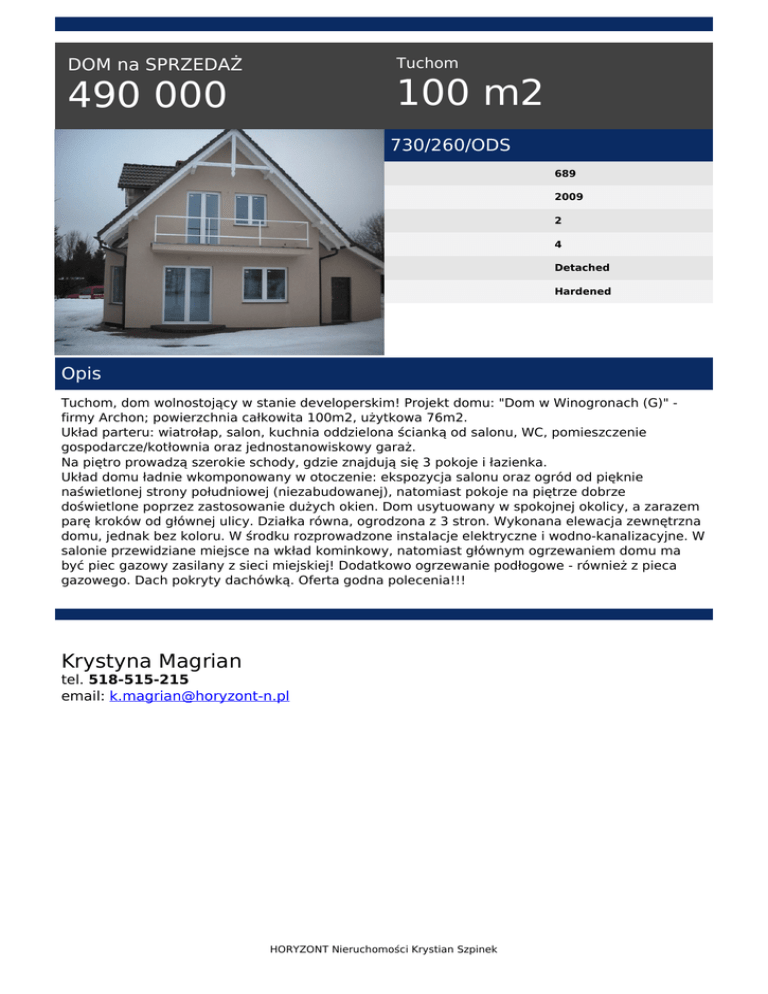 Tuchom DOM na SPRZEDAŻ 100 m2 490 000 730/260/ODS 689 2009 2 4 Detached Hardened Opis Tuchom, dom wolnostojący w stanie developerskim! Projekt domu: "Dom w Winogronach (G)" firmy Archon; powierzchnia całkowita 100m2, użytkowa 76m2. Układ parteru: wiatrołap, salon, kuchnia oddzielona ścianką od salonu, WC, pomieszczenie gospodarcze/kotłownia oraz jednostanowiskowy garaż. Na piętro prowadzą szerokie schody, gdzie znajdują się 3 pokoje i łazienka. Układ domu ładnie wkomponowany w otoczenie: ekspozycja salonu oraz ogród od pięknie naświetlonej strony południowej (niezabudowanej), natomiast pokoje na piętrze dobrze doświetlone poprzez zastosowanie dużych okien. Dom usytuowany w spokojnej okolicy, a zarazem parę kroków od głównej ulicy. Działka równa, ogrodzona z 3 stron. Wykonana elewacja zewnętrzna domu, jednak bez koloru. W środku rozprowadzone instalacje elektryczne i wodno-kanalizacyjne. W salonie przewidziane miejsce na wkład kominkowy, natomiast głównym ogrzewaniem domu ma być piec gazowy zasilany z sieci miejskiej! Dodatkowo ogrzewanie podłogowe - również z pieca gazowego. Dach pokryty dachówką. Oferta godna polecenia!!! Krystyna Magrian tel. 518-515-215 email: [email protected] HORYZONT Nieruchomości Krystian Szpinek Powered by TCPDF (www.tcpdf.org)