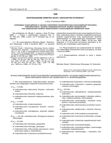 Dziennik Ustaw Nr 63 — 5243 — Poz. 526 526 ROZPORZÑDZENIE MINISTRA NAUKI I SZKOLNICTWA WY˚SZEGO1) z dnia 14 kwietnia 2009 r. zmieniajàce rozporzàdzenie w sprawie wskaêników kosztoch∏onnoÊci poszczególnych kierunków, makrokierunków i studiów mi´dzykierunkowych studiów stacjonarnych oraz stacjonarnych studiów doktoranckich w poszczególnych dziedzinach nauki Na podstawie art. 96 pkt 1 ustawy z dnia 27 lipca 2005 r. — Prawo o szkolnictwie wy˝szym (Dz. U. Nr 164, poz. 1365, z póên. zm.2)) zarzàdza si´, co nast´puje: § 1. W rozporzàdzeniu Ministra Nauki i Szkolnictwa Wy˝szego z dnia 2 kwietnia 2007 r. w sprawie ——————— 1) 2) Minister Nauki i Szkolnictwa Wy˝szego kieruje dzia∏em administracji rzàdowej — szkolnictwo wy˝sze, na podstawie § 1 ust. 2 pkt 2 rozporzàdzenia Prezesa Rady Ministrów z dnia 16 listopada 2007 r. w sprawie szczegó∏owego zakresu dzia∏ania Ministra Nauki i Szkolnictwa Wy˝szego (Dz. U. Nr 216, poz. 1596). Zmiany wymienionej ustawy zosta∏y og∏oszone w Dz. U. z 2006 r. Nr 46, poz. 328, Nr 104, poz. 708 i 711, Nr 144, poz. 1043 i Nr 227, poz. 1658, z 2007 r. Nr 80, poz. 542, Nr 120, poz. 818, Nr 176, poz. 1238 i 1240 i Nr 180, poz. 1280 oraz z 2008 r. Nr 70, poz. 416. wskaêników kosztoch∏onnoÊci poszczególnych kierunków, makrokierunków i studiów mi´dzykierunkowych studiów stacjonarnych oraz stacjonarnych studiów doktoranckich w poszczególnych dziedzinach nauki (Dz. U. Nr 65, poz. 435 oraz z 2008 r. Nr 82, poz. 489) za∏àcznik nr 2 otrzymuje brzmienie okreÊlone w za∏àczniku do niniejszego rozporzàdzenia. § 2. Rozporzàdzenie ma zastosowanie do okreÊlenia wskaêników kosztoch∏onnoÊci poczàwszy od dnia 1 stycznia 2009 r. § 3. Rozporzàdzenie wchodzi w ˝ycie z dniem og∏oszenia. Minister Nauki i Szkolnictwa Wy˝szego: B. Kudrycka Za∏àcznik do rozporzàdzenia Ministra Nauki i Szkolnictwa Wy˝szego z dnia 14 kwietnia 2009 r. (poz. 526) WYKAZ WSKAèNIKÓW KOSZTOCH¸ONNOÂCI MAKROKIERUNKÓW I STUDIÓW MI¢DZYKIERUNKOWYCH ORAZ KIERUNKÓW INNYCH NI˚ OKREÂLONE W § 2 ROZPORZÑDZENIA 1. Dla poszczególnych makrokierunków studiów okreÊla si´ nast´pujàce wskaêniki kosztoch∏onnoÊci: 1) ks1 = 1,0 dla: a) makrokierunku (ekonomia, finanse i rachunkowoÊç), e) makrokierunku (in˝ynieria i ochrona Êrodowiska), f) makrokierunku (in˝ynieria i systemy gospodarowania rolniczego); 5) ks5 = 3,0 dla: b) makrokierunku (filozofia, historia), a) makrokierunku (akwakultura i bezpieczeƒstwo ˝ywnoÊci), c) makrokierunku (stosunki mi´dzynarodowe, ekonomia); b) makrokierunku (automatyka i robotyka, elektronika i telekomunikacja, informatyka), 2) ks2 = 1,5 dla: a) makrokierunku (rosjoznawstwo), b) makrokierunku (zarzàdzanie, finanse i rachunkowoÊç), c) makrokierunku (zarzàdzanie, stosunki mi´dzynarodowe); c) makrokierunku (automatyka i robotyka, zarzàdzanie i in˝ynieria produkcji), d) makrokierunku (bioin˝ynieria produkcji ˝ywnoÊci), e) makrokierunku (elektronika i techniki informacyjne), f) makrokierunku (informatyka przemys∏owa), 3) ks3 = 2,0 dla makrokierunku filologiczno-kulturoznawczego; g) makrokierunku (in˝ynieria Êrodowiska i energetyka), 4) ks4 = 2,5 dla: h) makrokierunku (materia∏y wspó∏czesnych technologii), a) makrokierunku (biologia, geografia), b) makrokierunku (biologia, geologia), c) makrokierunku (informatyka stosowana z komputerowà naukà o materia∏ach), d) makrokierunku (in˝ynieria architektoniczna), i) makrokierunku (nanotechnologia), j) makrokierunku (nanotechnologia i technologie procesów materia∏owych), k) makrokierunku (technologia i in˝ynieria chemiczna). Dziennik Ustaw Nr 63 — 5244 — 2. Dla poszczególnych studiów mi´dzykierunkowych okreÊla si´ nast´pujàce wskaêniki kosztoch∏onnoÊci: 1) ks1 = 1,0 dla mi´dzykierunkowych (mi´dzywydzia∏owych) studiów humanistycznych; 2) ks2 = 1,5 dla mi´dzykierunkowych (mi´dzywydzia∏owych) studiów matematyka i ekonomia; 3) ks4 = 2,5 dla: a) mi´dzykierunkowych (mi´dzywydzia∏owych) studiów matematyczno-przyrodniczych, b) mi´dzykierunkowych (mi´dzywydzia∏owych) studiów ochrony Êrodowiska; 4) ks5 = 3,0 dla mi´dzykierunkowych (mi´dzywydzia∏owych) studiów in˝ynieria Êrodowiska i energetyka. 3. Dla poszczególnych kierunków, innych ni˝ okreÊlone w § 2 rozporzàdzenia, okreÊla si´ nast´pujàce wskaêniki kosztoch∏onnoÊci: 1) ks1 = 1,0 dla kierunków: a) artes liberales (Uniwersytet Warszawski), Poz. 526 3) ks4 = 2,5 dla kierunków: a) akustyka (Uniwersytet im. Adama Mickiewicza w Poznaniu), b) biofizyka (Uniwersytet Jagielloƒski w Krakowie, Uniwersytet im. Adama Mickiewicza w Poznaniu), c) geofizyka (Uniwersytet Âlàski w Katowicach, Akademia Górniczo-Hutnicza im. Stanis∏awa Staszica w Krakowie), d) informatyka stosowana (Akademia Górniczo-Hutnicza im. Stanis∏awa Staszica w Krakowie, Uniwersytet Miko∏aja Kopernika w Toruniu), e) intermedia (Akademia Sztuk Pi´knych im. Jana Matejki w Krakowie), f) in˝ynieria bezpieczeƒstwa pracy (Politechnika ¸ódzka), g) muzyka koÊcielna (Akademia Muzyczna w Krakowie, Papieska Akademia Teologiczna w Krakowie), h) nauki Êcis∏e (Uniwersytet Kardyna∏a Stefana Wyszyƒskiego w Warszawie), b) ekonomiczna analiza prawa (Szko∏a G∏ówna Handlowa w Warszawie), i) neurobiologia (Uniwersytet Jagielloƒski w Krakowie), c) gospodarka i administracja publiczna (Uniwersytet Ekonomiczny w Krakowie), j) sztuka mediów (Akademia Sztuk Pi´knych w Warszawie, Akademia Sztuk Pi´knych we Wroc∏awiu), d) komunikacja europejska (Uniwersytet im. Adama Mickiewicza w Poznaniu), e) mi´dzynarodowe stosunki gospodarcze (Uniwersytet Gdaƒski, Uniwersytet ¸ódzki, Szko∏a G∏ówna Handlowa w Warszawie, Uniwersytet Ekonomiczny w Krakowie, Akademia Ekonomiczna im. Karola Adamieckiego w Katowicach, Uniwersytet Ekonomiczny w Poznaniu, Uniwersytet Ekonomiczny we Wroc∏awiu), f) religioznawstwo (Uniwersytet Jagielloƒski w Krakowie, Uniwersytet Gda