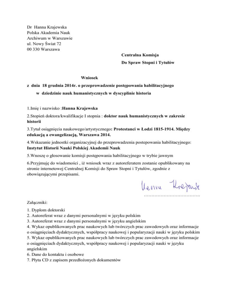 Dr Hanna Krajewska Polska Akademia Nauk Archiwum w Warszawie ul. Nowy Świat 72 00 330 Warszawa Centralna Komisja Do Spraw Stopni i Tytułów Wniosek z dnia 18 grudnia 2014r. o przeprowadzenie postępowania habilitacyjnego w dziedzinie nauk humanistycznych w dyscyplinie historia 1.Imię i nazwisko :Hanna Krajewska 2.Stopień doktora/kwalifikacje I stopnia : doktor nauk humanistycznych w zakresie historii 3.Tytuł osiągnięcia naukowego/artystycznego: Protestanci w Łodzi 1815-1914. Między edukacją a ewangelizacją, Warszawa 2014. 4.Wskazanie jednostki organizacyjnej do przeprowadzenia postepowania habilitacyjnego: Instytut Historii Nauki Polskiej Akademii Nauk 5.Wnoszę o głosowanie komisji postępowania habilitacyjnego w trybie jawnym 6.Przyjmuję do wiadomości , iż wniosek wraz z autoreferatem zostanie opublikowany na stronie internetowej Centralnej Komisji do Spraw Stopni i Tytułów, zgodnie z obowiązującymi przepisami. ………………………………. Załączniki: 1. Dyplom doktorski 2. Autoreferat wraz z danymi personalnymi w języku polskim 3. Autoreferat wraz z danymi personalnymi w języku angielskim 4. Wykaz opublikowanych prac naukowych lub twórczych prac zawodowych oraz informacje o osiągnięciach dydaktycznych, współpracy naukowej i popularyzacji nauki w języku polskim 5. Wykaz opublikowanych prac naukowych lub twórczych prac zawodowych oraz informacje o osiągnięciach dydaktycznych, współpracy naukowej i popularyzacji nauki w języku angielskim 6. Dane do kontaktu i osobowe 7. Płyta CD z zapisem przedłożonych dokumentów