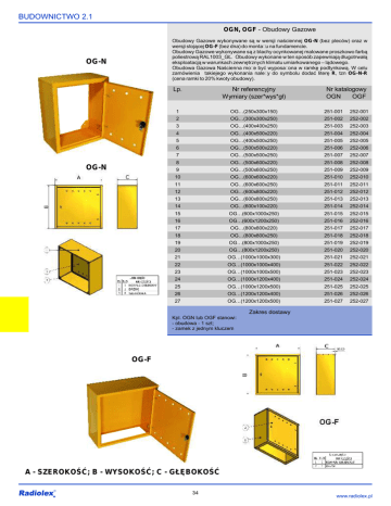 BUDOWNICTWO 2.1 OGN, OGF - Obudowy Gazowe Obudowy Gazowe wykonywane są w wersji naściennej OG-N (bez pleców) oraz w wersji stojącej OG-F (bez dna) do montażu na fundamencie. Obudowy Gazowe wykonywane są z blachy ocynkowanej malowane proszkowo farbą poliestrową RAL1003_GŁ. Obudowy wykonane w ten sposób zapewniają długotrwałą eksploatacją w warunkach zewnętrznych klimatu umiarkowanego – lądowego. Obudowa Gazowa Naścienna może być wyposażona w ramkę podtynkową. W celu zamówienia takiejego wykonania należy do symbolu dodać literę R, tzn OG-N-R (cena ramki to 20% kwoty obudowy). OG-N OG-N Lp. Nr referencyjny Wymiary (szer*wys*gł) Nr katalogowy OGN OGF 1 OG…(250x300x150) 251-001 252-001 2 OG…(300x300x250) 251-002 252-002 3 OG…(400x400x250) 251-003 252-003 4 OG…(400x500x220) 251-004 252-004 5 OG…(400x500x250) 251-005 252-005 6 OG…(500x500x220) 251-006 252-006 7 OG…(500x500x250) 251-007 252-007 8 OG…(500x600x220) 251-008 252-008 9 OG…(500x600x250) 251-009 252-009 10 OG…(600x600x220) 251-010 252-010 11 OG…(600x600x250) 251-011 252-011 12 OG…(600x800x220) 251-012 252-012 13 OG…(600x800x250) 251-013 252-013 14 OG…(600x100x220) 251-014 252-014 15 OG…(600x1000x250) 251-015 252-015 16 OG…(600x1200x250) 251-016 252-016 17 OG…(800x800x220) 251-017 252-017 18 OG…(800x800x250) 251-018 252-018 19 OG…(800x1000x250) 251-019 252-019 20 OG…(800x1200x250) 251-020 252-020 21 OG…(1000x1000x300) 251-021 252-021 22 OG…(1000x1000x400) 251-022 252-022 23 OG…(1000x1000x500) 251-023 252-023 24 OG…(1000x1200x400) 251-024 252-024 25 OG…(1000x1200x500) 251-025 252-025 26 OG…(1200x1200x400) 251-026 252-026 27 OG…(1200x1200x500) 251-027 252-027 Zakres dostawy Kpl. OGN lub OGF stanowi: - obudowa - 1 szt; - zamek z jednym kluczem OG-F OG-F A - SZEROKOŚĆ; B - WYSOKOŚĆ; C - GŁĘBOKOŚĆ Radiolex R 34 www.radiolex.pl '$<$$ 3 5 ' # ' ' # # 3 ' 5 ' )*+,- )*, )*. )*, )*. )*, !" - -6786 9:; 1 !2 4 - #$$%&$#&'( . , *0 '/' * 1 2 * * / * 1 * 2 1 / $%&'($%' $%)$%' $%)$%' ( (4564 37 -. .0 30. ( !!"#! # ! )' %, *+*
