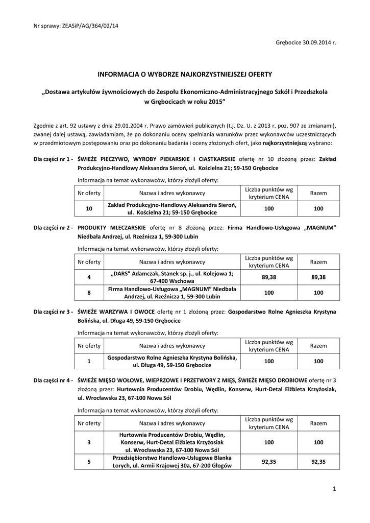 Nr sprawy: ZEASiP/AG/364/02/14 Grębocice 30.09.2014 r. INFORMACJA O WYBORZE NAJKORZYSTNIEJSZEJ OFERTY „Dostawa artykułów żywnościowych do Zespołu Ekonomiczno-Administracyjnego Szkół i Przedszkola w Grębocicach w roku 2015” Zgodnie z art. 92 ustawy z dnia 29.01.2004 r. Prawo zamówień publicznych (t.j. Dz. U. z 2013 r. poz. 907 ze zmianami), zwanej dalej ustawą, zawiadamiam, że po dokonaniu oceny spełniania warunków przez wykonawców uczestniczących w przedmiotowym postępowaniu oraz po dokonaniu badania i oceny złożonych ofert, jako najkorzystniejszą wybrano: Dla części nr 1 - ŚWIEŻE PIECZYWO, WYROBY PIEKARSKIE I CIASTKARSKIE ofertę nr 10 złożoną przez: Zakład Produkcyjno-Handlowy Aleksandra Sieroń, ul. Kościelna 21; 59-150 Grębocice Informacja na temat wykonawców, którzy złożyli oferty: Nr oferty Nazwa i adres wykonawcy Liczba punktów wg kryterium CENA Razem 10 Zakład Produkcyjno-Handlowy Aleksandra Sieroń, ul. Kościelna 21; 59-150 Grębocice 100 100 Dla części nr 2 - PRODUKTY MLECZARSKIE ofertę nr 8 złożoną przez: Firma Handlowo-Usługowa „MAGNUM” Niedbała Andrzej, ul. Rzeźnicza 1, 59-300 Lubin Informacja na temat wykonawców, którzy złożyli oferty: Nr oferty 4 8 Nazwa i adres wykonawcy „DARS” Adamczak, Stanek sp. j., ul. Kolejowa 1; 67-400 Wschowa Firma Handlowo-Usługowa „MAGNUM” Niedbała Andrzej, ul. Rzeźnicza 1, 59-300 Lubin Liczba punktów wg kryterium CENA Razem 89,38 89,38 100 100 Dla części nr 3 - ŚWIEŻE WARZYWA I OWOCE ofertę nr 1 złożoną przez: Gospodarstwo Rolne Agnieszka Krystyna Bolińska, ul. Długa 49, 59-150 Grębocice Informacja na temat wykonawców, którzy złożyli oferty: Nr oferty Nazwa i adres wykonawcy Liczba punktów wg kryterium CENA Razem 1 Gospodarstwo Rolne Agnieszka Krystyna Bolińska, ul. Długa 49, 59-150 Grębocice 100 100 Dla części nr 4 - ŚWIEŻE MIĘSO WOŁOWE, WIEPRZOWE I PRZETWORY Z MIĘS, ŚWIEŻE MIĘSO DROBIOWE ofertę nr 3 złożoną przez: Hurtownia Producentów Drobiu, Wędlin, Konserw, Hurt-Detal Elżbieta Krzyżosiak, ul. Wrocławska 23, 67-100 Nowa Sól Informacja na temat wykonawców, którzy złożyli oferty: Nr oferty 3 5 Nazwa i adres wykonawcy Hurtownia Producentów Drobiu, Wędlin, Konserw, Hurt-Detal Elżbieta Krzyżosiak ul. Wrocławska 23, 67-100 Nowa Sól Przedsiębiorstwo Handlowo-Usługowe Blanka Lorych, ul. Armii Krajowej 30a, 67-200 Głogów Liczba punktów wg kryterium CENA Razem 100 100 92,35 92,35 1 Nr sprawy: ZEASiP/AG/364/02/14 6 Sklep Mięsno-Wędliniarski Zofia Krakowiak ul. Głogowska 7, 59-150 Grębocice 98,57 98,57 Dla części nr 5 - PRZETWORZONE WARZYWA I OWOCE, RYBY MROŻONE, FILETY RYBNE I POZOSTAŁE MIĘSO Z RYB ofertę nr 9, złożoną przez: REN sp. z o.o. ul. Tartaczna 3, 26-600 Radom, Oddział Zielona Góra, ul. Trasa Północna 3; 65-001 Zielona Góra Informacja na temat wykonawców, którzy złożyli oferty: Nr oferty 2 7 Nazwa i adres wykonawcy Liczba punktów wg kryterium CENA Razem 90,65 90,65 100 100 Hurtownia >>WIDAN<< eksport-import mgr inż. Danuta Malczyńska ul. Jasińskiego 56b, 37-700 Przemyśl REN sp. z o.o. ul. Tartaczna 3, 26-600 Radom, Oddział Zielona Góra, ul. Trasa Północna 3; 65-001 Zielona Góra Dla części nr 6 - ARTYKUŁY OGÓLNOSPOŻYWCZE, JAJA ofertę nr 8 złożoną przez: Firma Handlowo-Usługowa „MAGNUM” Niedbała Andrzej, ul. Rzeźnicza 1, 59-300 Lubin Informacja na temat wykonawców, którzy złożyli oferty: Nr oferty 8 9 Nazwa i adres wykonawcy Liczba punktów wg kryterium CENA Razem 100 100 97,34 97,34 Firma Handlowo-Usługowa „MAGNUM” Niedbała Andrzej, ul. Rzeźnicza 1, 59-300 Lubin Krystyna, Krzysztof Szumińscy s. j. SZUMEX Hurtownia Artykułów Spożywczych i Przemysłowych, ul. Mickiewicza 50; 67-200 Głogów INFORMACJA NA TEMAT ODRZUCONYCH OFERT: Żadna z ofert nie została odrzucona Renata Oleszczuk Dyrektor ZEASiP Otrzymują: 1. Gospodarstwo Rolne Agnieszka Krystyna Bolińska, ul. Długa 49, 59-150 Grębocice 2. Hurtownia >>WIDAN<< export-import mgr inż. Danuta Malczyńska, ul. Jasińskiego 56B, 37-700 Przemyśl 3. Hurtownia Producentów Drobiu, Wędlin, Konserw, Hurt-Detal Elżbieta Krzyżosiak, ul. Wroclawska 23, 67-100 Nowa Sól 4. „DARS” Adamczak, Stanek sp. j., ul. Kolejowa 1; 67-400 Wschowa 5. Przedsiębiorstwo Handlowo-Usługowe Blanka Lorych ul. Armii Krajowej 30A, 67-200 Głogów 6. Sklep Mięsno-Wędliniarski Zofia Krakowiak, ul. Głogowska 7; 59-150 Grębocice 7. REN sp. z o.o. ul. Tartaczna 3, 26-600 Radom, Oddział Zielona Góra, ul. Trasa Północna 3; 65-001 Zielona Góra 8. Firma Handlowo-Usługowa „MAGNUM” Niedbała Andrzej, ul. Rzeźnicza 1, 59-300 Lubin 9. Krystyna, Krzysztof Szumińscy s. j. SZUMEX Hurtownia Artykułów Spożywczych i Przemysłowych, ul. Mickiewicza 50; 67-200 Głogów 10. Zakład Produkcyjno-Handlowy Aleksandra Sieroń, ul. Kościelna 21; 59 150 Grębocice 2