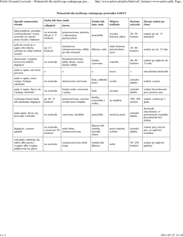 Polski Związek Łowiecki - Wskazówki dla myśliwego szukającego pos... 1z1 http://www.pzlow.pl/palio/html.run?_Instance=www.pzlow.pl&_Page... Wskazówki dla myśliwego szukającego postrzałka SARNY Sposób zaznaczenia strzału Farba lub inne znaki Ścinka lub inny znak Miejsce trafienia Dystans ucieczki Zacząć szukać po /inne/ odległość barwa lekki podskok, przednie cewki położone wyżej, ucieczka na wprost przez krzaki z hałasem na zestrzale lub po 3- 5 krokach jasnoczerwona, pienista, z obecnością jasnożółta pęcherzyków wysoka komora, płuca 20- 50 kroków szukać po ok. 15 minutach jeśli nie zwali się w ogniu robi rakietę, uchodzi na oślep niskimi susami po 3-5 krokach karminowa, ciemnoczerwona, obfita po obu stronach dłuższa, ruda niska komora, przestrzelone serce 10- 40 kroków szukać po ok. 15 min. skurczenie, wygięcie krzyża ku dołowi, drgnięcie na zestrzale brunatnoczerwona, jakby tłusta, często bardzo obfita krótka, czerwona wątroba 40- 80 kroków szukać po upływie ok. 15 min. pada w ogniu, nie może powstać x x x krzyż x natychmiast dostrzelić pada w ogniu, zaraz wstaje i kulejąc odchodzi na zestrzale intensywnie czerwona brak, odłamki cewka kości uchodzi daleko szukać z psem pada w ogniu, tłucze się i kulejąc odchodzi na zestrzale bardzo mało, czerwona z pianą brak szczęka uchodzi daleko szukać bezzwłocznie przy pomocy psa wykonuje barani skok, lub minimalne drgnięcie po 10- 15 krokach jasnoczerwona, zawiera resztki treści żołądka krótka, szarożółta z wełną na miękkie 100- 300 metróe szukać z psem po 1 godz. pada ogniu, tłucze się, powstaje i uchodzi na zestrzale drgnięcie, czasem upadek na zestrzale, mało farby, czasem po 50 ciemnoczerwona krokach zad jakby załamuje się, tułów albo prosty i wygięty albo wygięty pałąkowato ku górze na zestrzale czerwona, nieobfita ciemnoczerwona obok tropu jasnożółta strzał na puste uchodzi daleko dostrzelić natychmiast, w przeciwnym wypadku poszukiwnie bez efektu dłuższa lub średnia, kawałki mięsa przez mięśnie, ocierka uchodzi daleko szukać przy użyciu psa, na ogół bez rezultatu średnia lub dłuższa nerki 50- 250 kroków szukać po upływie godziny 2011-07-27 15:10