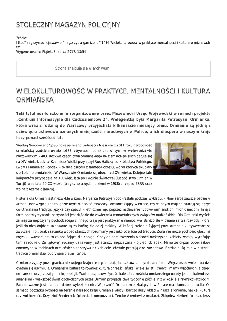 STOŁECZNY MAGAZYN POLICYJNY Źródło: http://magazyn.policja.waw.pl/mag/z-zycia-garnizonu/41436,Wielokulturowosc-w-praktyce-mentalnosci-i-kultura-ormianska.h tml Wygenerowano: Piątek, 3 marca 2017, 18:54 Strona znajduje się w archiwum. WIELOKULTUROWOŚĆ W PRAKTYCE, MENTALNOŚCI I KULTURA ORMIAŃSKA Taki tytuł nosiło szkolenie zorganizowane przez Mazowiecki Urząd Wojewódzki w ramach projektu „Centrum Informacyjne dla Cudzoziemców 2”. Prelegentką była Margarita Petrosyan, Ormianka, która wraz z rodziną do Warszawy przyjechała kilkanaście miesięcy temu. Ormianie są jedną z dziewięciu ustawowo uznanych mniejszości narodowych w Polsce, a ich diaspora w naszym kraju liczy ponad sześćset lat. Według Narodowego Spisu Powszechnego Ludności i Mieszkań z 2011 roku narodowość ormiańską zadeklarowało 1683 obywateli polskich, w tym w województwie mazowieckim – 403. Rozkwit osadnictwa ormiańskiego na ziemiach polskich datuje się na XIV wiek, kiedy to Kazimierz Wielki przyłączył Ruś Halicką do Królestwa Polskiego. Lwów i Kamieniec Podolski - to dwa ośrodki z tamtego okresu, wokół których skupiały się kolonie ormiańskie. W Warszawie Ormianie są obecni od XVI wieku. Kolejne fale imigrantów przypadają na XIX wiek, lata po I wojnie światowej (ludobójstwo Ormian w Turcji) oraz lata 90 XX wieku (tragiczne trzęsienie ziemi w 1988r., rozpad ZSRR oraz wojna z Azerbejdżanem). Historia dla Ormian jest niezwykle ważna. Margarita Petrosyan podkreślała podczas wykładu: – Moje serce zawsze będzie w Armenii bez względu na to, gdzie będę mieszkać. Wszyscy Ormianie żyjący w Polsce, czy w innych krajach, starają się dążyć do utrwalania tradycji, języka czy specyfiki etnicznej, np. poprzez nadawanie typowo ormiańskich imion dzieciom. Inną z form podtrzymywania odrębności jest dążenie do zawierania monoetnicznych związków małżeńskich. Dla Ormianki wyjście za mąż za mężczyznę pochodzącego z innego kraju jest praktycznie niemożliwe. Bardzo źle widziane są też rozwody, które, jeśli do nich dojdzie, uznawane są za hańbę dla całej rodziny. W każdej rodzinie żyjącej poza Armenią kultywowane są zwyczaje, np.: brak szacunku wobec starszych rozumiany jest jako odejście od tradycji. Żona nie może podnosić głosu na męża – uważane jest to za poniżające dla obojga. Kiedy do pomieszczenia wchodzi mężczyzna, kobiety wstają, wyrażając tym szacunek. Za „głowę” rodziny uznawany jest starszy mężczyzna – ojciec, dziadek. Mimo że ciężar obowiązków domowych w rodzinach ormiańskich spoczywa na kobiecie, chętnie pracują one zawodowo. Bardzo dużą rolę w historii i tradycji ormiańskiej odgrywają pieśni i tańce. Ormianie żyjący poza granicami swojego kraju nie ograniczają kontaktów z innymi narodami. Wręcz przeciwnie – bardzo chętnie się asymilują. Ormiańska kultura to również kultura chrześcijańska. Wiele świąt i tradycji mamy wspólnych, a dzieci ormiańskie uczęszczają na lekcje religii. Warto tutaj zauważyć, że kalendarz kościoła ormiańskiego oparty jest na kalendarzu juliańskim - większość świąt obchodzonych przez Ormian przypada dwa tygodnie później niż w kościele rzymskokatolickim. Bardzo ważne jest dla nich dobre wykształcenie. Większość Ormian mieszkających w Polsce ma skończone studia. Od samego początku bytności na terenie naszego kraju Ormianie włożyli bardzo duży wkład w naszą ekonomię, naukę, kulturę czy wojskowość. Krzysztof Penderecki (pianista i kompozytor), Teodor Axentowicz (malarz), Zbigniew Herbert (poeta), Jerzy Kawalerowicz (reżyser filmowy) czy Grzegorz Miecugow (dziennikarz) to zaledwie kilka znanych osób, które mają ormiańskie korzenie. W Polsce działa kilkanaście organizacji i grup nieformalnych, w których Ormianie kontynuują swoje wielowiekowe tradycje, np. Fundacja Kultury i Dziedzictwa Ormian Polskich, Fundacja Ormiańska KZKO czy Fundacja Polsko – Ormiańska. W Warszawie mieści się też redakcja jedynego dwujęzycznego - polsko-ormiańskiego czasopisma „Awedis”. Agnieszka Włodarska źródło: Edgar Broyan, Fundacja Kultury i Dziedzictwa Ormian Polskich ZAŁĄCZNIKI DO STRONY Stołeczny Magazyn Policyjny - nr 08/2013 3.74 MB Ocena: 0/5 (0) Tweetnij