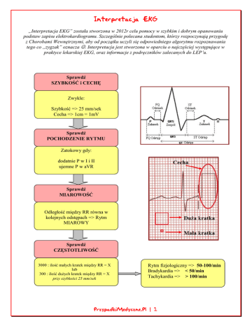 Interpretacja EKG „Interpretacja EKG” została stworzona w 2012r celu pomocy w szybkim i dobrym opanowaniu podstaw zapisu elektrokardiogramu. Szczególnie polecana studentom, którzy rozpoczynają przygodę z Chorobami Wewnętrznymi, aby od początku uczyli się odpowiedniego algorytmu rozpoznawania tego co „zygzak” oznacza . Interpretacja jest stworzona w oparciu o najczęściej występujące w praktyce lekarskiej EKG, oraz informacje z podręczników zalecanych do LEP’u. Sprawdź SZYBKOŚĆ i CECHĘ Zwykle: Szybkość => 25 mm/sek Cecha => 1cm = 1mV Sprawdź POCHODZENIE RYTMU Zatokowy gdy: dodatnie P w I i II ujemne P w aVR Sprawdź MIAROWOŚĆ Odległość między RR równa w kolejnych odstępach => Rytm MIAROWY Sprawdź CZĘSTOTLIWOŚĆ 3000 : ilość małych kratek między RR = X lub 300 : ilość dużych kratek między RR = X przy szybkości 25 mm/sek Rytm fizjologiczny => 50-100/min Bradykardia => < 50/min Tachykardia => > 100/min PrzypadkiMedyczne.Pl | 1 Interpretacja EKG – ocena morfologiczna 1. 2. 3. 4. Ocena morfologiczna I Nomogram Dekstrogram Lewogram fizjologiczny Lewogram patologiczny II 1. 2. 3. 4. III Załamek P Zespół QRS Poszerzony >= 0,12 sek Przerost Bloki AV P mitrale Wysoki > 2,5 mm (kończynowe) > 3 mm (przedsercowe) Powiększenie prawego A ↑ napięcia ukł. Współczulnego P pulmonale P kordiale Niewidoczne Tachykardia Bloki AV Poszerzony > 0,12 sek LBBB lub RBBB Zespół preekscytacji Rytm / pobudzenie komorowe Nieprawidłowe Q i QS Zawał serca Ogłuszenie serca Kardiomiopatie Zespół preekscytacji LBBB lub RBBB Uniesienie ST Dwufazowe -> „fala F” Trzepotanie (250-350/min) Różnokształtne -> „fala f” Migotanie (350-600/min) ↑ J >= 2mm w V1-V3 + ↑ ST skośnie do dołu Z. Brugadów Odcinek PQ ↓ skośne w dół ↑ prawego A ↓ poziome Ostre zapalenie wsierdzia Odstęp PQ wydłużenie Blok AV skrócenie Zespół preekscytacji Hipersympatykotonia ↑ J z wklęsłym ST (przedsercowe) Z. wczesnej repolaryzacji VV ↑ ST poziome/wypukłe (fala Pardeego) Pełnościenne niedokrwienie Zawał serca ↑ ST poziome + przeciwstawne ↓ w aVR i V1 Ostra faza zapalenia osierdzia ↑ skośny do góry Hiperwagotonia LBBB / RBBB Zespół preekscyctacji PrzypadkiMedyczne.Pl | 2 Interpretacja EKG Obniżenie ST Załamek T Skośne do góry Rzadko – niedokrwienie LV Poziome Niedokrwienie serca Rzadko fizjologicznie Skośne do dołu Niedokrwienie serca Przerost LV RBBB/LBBB Zespół WPW Głębokie ujemne w V2-V3 Zawał serca Zapalenie mięśnia sercowego Kardiomiopatia przerostowa Rzadko- guz chromochłonny Rzadko- udar mózgu Wysokie Fizjologiczne Ostre niedokrwienie serca Hiperkaliemia Płaskie Nieswoiste (ch. Tarczycy, leki, inne) Odstęp QT Dwufazowe ujemno-dodatnie i ujemne RBBB/LBBB Zespół WPW Przedwczesne/dodatkowe pobudzenia Rytmy komorowe Krótki <0,3 sek. Hiperkaliemia Hiperalcemia Hipotermia Wrodzony Długi >=0,45 mężczyzni >=0,46 kobiety LQTS – wrodzony zespół długiego QT Załamek U Może być niewidoczny w EKG Wysoki Hipokaliemia Guz chromochłonny Udar mózgu LGTS Ujemne Niedokrwienie serca Świeży zawał serca Przerost LV PrzypadkiMedyczne.Pl | 3 Interpretacja EKG – zaburzenia elektrolitowe ↑ K+ <5,5 mmol/l 5,5-7,5 mmol/l ↑ amplitudy T zwężenie T skrócenie QT >7,5 mmol/l poszerzenie z. QRS spłaszczenie P wydłużenie odst. PQ ↓K+ asystolia migotanie komór VF Hipokaliemia Bardziej zaawansowana Ok. <2,5 mmol/l <3,5 mmol/l ↓ amplitudy T ↓ odc. ST ↑ ampli. i szer. U ↑ Ca+ Hiperkaliemia ↑ odst. PQ poszerz. z. RS torsade de pointes przedwcz. pobudz. V ↓Ca+ Hiperkalcemia skrócenie/zanik ST skrócenie QT Hipokalcemia wydłużenie ST wydłużenie ods. QT ↑ Ca+ + ↓K+ Krótkie ods. QT Wys. i szer. U PrzypadkiMedyczne.Pl | 4