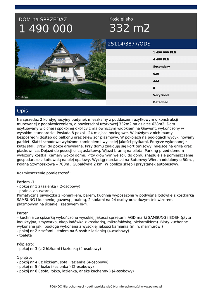 DOM na SPRZEDAŻ 1 490 000 Kościelisko 332 m2 25114/3877/ODS 1 490 000 PLN 4 488 PLN Secondary 630 332 8 VeryGood Detached Opis Na sprzedaż 2 kondygnacyjny budynek mieszkalny z poddaszem użytkowym o konstrukcji murowanej z podpiwniczeniem, o powierzchni użytkowej 332m2 na działce 628m2. Dom usytuowany w cichej i spokojnej okolicy z malowniczym widokiem na Giewont, wykończony w wysokim standardzie. Posiada 8 pokoi - 24 miejsca noclegowe. W każdym z nich mamy bezpośredni dostęp do balkonu oraz telewizor plazmowy. W pokojach na podłogach wycyklinowany parkiet. Klatki schodowe wyłożone kamieniem i wysokiej jakości płytkami. Poręcze wykonanej z kutej stali. Drzwi do pokoi drewniane. Przy domu znajduję się kort tenisowy, miejsce na grilla oraz piaskownica. Dojazd do posesji ulicą asfaltową. Wjazd bramą na pilota. Parking przed domem wyłożony kostką. Kamery wokół domu. Przy głównym wejściu do domu znajduję się pomieszczenie gospodarcze z kotłownią na olej opałowy. Wyciąg narciarski na Butorowy Wierch oddalony o 50m. , Polana Szymoszkowa – 700m , Gubałówka 2 km. W pobliżu sklep i przystanek autobusowy. Rozmieszczenie pomieszczeń: Poziom -1: - pokój nr 1 z łazienką ( 2-osobowy) - pralnia z suszarnią Klimatyczna piwniczka z kominkiem, barem, kuchnią wyposażoną w podwójną lodówkę z kostkarką SAMSUNG i kuchenkę gazową , toaletą, 2 stołami na 24 osoby oraz dużym telewizorem plazmowym na ścianie i zestawem hi-fi. Parter – kuchnia ze spiżarką wykończona wysokiej jakości sprzętami AGD marki SAMSUNG i BOSH (płyta indukcyjna, zmywarka, okap lodówka z kostkarką, mikrofalówką, piekarnikiem). Blaty kuchenne wykonane jak i podłoga wykonana z wysokiej jakości kamienia (m.in. marmurów ) - pokój nr 2 z sofami i stołem na 6 osób z łazienką (4-osobowy) - toaleta Półpiętro: - pokój nr 3 (z 2 łóżkami i łazienką (4-osobowy) 1 piętro: - pokój nr 4 ( z łóżkiem, sofą i łazienką (4-osobowy) - pokój nr 5 ( łóżko i łazienka ) (2-osobowy) - pokój nr 6 ( sofa, łóżko, łazienka, aneks kuchenny ) (4-osobowy) PÓŁNOC Nieruchomości - ogólnopolska sieć biur nieruchomości www.polnoc.pl 2 piętro: - pokój nr 7 ( sofa i łazienka ) (2-osobowy) - pokój nr 8 ( sofa, 2 łóżka pojedyncze ) (4-osobowy) Zapraszamy do obejrzenia apartamentu za pośrednictwem Naszego biura! GWARANTUJEMY: - BEZPIECZNĄ transakcję - ofertę kredytową kilku Banków - pełną opiekę prawną Więcej ofert znajdziesz na naszej stronie www.polnoc.pl * UWAGA! Zamieszczone na naszych stronach oferty nie stanowią oferty w rozumieniu Kodeksu Cywilnego, a dane w nich zawarte mają jedynie charakter informacyjny. Katarzyna Zielińska tel. 508-608-128 email: [email protected] PÓŁNOC Nieruchomości - ogólnopolska sieć biur nieruchomości www.polnoc.pl Powered by TCPDF (www.tcpdf.org)