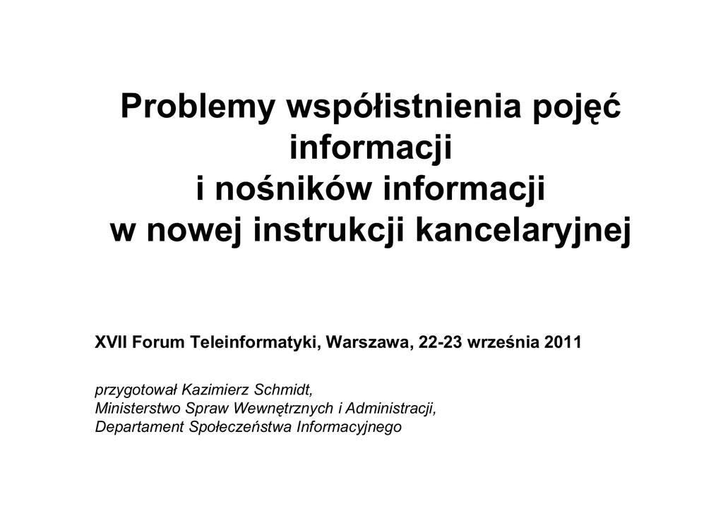 Problemy współistnienia pojęć informacji i nośników informacji w nowej instrukcji kancelaryjnej XVII Forum Teleinformatyki, Warszawa, 22-23 września 2011 przygotował Kazimierz Schmidt, Ministerstwo Spraw Wewnętrznych i Administracji, Departament Społeczeństwa Informacyjnego Czego dotyczy • „Nowa instrukcja kancelaryjna” oznacza instrukcję kancelaryjną stanowiącą załącznik nr 1 do Rozporządzenie Prezesa Rady Ministrów z dnia 18 stycznia 2011 r. w sprawie instrukcji kancelaryjnej, jednolitych rzeczowych wykazów akt oraz instrukcji w sprawie organizacji i zakresu działania archiwów zakładowych (Dz.U. z 2011 nr 14 poz. 67). • Dotyczy więc tylko: – organów gminy i związków międzygminnych oraz urzędów obsługujących te organy i związki; – organów powiatu i starostw powiatowych; – organów samorządu województwa i urzędów marszałkowskich; – organów zespolonej administracji rządowej w województwie i urzędów obsługujących te organy. Zatem np. szkół, przedszkoli i ministerstw już nie (zob. Ustawa o narodowym zasobie archiwalnym i archiwach art. 6 ust. 2a) Czego dotyczy 2 • Co to jest „informacja” • Co to jest „nośnik informacji” • Dla potrzeb tego opracowania: – za informację jaka napłynęła do urzędu należy rozumieć pismo zapraszające na XVII Forum Teleinformatyki przesłane faksem, następnie tę samą treść przesłaną w kopercie, następnie tę samą treść przysłaną pocztą elektroniczną (mimo że wiedza urzędu będzie się za każdym razem zwiększała tylko o to że ponownie przesłano tę samą informację tylko że w inny sposób). – przyjmijmy na chwilę, że informacja to dane uporządkowane i przekazane w kontekście umożliwiającym ich zrozumienie niekoniecznie „użyteczne” lub „zmniejszające poziom niepewności” jak można doszukać się w niektórych definicjach. – celowo nie wskazuję definicji ponieważ ustawie archiwalnej jest mowa o „dokumentacji” i dlatego nie ma potrzeby wzbudzać dyskusji na ten temat (zob. też tekst uzupełniający do prezentacji) Nośnik papierowy czy … • Tym niemniej na podanym przykładzie można znakomicie pokazać problemy organizacyjne na jakie natrafia podmiot publiczny działający w warunkach przejściowych – z systemów opartych o informację zapisaną na papierze (czytaj: nośniku) do systemów opartych o informację zapisaną … no właśnie jak? – w postaci (formie) elektronicznej, forma lub postać – w postaci (formie) cyfrowej, – na informatycznym nośniku danych, nadal nośnik! – na elektronicznym nośniku informacji, – w bazie danych, stary i nowy sposób aby uniknąć powyższych – w systemie teleinformatycznym – W BIP, na ePUAP, w Centralnej Ewidencji... konkret Dualizm nośnikowo-nienośnikowy • W przypadku informacji utrwalonej i przesyłanej na papierze podmiot będzie musiał te papiery przyjąć (ale także inne nośniki) i oznakować (np. pieczęć wpływu) – będzie zmuszony zarządzać nośnikami. Z tym że może na nośniku może być: – informacja trwale związana z nośnikiem (np. pismo ma papierze, fotografia analogowa), – lnformacja nietrwale związana z nośnikiem (np. płyta DVD z nagraniem dźwiękowym) • W przypadku informacji przesłanej środkami komunikacji elektronicznej ważne jest aby możliwe wyodrębnienie zbiorów stanowiących odrębne „całości znaczeniowe” – czyli dokumentów elektronicznych (zob. definicję dokumentu elektronicznego z ustawy o informatyzacji), Urząd musi sobie poradzić i z jednym, i z drugim ponieważ załatwianie spraw „w formie elektronicznej” jest dopuszczone prawem, ale nie jest obowiązkiem i w każdej chwili strony mogą chcieć „przejść na papier” Np. wystąpienie o warunki zabudowy • Jeśli stronami w sprawie jest oprócz urzędu jeszcze 5 obywateli i tylko jeden z nich (ten, który złożył wniosek w postaci elektronicznej) jest zainteresowany otrzymywaniem elektronicznej korespondencji, to znaczy, że pozostałym czterem osobom urząd musi przekazywać informacje o prowadzonej sprawie za pomocą listów poleconych • W aktach sprawy musi znajdować się informacja o realizacji wymaganego prawem powiadomienie stron. Informacja mogąca stanowić dowód dla sądu, NIK-u, organu drugiej instancji, Informacja zapisana w taki sposób aby była dla stron (w razie potrzeby) użyteczna. Dlaczego tak jest, czyli kilka wybranych przepisów kodeksu postępowania administracyjnego Strony należy poinformować: • Art. 9. Organy administracji publicznej są obowiązane do należytego i wyczerpującego informowania stron o okolicznościach faktycznych i prawnych, które mogą mieć wpływ na ustalenie ich praw i obowiązków będących przedmiotem postępowania administracyjnego. Organy czuwają nad tym, aby strony i inne osoby uczestniczące w postępowaniu nie poniosły szkody z powodu nieznajomości prawa, i w tym celu udzielają im niezbędnych wyjaśnień i wskazówek • Art. 36. § 1. O każdym przypadku niezałatwienia sprawy w terminie określonym w art. 35 organ administracji publicznej obowiązany jest zawiadomić strony, podając przyczyny zwłoki i wskazując nowy termin załatwienia sprawy. • § 2. Ten sam obowiązek ciąży na organie administracji publicznej również w przypadku zwłoki w załatwieniu sprawy z przyczyn niezależnych od organu. Z przepisów kpa 2 W jaki sposób można poinformować • Art. 42. § 1. Pisma doręcza się osobom fizycznym w ich mieszkaniu lub miejscu pracy. • § 2. Pisma mogą być doręczone również w lokalu organu administracji publicznej, jeżeli przepisy szczególne nie stanowią inaczej • Art. 391. § 1. Doręczenie następuje za pomocą środków komunikacji elektronicznej w rozumieniu przepisów ustawy z dnia 18 lipca 2002 r. o świadczeniu usług drogą elektroniczną (Dz. U. Nr 144, poz. 1204, z późn. zm.), jeżeli strona lub inny uczestnik postępowania: – – 1) w