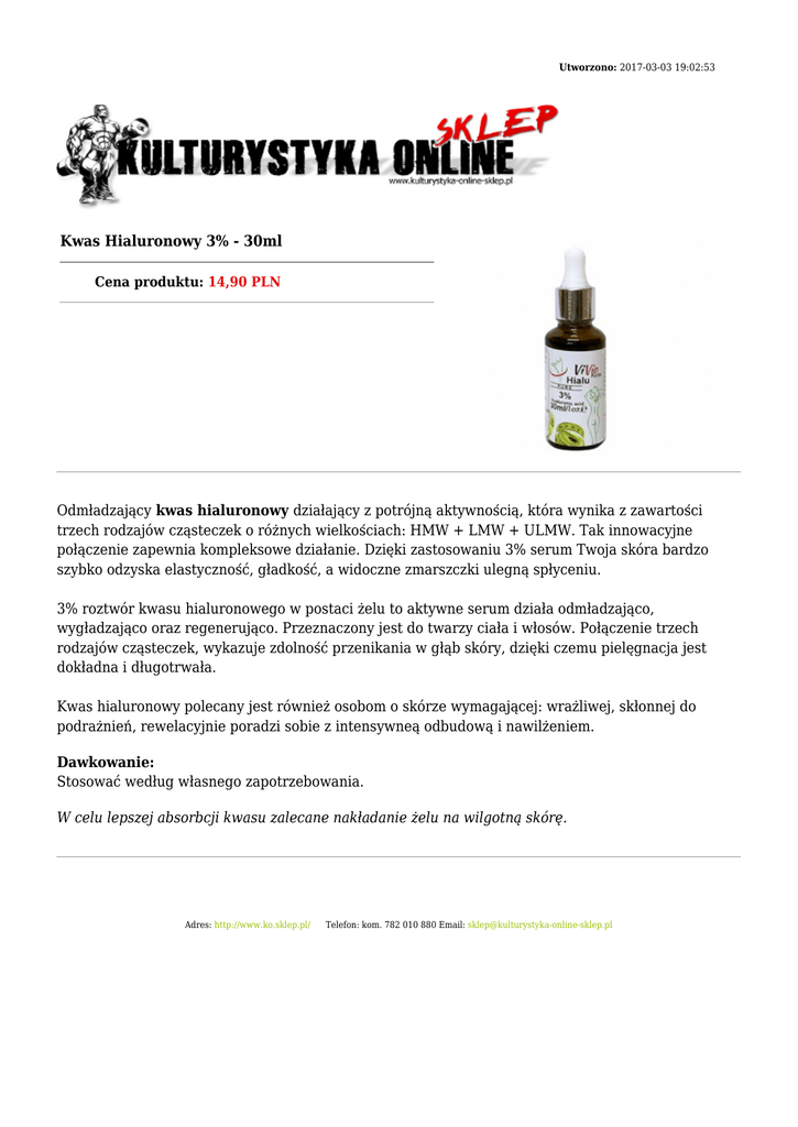 Utworzono: 2017-03-03 19:02:53 Kwas Hialuronowy 3% - 30ml Cena produktu: 14,90 PLN Odmładzający kwas hialuronowy działający z potrójną aktywnością, która wynika z zawartości trzech rodzajów cząsteczek o różnych wielkościach: HMW + LMW + ULMW. Tak innowacyjne połączenie zapewnia kompleksowe działanie. Dzięki zastosowaniu 3% serum Twoja skóra bardzo szybko odzyska elastyczność, gładkość, a widoczne zmarszczki ulegną spłyceniu. 3% roztwór kwasu hialuronowego w postaci żelu to aktywne serum działa odmładzająco, wygładzająco oraz regenerująco. Przeznaczony jest do twarzy ciała i włosów. Połączenie trzech rodzajów cząsteczek, wykazuje zdolność przenikania w głąb skóry, dzięki czemu pielęgnacja jest dokładna i długotrwała. Kwas hialuronowy polecany jest również osobom o skórze wymagającej: wrażliwej, skłonnej do podrażnień, rewelacyjnie poradzi sobie z intensywneą odbudową i nawilżeniem. Dawkowanie: Stosować według własnego zapotrzebowania. W celu lepszej absorbcji kwasu zalecane nakładanie żelu na wilgotną skórę. Adres: http://www.ko.sklep.pl/ Telefon: kom. 782 010 880 Email: [email protected]