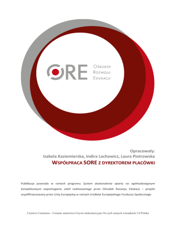 Opracowały: Izabela Kaziemierska, Indira Lachowicz, Laura Piotrowska WSPÓŁPRACA SORE Z DYREKTOREM PLACÓWKI Publikacja powstała w ramach programu System doskonalenia oparty na ogólnodostępnym kompleksowym wspomaganiu szkół realizowanego przez Ośrodek Rozwoju Edukacji – projekt współfinansowany przez Unię Europejską w ramach środków Europejskiego Funduszu Społecznego Creative Commons - Uznanie autorstwa-Użycie niekomercyjne-Na tych samych warunkach 3.0 Polska I.Kazimierska, I.Lachowicz, L.Piotrowska • Współpraca SORE z dyrektorem … • I. PIERWSZY KONTAKT SORE Z PLACÓWKĄ – SPOTKANIE SORE Z DYREKTOREM Pierwszym etapem współpracy szkolnego organizatora rozwoju edukacji (SORE) ze szkoła lub przedszkolem jest diagnoza, której celem jest m.in. dobór oferty doskonalenia najlepszej dla danej placówki. Diagnoza przeprowadzana przez SORE zaczyna się od spotkania z dyrektorem, w czasie którego omawiane są potrzeby rozwojowe szkoły. (Poradnik dla beneficjenta, str. 12) Z punktu widzenia wdrażania zmiany w obszarze, który dana placówka wybierze, dyrektor odgrywa rolę kluczową. Jest to osoba decyzyjna, posiadająca uprawnienia i kompetencje (wynikające z jego władzy formalnej i nieformalnej) do podejmowania wszelkich działań (również dyrektywnych), które pozwalają na wprowadzanie zmian w wybranym przez szkołę obszarze. Władzy takiej nie posiada SORE. Jego rolą jest wyłącznie wspieranie dyrektora i szkoły w planowaniu i wdrażaniu zmiany. SORE to osoba z zewnątrz, która poprzez tworzenie relacji partnerskich wspomaga szkołę w planowaniu i wdrażaniu. Dlatego też podczas pierwszego spotkania SORE z dyrektorem ważne jest nie tylko przeprowadzenie „wywiadu i zebranie informacji o szkole”, ale również omówienie kwestii dotyczących wzajemnej współpracy, roli i zadań, oraz zakresu odpowiedzialność. Dla SORE pierwsze spotkanie z dyrektorem to kluczowy moment w budowaniu wzajemnych relacji, które wpłyną na współpracę ze szkołą i przebieg wspomagania. Biorąc pod uwagę powyższe zagadnienia oraz fakt, że różne jest wyobrażenie i rozumienie roli SORE, warto podczas pierwszego spotkania z dyrektorem szkoły przewidzieć czas na: 1/ zebranie informacji, jakie są potrzeby dyrektora i czego oczekuje on od SORE; 2/ ujednolicenie poglądu na rolę SORE, która pełni w placówce i ustalenie zasad współpracy; 3/ podzielenie zakresów odpowiedzialności za realizowany projekt; 4/ przeprowadzenie rozmowy na temat potrzeb placówki (poznanie perspektywy dyrektora); 5/ wspólne ustalenie, jak będzie przebiegało spotkanie SORE z radą pedagogiczną, (podczas którego SORE pomoże w zdiagnozowaniu potrzeb placówki z punktu widzenia grona pedagogicznego) i jaką rolę odegra w tym spotkaniu dyrektor szkoły. Kluczowymi umiejętnościami potrzebnymi podczas rozmowy z dyrektorem są umiejętności komunikacyjne m.in. zadawanie pytań, aktywne słuchanie oraz moderowanie rozmowy. W trakcie ustalania zasad wzajemnej współpracy, omawiania kwestii odpowiedzialności, czy przebiegu spotkania SORE z radą pedagogiczną, ważna może okazać się również umiejętność asertywnego wyznaczania granic i mówienia wprost o swoich oczekiwaniach. W tym celu przydatne może okazać się wykorzystywanie wybranych techniki komunikacyjnych nastawianych na budowanie wzajemnych relacji, zrozumienie i jednoczenie (patrz: model pięciu poziomów komunikowania się). Projekt jest współfinansowany przez Unię Europejską w ramach środków Europejskiego Funduszu Społecznego 2 I.Kazimierska, I.Lachowicz, L.Piotrowska • Współpraca SORE z dyrektorem … • II. RELACJA PARTNERSKA I ZAKRES ODPOWIEDZIALNOŚCI ZA REALIZACJĘ PROJEKTU W WYBRANYM PRZEZ SZKOŁĘ OBSZARZE Z punktu widzenia współpracy SORE ze szkołą/przedszkolem, kluczowe jest właściwe rozumienie zagadnień związanych z odpowiedzialnością za realizację projektu i wdrażaną zmianę. Zgodnie z założeniami projektu „System doskonalenia nauczycieli oparty na ogólnodostępnym kompleksowym wspomaganiu szkół" szkołę do projektu zgłasza dyrektor placówki. Jest to dobrowolna decyzja szkoły, wynikająca z jej potrzeb. Dopiero po zgłoszenia gotowości szkoły do współpracy, SORE angażuje się w zadania związane z jej wspomaganiem. W przypadku powiatowych projektów pilotażowych ( finansowanych w ramach Działania 3.5 PO KL) obszar do rozwoju wybrany przez szkołę musi być spójny z jedną z 24 ofert doskonalenia przygotowanych przez Ośrodek Rozwoju Edukacji. SORE na etapie diagnozy, we współpracy z dyrektorem i nauczycielami, wykorzystując informacje zawartych w dokumentacji szkoły/przedszkola (w szczególności wyniki ewaluacji wewnętrznej, raport z ewaluacji zewnętrznej oraz wyniki egzaminów zewnętrznych), szczegółowo analizuje potrzeby danej placówki. Rezultatem przeprowadzenia diagnozy jest wybór tematów ofert doskonalenia, które będą realizowane w szkole czy przedszkolu, a także określenie zasad i etapów dotyczących realizacji RPW. W związku z realizacją RPW przed dyrektorem szkoły mogą pojawić się dodatkowe wyzwania. Zwłaszcza, gdy po zetknięciu się ze szkolną rzeczywistością zaplanowane działania zaczynają wydawać się trudne w realizacji. Dyrektor może w trakcie RPW korzystać z indywidualnego wsparcia, m.in. w obszarze radzenia sobie z nowymi okolicznościami, które niesie ze sobą wprowadzanie RPW (np. promocja zmiany, radzenie sobie z oporem, zniechęceniem, rozwiązywanie pojawiających się problemów itp.) Osobą wspierającą dyrektora jest SORE, który pełni w tym wypadku rolę coacha. SORE wypełniając swoje zadania wchodzi przede wszystkim w role niedyrektywne – typu coach, moderator i facylitator. Jednocześnie SORE w rocznym planie wspomagania ma zapisane konkretne działania, które jest zobowiązany przeprowadzić w placówce. Istotne jest więc określenie, kto ponosi odpowiedzialność za realizację RP