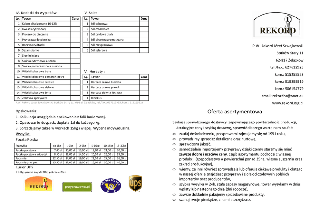 IV. Dodatki do wypieków: V. Sole: Lp. Towar Cena Lp. Towar Cena 1 Kakao alkalizowane 10-12% 1 Sól cebulowa 2 Kwasek cytrynowy 2 Sól czosnkowa 3 Proszek do pieczenia 3 Sól peklowa biała 4 Przyprawa do piernika 4 Sól pikantna aromatyczna 5 Rodzynki Sułtanki 5 Sól przyprawowa 6 Sezam ziarno 6 Sól selerowa P.W. Rekord Józef Szwajkowski Borków Stary 11 7 Siemię lniane 62-817 Żelazków 8 Skórka cytrynowa suszona 9 Skórka pomarańczowa suszona tel./fax.: 627612925 10 Wiórki kokosowe białe VI. Herbaty : 11 Wiórki kokosowe pomarańczowe Lp. Towar kom.: 515255523 Cena 12 Wiórki kokosowe różowe 1 Herbata czarna liściasta kom.: 515255519 13 Wiórki kokosowe zielone 2 Herbata czarna granul. kom.: 506154779 14 Wiórki kokosowe żółte 3 Herbata zielona liściasta 15 Żelatyna spożywcza 4 Hibiskus email: [email protected] P.W. Rekord Józef Szwajkowski, Borków Stary 11, 62-817 Żelazków, tel./fax.: 627612925, kom.: 515255523 Opakowania: 1. Kalkulacja uwzględnia opakowania z folii barierowej. 2. Opakowanie doypack, dopłata 1zł do każdego kg. 3. Sprzedajemy także w workach 15kg i więcej. Wycena indywidualna. Wysyłka: Poczta Polska Przesyłka do 1kg 1-2kg 2-5kg 5-10kg 10-15kg 15-30kg Paczka pocztowa Paczka pocztowa priorytet Pobranie Pobranie priorytet 7,00 zł 8,50 zł 12,50 zł 15,50 zł 10,00 zł 12,00 zł 14,00 zł 17,00 zł 13,00 zł 14,50 zł 16,00 zł 19,00 zł 18,00 zł 20,50 zł 22,50 zł 26,00 zł 21,00 zł 25,00 zł 27,00 zł 30,00 zł 30,00 zł 35,00 zł 36,00 zł 40,00 zł Kurier UPS 0-30kg: paczka zwykła 20zł, pobranie 28zł. www.rekord.org.pl Oferta asortymentowa Szukasz sprawdzonego dostawcy, zapewniającego powtarzalność produkcji, Atrakcyjne ceny i szybką dostawę, sprawdź dlaczego warto nam zaufać: • zaufaj doświadczeniu, przyprawami zajmujemy się od 1991 roku, • prowadzimy sprzedaż detaliczną oraz hurtową, • sprawdzona jakość, • samodzielnie importujemy przyprawy dzięki czemu staramy się mieć zawsze dobre i uczciwe ceny, część asortymentu pochodzi z własnej produkcji (gospodarstwo o powierzchni ponad 25ha, własna suszarnia oraz zakład produkcyjny), • wiemy, że inni również sprowadzają lub oferują ciekawe produkty i dlatego w naszej ofercie znajdziesz przyprawy i zioła od czołowych polskich importerów oraz producentów, • szybka wysyłka w 24h, stałe zapasy magazynowe, towar wysyłamy w dniu wpłaty lub następnego dnia (dni robocze), • zawsze dokładnie pakujemy sprzedawane produkty, • szanuj swoje pieniądze, z nami oszczędzasz. I. Mieszanki przyprawowe: Lp. Nazwa II. Przyprawy i zioła: Cena Lp. Nazwa Cena Lp. Towar Cena Lp. Towar 1 Bulion drobiowy 39 Przyprawa do makaronu 1 Anyż (ziarno, mielony) 23 Lubczyk (liść, mielony) 2 Bulion wołowy 40 Przyprawa do mięsa mielonego 2 Bazylia (liść, mielona) 24 Majeranek (liść, mielony) 3 Chmeli-suneli 41 Przyprawa do wołowiny 3 Curry 25 Melisa (liść, mielona) 4 Czubryca czerwona 42 Przyprawa do ogórków 4 Cynamon (kora, mielony) 26 Mięta (liść, mielona) 5 Czubryca zielona 43 Przyprawa do pieczeni 6 Delikat czerwony 44 Przyprawa do pizzy 5 Czarnuszka (ziarno) 27 Oregano (liść, mielone) 6 Cząber (liść, mielony) 28 Papryka chilli (mielona, grys, strąk) 7 Delikat zielony 45 Przyprawa do rosołu 8 Garam Masala 46 Przyprawa do ryby 7 Estragon (liść, mielony) 29 Papryka czerwona (płatek, grys) 47 Przyprawa do sałatek 8 Gałka muszkatołowa (mielona) 30 Papryka ostra (mielona) 10 Kurczak po diabelsku 48 Przyprawa do shoarmy 9 Glutaminian sodu 31 Papryka słodka (mielona) 11 Kurczak Staropolski 49 Przyprawa do skrzydełek 10 Gorczyca biała (cała, mielona) 32 Papryka zielona (płatek, grys) 12 Marchewka po koreańsnku 50 Przyprawa do sosów i mięs 11 Gorczyca czarna (cała) 33 Pieprz biały (ziarno, mielony) 13 Nowalijka Wiosenna 51 Przyprawa do steków 12 Goździki (całe, mielone) 34 Pieprz Cayenne (mielony) 14 Panierka chińska 52 Przyprawa do szaszłyka 13 Imbir (kłącze, mielony) 35 Pieprz czarny (ziarno, mielony, grys) 15 Panierka złota 53 Przyprawa do wędlin 16 Pieprz cytrynowy 54 Przyprawa do wieprzowiny 14 Jałowiec (cały, mielony, grys) 36 Pieprz czerwony (ziarno) 17 Pieprz czosnkowy 55 Przyprawa do zapiekanek 15 Kardanom (ziarno, mielony) 37 Pieprz kolorowy (ziarno) 38 Pieprz zielony (ziarno) 9 Kurczak po chińsku 18 Pieprz pomarańczowy 56 Przyprawa do ziemniaków 16 Kmin rzymski (ziarno, mielony) 19 Posypka Dekoracyjna 57 Przyprawa do żeberek 17 Kminek (cały, mielony) 39 Pieprz ziołowy 20 Posypka do śledzi 58 Przyprawa Fajitas 18 Kolendra (cała, mielony) 40 Proszek pomidorowy 21 Posypka Szwajcarska 59 Przyprawa Grecka 19 Koper włoski (cały, mielony) 41 Rozmaryn (cały, mielony) 22 Przyprawa ,,5 smaków’’ 60 Przyprawa Meksykańska 20 Kozieradka (ziarno, mielona) 42 Szałwia (liść, mielona) 23 Przyprawa Arabska 61 Przyprawa Myśliwska 21 Kurkuma (mielona) 43 Tymianek (liść, mielony) 24 Przyprawa Azjatycka 62 Przyprawa Staropolska 22 Liść laurowy (liść, mielony) 44 Ziele angielskie (ziarno, mielone) 25 Przyprawa Barbecuce 63 Przyprawa Tajska 26 Przyprawa Cajun 64 Przyprawa Texas 27 Przyprawa Chińska 65 Przyprawa Węgierska III. Warzywa suszone: Lp. Towar Cena Lp. Towar 28 Przyprawa Cygańska 66 Przyprawa Włoska 1 Cebula grys 29 Przyprawa do barszczu 67 Przyprawa Zbójnicka 2 Cebula mielona 13 Marchew kostka 30 Przyprawa do bigosu 68 Salsa de Yucatan 3 Cebula płatek 14 Mieszanka warzywna grys 31 Przyprawa do burrito 69 Taco de Tortilla 4 Cebula prażona 15 Mieszanka warzywna kostka 70 Tandori Masala 5 Chrzan krojony 16 Pasternak grys 33 Przyprawa do flaków 71 Tzatziki 6 Chrzan mielony 17 Pasternak kostka 34 Przyprawa do grilla 72 Zioła Małgosi 7 Czosnek granulowany 18 Pietruszka nać 35 Przyprawa do gulaszu 73 Zioła prowansalskie 8 Czosnek mielony 19 Por suszony grys 74 Zioła włoskie 9 Czosnek płatek 32 Przyprawa do dziczyzny 36 Przyprawa do gyrosa i kebabu 37 Przyprawa do karkówki 75 Złoty Kurczak 38 