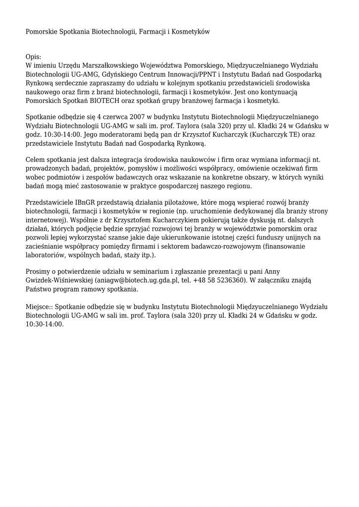 Pomorskie Spotkania Biotechnologii, Farmacji i Kosmetyków Opis: W imieniu Urzędu Marszałkowskiego Województwa Pomorskiego, Międzyuczelnianego Wydziału Biotechnologii UG-AMG, Gdyńskiego Centrum Innowacji/PPNT i Instytutu Badań nad Gospodarką Rynkową serdecznie zapraszamy do udziału w kolejnym spotkaniu przedstawicieli środowiska naukowego oraz firm z branż biotechnologii, farmacji i kosmetyków. Jest ono kontynuacją Pomorskich Spotkań BIOTECH oraz spotkań grupy branżowej farmacja i kosmetyki. Spotkanie odbędzie się 4 czerwca 2007 w budynku Instytutu Biotechnologii Międzyuczelnianego Wydziału Biotechnologii UG-AMG w sali im. prof. Taylora (sala 320) przy ul. Kładki 24 w Gdańsku w godz. 10:30-14:00. Jego moderatorami będą pan dr Krzysztof Kucharczyk (Kucharczyk TE) oraz przedstawiciele Instytutu Badań nad Gospodarką Rynkową. Celem spotkania jest dalsza integracja środowiska naukowców i firm oraz wymiana informacji nt. prowadzonych badań, projektów, pomysłów i możliwości współpracy, omówienie oczekiwań firm wobec podmiotów i zespołów badawczych oraz wskazanie na konkretne obszary, w których wyniki badań mogą mieć zastosowanie w praktyce gospodarczej naszego regionu. Przedstawiciele IBnGR przedstawią działania pilotażowe, które mogą wspierać rozwój branży biotechnologii, farmacji i kosmetyków w regionie (np. uruchomienie dedykowanej dla branży strony internetowej). Wspólnie z dr Krzysztofem Kucharczykiem pokierują także dyskusją nt. dalszych działań, których podjęcie będzie sprzyjać rozwojowi tej branży w województwie pomorskim oraz pozwoli lepiej wykorzystać szanse jakie daje ukierunkowanie istotnej części funduszy unijnych na zacieśnianie współpracy pomiędzy firmami i sektorem badawczo-rozwojowym (finansowanie laboratoriów, wspólnych badań, staży itp.). Prosimy o potwierdzenie udziału w seminarium i zgłaszanie prezentacji u pani Anny Gwizdek-Wiśniewskiej ([email protected], tel. +48 58 5236360). W załączniku znajdą Państwo program ramowy spotkania. Miejsce:: Spotkanie odbędzie się w budynku Instytutu Biotechnologii Międzyuczelnianego Wydziału Biotechnologii UG-AMG w sali im. prof. Taylora (sala 320) przy ul. Kładki 24 w Gdańsku w godz. 10:30-14:00.