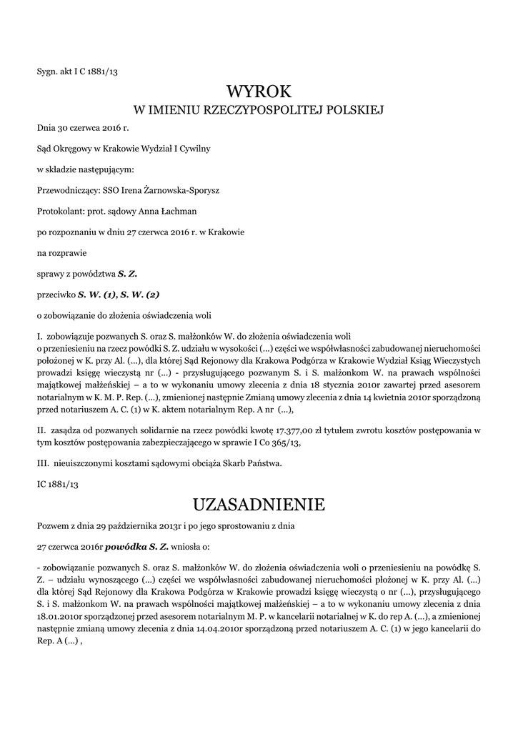 Sygn. akt I C 1881/13 WYROK W IMIENIU RZECZYPOSPOLITEJ POLSKIEJ Dnia 30 czerwca 2016 r. Sąd Okręgowy w Krakowie Wydział I Cywilny w składzie następującym: Przewodniczący: SSO Irena Żarnowska-Sporysz Protokolant: prot. sądowy Anna Łachman po rozpoznaniu w dniu 27 czerwca 2016 r. w Krakowie na rozprawie sprawy z powództwa S. Z. przeciwko S. W. (1), S. W. (2) o zobowiązanie do złożenia oświadczenia woli I. zobowiązuje pozwanych S. oraz S. małżonków W. do złożenia oświadczenia woli o przeniesieniu na rzecz powódki S. Z. udziału w wysokości (...) części we współwłasności zabudowanej nieruchomości położonej w K. przy Al. (...), dla której Sąd Rejonowy dla Krakowa Podgórza w Krakowie Wydział Ksiąg Wieczystych prowadzi księgę wieczystą nr (...) - przysługującego pozwanym S. i S. małżonkom W. na prawach wspólności majątkowej małżeńskiej – a to w wykonaniu umowy zlecenia z dnia 18 stycznia 2010r zawartej przed asesorem notarialnym w K. M. P. Rep. (...), zmienionej następnie Zmianą umowy zlecenia z dnia 14 kwietnia 2010r sporządzoną przed notariuszem A. C. (1) w K. aktem notarialnym Rep. A nr (...), II. zasądza od pozwanych solidarnie na rzecz powódki kwotę 17.377,00 zł tytułem zwrotu kosztów postępowania w tym kosztów postępowania zabezpieczającego w sprawie I Co 365/13, III. nieuiszczonymi kosztami sądowymi obciąża Skarb Państwa. IC 1881/13 UZASADNIENIE Pozwem z dnia 29 października 2013r i po jego sprostowaniu z dnia 27 czerwca 2016r powódka S. Z. wniosła o: - zobowiązanie pozwanych S. oraz S. małżonków W. do złożenia oświadczenia woli o przeniesieniu na powódkę S. Z. – udziału wynoszącego (...) części we współwłasności zabudowanej nieruchomości płożonej w K. przy Al. (...) dla której Sąd Rejonowy dla Krakowa Podgórza w Krakowie prowadzi księgę wieczystą o nr (...), przysługującego S. i S. małżonkom W. na prawach wspólności majątkowej małżeńskiej – a to w wykonaniu umowy zlecenia z dnia 18.01.2010r sporządzonej przed asesorem notarialnym M. P. w kancelarii notarialnej w K. do rep A. (...), a zmienionej następnie zmianą umowy zlecenia z dnia 14.04.2010r sporządzoną przed notariuszem A. C. (1) w jego kancelarii do Rep. A (...) , - zasądzenie od pozwanych na rzecz powódki kosztów postępowania. W uzasadnieniu podała ,że w dniu 18.01.2010r strony zawarły notarialną umowę zlecenia na mocy i na warunkach której powódka jako zleceniodawca zleciła pozwanym jako zleceniobiorcom nabycie przez nich i w ich imieniu własnym jednakże na rzecz powódki i za jej środki całego udziału jaki nabędzie K. Q. tj. (...) , jak też całych udziałów które nabędą B. C. i A. M. – C. tj. po (...) części każdy z nich we współwłasności zabudowanej nieruchomości położonej w K. objętej kw. (...), czyli łącznie udział (...) ( ust. IV aktu notarialnego). Udziały miały być nabyte za pieniądze dającego zlecenie. Dodatkowo strony ustaliły, że po wykonaniu zleconej czynności przyjmujący zlecenie zobowiązani będą przenieść te nabyte udziały na rzecz dającej zlecenie na każde jej żądanie w terminie nie później niż do 1 lipca 2013r. Strony ustaliły ,że wykonanie zlecenia będzie nieodpłatne. Jednocześnie strony ustaliły, że zleceniobiorcy mogą się zwolnić z przeniesienia nabytych udziałów na rzecz zleceniodawcy w sposób określony w umowie – za zwrotem zleceniodawcy kwoty 500 tysięcy zł. ( ust. IX aktu). Zmiana tej umowy sporządzona również w formie aktu notarialnego dotyczyła jedynie sprostowania oczywistej omyłki dotyczącej numeru lokalu. Powódka przekazała pozwanym środki na zakup przez nich udziałów w nieruchomości w wysokości 500 tysięcy zł. Pozwani nabyli za środki uzyskane od powódki udziały w przedmiotowej nieruchomości w (...) częściach dnia 06.08.2013r. aktem notarialnym sporządzonym w kancelarii notariusza M. W. (1) w W.. Powódka wezwała pozwanych za pośrednictwem notariusza A. C. (1) do wykonania umowy przenoszącej na nią własność tych udziałów w nieruchomości - ale w wyznaczonym dniu 10.09.2013 żaden z pozwanych nie stawił się . Do dnia dzisiejszego pomimo nalegań powódki , która jest córką pozwanych - pozwani nie wykonali zobowiązania. Podjęli oni natomiast działania w kierunku sprzedaży udziałów we współwłasności – co zmusiło powódkę do złożenia wniosku o zabezpieczenie roszczenia – w osobnej sprawie I Co 365/13 tut. Sądu. Pozwani S. oraz S. małżonkowie W. w odpowiedzi na pozew wnieśli o oddalenie powództwa i zasądzenie kosztów postępowania. W uzasadnieniu podnieśli, iż zamieszkują oni w lokalu nr (...) w obrębie spornej nieruchomości od 1983r na podstawie przydziału administracyjnego na który to lokal ponieśli nakłady o wartości kilkudziesięciu tysięcy złotych. Kiedy go zajmowali właścicielem nieruchomości była rodzina B., która wyemigrowała do Australii. Pozwani postanowili odnaleźć spadkobierców tej rodziny celem odkupienia od nich udziałów w nieruchomości. Podejmowali czynności od 2006r i w efekcie w 2009r przygotowano pierwszy projekt sprzedaży udziałów w nieruchomości za cenę 180.000 dolarów australijskich , która była niższa od pierwotnej ( 250.000 ), a obniżona z tego względu ,że pozwany S. W. (2) miał się zająć wszelkimi formalnościami między innymi z przeprowadzeniem postępowań spadkowych i innych potrzebnych do sporządzenia umowy sprzedaży a także i dlatego ,że pozwani poczynili nakłady na sporną nieruchomość. Rodzina państwa W. uzgodniła ,że po zakupie udziałów w nieruchomości nastąpi wyodrębnienie lokali i po jednym otrzymają : powódka S. Z. i syn pozwanych W. W. (1). Z tego też względu małżonka W. W. (1) zrezygnowała z pracy w Izbie Celnej w P. i przeniosła się z pracą do K. , a małżonkowie ci także sprzedali swe mieszkanie w U. a środki ze sprzedaży przeznaczyli na remont