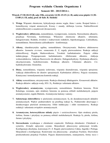 Program wykładu Chemia Organiczna I Semestr III - 2013/2014 r. Wtorek 17:30-18:15 (B, sala 338), czwartek 14:30–15:15 (A i B, aula) oraz piątek 11:30– 13:00 (A i B, aula), prof. dr hab. R. Siciński 1. Wstęp. Wiązanie chemiczne, hybrydyzacja atomu węgla, tlenu i azotu. Rozpad hetero- i homolityczny wiązań atomowych. Kwasy i zasady, definicja Lewisa. Nukleofilowość (elektrofilowość) a zasadowość (kwasowość). 2. Węglowodory alifatyczne, nomenklatura, występowanie, izomeria. Stereochemia alkanów, projekcja Newmana, konformacja. Własności chemiczne alkanów, utlenianie, halogenowanie. Rodniki, trwałość i reaktywność rodników, hiperkoniugacja. Cykloalkany, nomenklatura. Stereochemia cykloalkanów - konformacja. 3. Alkeny, charakterystyka ogólna, nomenklatura. Otrzymywanie. Budowa elektronowa alkenów. Izomeria cis-trans, oznaczenia E, Z, reguły pierwszeństwa. Reakcja addycji elektrofilowej. Reguła Markownikowa. Trwałość karbokationów. Pojęcie efektu indukcyjnego. Przegrupowanie karbokationów. Alkilowanie alkenów. Addycja wolnorodnikowa. Addycja fluorowców do alkenów. Halogenohydryny. Hydratacja alkenów, oksyrtęciowanie, hydroborowanie. Redukcja alkenów. Utlenianie alkenów. Cishydroksylowanie. Ozonoliza. 4. Dieny, nomenklatura, wiązania izolowane, wiązania skumulowane, wiązania sprzężone. Addycja elektrofilowa do dienów sprzężonych. Karbokation allilowy. Pojęcie rezonansu. Kinetyczna i termodynamiczna kontrola reakcji. 5. Alkiny nomenklatura, otrzymywanie. Reakcja eliminacji dihalogenów. Kwasowość alkinów. Reakcje alkinów: addycja wody, HX i X2. Redukcja i utlenianie alkinów. 6. Węglowodory aromatyczne, występowanie, nomenklatura. Struktura benzenu. Wzór Kekulego, rezonans, opis struktury benzenu za pomocą orbitali molekularnych, pojęcie aromatyczności, reguła Hückela. Aromatyczne kationy i aniony. 7. Substytucja elektrofilowa w pierścieniu aromatycznym. SE do skondensowanych układów aromatycznych. Wpływ podstawników na przebieg reakcji SE. Podstawniki aktywujące i dezaktywujące pierścień aromatyczny. Efekt indukcyjny i efekt rezonansowy. Reakcje redukcji i utlenienia związków aromatycznych. 8. Aromatyczne, heterocykliczne układy pięcio- i sześcioczłonowe. Opis struktury pirolu, tiofenu, furanu i pirydyny za pomocą orbitali molekularnych. Reakcja S E pirolu, tiofenu, furanu i pirydyny. 9. Stereochemia wynikająca z chiralności cząsteczki. Definicja chiralności. Chiralność a symetria. Związki optycznie czynne. Skręcalność płaszczyzny polaryzacji światła. Konfiguracja absolutna, konwencja R i S. Reguły pierwszeństwa Cahna, Ingolda i Preloga. Skręcalność a konfiguracja. Rzutowanie ma płaszczyznę - projekcja Fischera. Dozwolone przekształcenia projekcji Fischera. Pojęcie diastereoizomeru, enancjomeru, formy mezo i racematu. Stereochemia kwasu winowego. Rozdział mieszaniny racemicznej. 10. Halogenki alkilowe, nomenklatura, ogólna charakterystyka, właściwości fizyczne, wiązanie C-halogen. Otrzymywanie, addycja elektrofilowa HX lub X2 do alkenów, mechanizm reakcji. Stereochemia reakcji addycji. Bromowanie alkenów w położeniu allilowym. Trwałość rodnika allilowego. Porównanie halogenków allilowych, benzylowych, winylowych i aromatycznych. Reakcje halogenków alkilowych. Reakcje substytucji, mechanizmy SN1 i SN2. Czynniki decydujące o przebiegu reakcji wg. mechanizmów SN1 lub SN2. Inwersja Waldena. Trwałość karbokationów. Stereochemia reakcji SN. Reakcje eliminacji. Regioselektywność reakcji eliminacji - reguła Zajcewa. Mechanizmy reakcji El i E2. Stereochemia reakcji E. Reakcja E2 a konformacja pierścienia cykloheksanu. 11. Alkohole i fenole. Nazewnictwo alkoholi i fenoli. Wiązania wodorowe. Alkohole jako zasady - protonowanie alkoholi. Właściwości kwasowe alkoholi i fenoli, czynniki wpływające na kwasowość fenoli. Dehydratacja alkoholi, mechanizm El i E2. Przekształcanie alkoholi w halogenki alkilowe. Grupa -OH jako grupa odchodząca. Mechanizm SN1 i SN2. Estry alkoholi z kwasami nieorganicznymi i sulfonowymi. Utlenianie alkoholi i fenoli. Otrzymywanie alkoholi i fenoli w wyniku redukcji związków karbonylowych, kwasów karboksylowych i estrów. Otrzymywanie alkoholi w wyniku addycji związków Grignarda do związków karbonylowych. Reakcje alkoholi polihydroksylowych z sodem i z kwasami fluorowodorowymi. Utlenianie za pomocą jodanu(VII) i tetraoctanu ołowiu, mechanizm reakcji. Otrzymywanie polioli. Przegrupowanie pinakolinowe. Tiole; różnica między tiolami i alkoholami. 12. Etery i sulfidy. Nazewnictwo eterów i sulfidów. Wiązania koordynacyjne eterów z metalami, etery koronowe. Rozszczepienie kwasowe eterów. Otrzymywanie eterów. Dehydratacja alkoholi, synteza Williamsona, alkoksyrtęciowanie alkenów. Synteza oksiranów: utlenianie nadkwasami, z halogenohydryn. Rozszczepianie oksiranów katalizowane przez kwasy i zasad, mechanizmy reakcji. Stereochemia i regioselektywność otwarcia pierścienia oksiranowego. Różnice między eterami i sulfidami. 13. Aminy. Nazewnictwo amin, aminy I, II, III rz. oraz IV rz. sole amoniowe. Struktura przestrzenna amin. Zasadowe i nukleofilowe właściwości amin. Reakcje amin z halogenkami alkilowymi. Reakcje acylowania, utleniania oraz redukcji amin. Grupa aminowa jako grupa odchodząca. Reakcja amin z aldehydami i ketonami. Enaminy. Reakcja amin z kwasem azotowym(III). Sole diazoniowe, budowa. Reakcje soli diazoniowych: redukcja, reakcje sprzęgania. Barwniki azowe. Reakcje wymiany grupy diazoniowej, reakcja Sendmeyera. Alifatyczne związki diazowe. Diazometan - struktury rezonansowe. Reakcje diazometanu z aldehydami lub ketonami, z chlorkami kwasowymi. Syntezy amin. Redukcja związków zawierających azot (nitrozwiązków, nitryli, amidów, azydków, oksymów). Aminowanie redukcyjne. Degradacja Hofmanna (mechanizm reakcji). Przegrupowanie Curtiusa. Synteza Gabriela. 14. Aldehydy i ketony. Nazewnictwo aldehydów i 