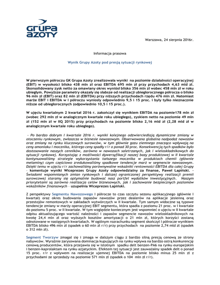 Warszawa, 24 sierpnia 2016r. Informacja prasowa Wynik Grupy Azoty pod presją sytuacji rynkowej W pierwszym półroczu GK Grupa Azoty zrealizowała wyniki na poziomie działalności operacyjnej (EBIT) w wysokości blisko 438 mln zł oraz EBITDA 695 mln zł przy przychodach 4,63 mld zł. Skonsolidowany zysk netto za omawiany okres wyniósł blisko 356 mln zł wobec 458 mln zł w roku ubiegłym. Powyższe parametry okazały się słabsze od realizacji ubiegłorocznego półrocza o blisko 96 mln zł (EBIT) oraz 82 mln zł (EBITDA) przy niższych przychodach rzędu 476 mln zł. Natomiast marże EBIT i EBITDA w I półroczu wyniosły odpowiednio 9,5 i 15 proc. i były tylko nieznacznie niższe od ubiegłorocznych (odpowiednio 10,5 i 15 proc.). W ujęciu kwartalnym 2 kwartał 2016 r. zakończył się wynikiem EBITDA na poziomie178 mln zł (wobec 292 mln zł w analogicznym kwartale roku ubiegłego), zyskiem netto na poziomie 49 mln zł (152 mln zł w IIQ 2015) przy przychodach na poziomie blisko 2,16 mld zł (2,28 mld zł w analogicznym kwartale roku ubiegłego). - Po bardzo dobrym I kwartale 2016 r. wyniki kolejnego odzwierciedlają dynamiczne zmiany w otoczeniu rynkowym, zwłaszcza w biznesie nawozowym. Obserwowana globalna nadpodaż nawozów oraz zmiany na rynku kluczowych surowców, w tym głównie gazu ziemnego znacząco wpływają na ceny amoniaku i mocznika, którego ceny spadły r/r o ponad 30 proc. Konsekwencją tych spadków było dostosowanie naszych cenników, zarówno w nawozach saletrzanych, jak i wieloskładnikowych do sytuacji rynkowej. Korzystając z możliwości dywersyfikacji naszej bazy produktowej w II kwartale kontynuowaliśmy strategie wykorzystania tańszego mocznika w produktach chemii (głównie melaminy) czym częściowo zredukowaliśmy spadkowe tendencje marż w segmencie nawozowym. Dzięki temu w ujęciu r/r zachowaliśmy porównywalne wskaźniki rentowności EBITDA dla całej Grupy – komentuje wyniki Wiceprezes Grupy Azoty odpowiedzialny za finanse, Paweł Łapiński. Świadomi wspomnianych zmian rynkowych i dalszej ograniczonej perspektywy realizacji premii surowcowej staramy się optymalnie budować nasz portfel wydatków inwestycyjnych. Naszym priorytetami są zarówno realizacja celów biznesowych, jak i zachowanie bezpiecznych poziomów wskaźników finansowych – uzupełnia Wiceprezes Łapiński. Z perspektywy Segmentu Nawozowego I półrocze to czas szczytu sezonu aplikacyjnego (głównie I kwartał) oraz okres budowania zapasów nawozów przez dealerów na aplikacje jesienną oraz przestojów remontowych w zakładach wytwórczych w II kwartale. Tym samym widoczne są typowe tendencje zmiany w marży operacyjnej EBIT segmentu, która spadła z poziomu 21 proc. w I kwartale do poziomu 5 proc. w II kwartale. W tym względzie koniecznym jest wspomnieć o ujęciu w II kwartale odpisu aktualizującego wartość należności i zapasów segmencie nawozów wieloskładnikowych na kwotę 24,4 mln zł oraz wyższych kosztów amortyzacji o 21 mln zł, których korzyści zostaną odnotowane w następnych kwartałach. W ogólnym rozrachunku segment skończył I półrocze wynikiem EBITDA blisko 496 mln zł (spadek o 60 mln zł r/r) przy przychodach na poziomie 2,74 mld zł (spadek o 312 mln zł). Segment Tworzyw zmagał się i zmaga w dalszym ciągu z bardzo silną presją cenową ze strony nabywców. Wyraźnie zarysowana dominacja kupujących na rynku wpływa na bardzo ostrą konkurencję cenową producentów, która przejawia się w istotnym spadku delt benzen-PA6 na rynku europejskim i benzen-kaprolaktam na rynku azjatyckim. Efektem tej sytuacji jest zauważalny spadek delt o ponad 15 proc. r/r z wpływem na realizacje ujemnej EBITDA na poziomie blisko minus 25 mln zł z przychodami ze sprzedaży na poziomie 571 mln zł (spadek o 104 mln zł r/r). W Segmencie Chemia zauważalna jest wyraźna poprawa wyników i rentowności. W głównej mierze jest to efekt kontynuacji marżowej sprzedaży melaminy, która realizuje solidną zwyżkę rentowności wskutek wahań podażowych na rynku europejskim głównie w I kwartale oraz premii surowcowej. Powodów do zadowolenia dostarczają również produkty OXO wyraźnie notując zwyżkę sprzedaży nowego produktu flagowego Oxoviflex z wyższą premią do propylenu. W obszarze siarki zauważalny jest spadek notowań siarki płynnej oraz granulowanej na rynkach światowych, co znalazło odzwierciedlenie w niższych wynikach Siarkopolu w sprzedaży eksportowej. Wartym odnotowania jest polepszenie marży w grupie produktowej siarki nierozpuszczalnej w efekcie działań restrukturyzacyjnych (wyłączenie nieefektywnej instalacji dwusiarczku, odpisanej w IV kwartale 2015 r. Ostateczne skonsolidowany Segment Chemia zakończył półrocze ze sprzedażą na poziomie 1,12 mld zł (spadek o ok 82 mln zł r/r) oraz EBITDA 165 mln zł, realizując tym samym wyższą o blisko 7 proc. rentowność stosunku do pierwszego półrocza roku ubiegłego. Realizowane inwestycje strategiczne W pierwszym półroczu 2016r. nakłady finansowe na projekty inwestycyjne w Grupie Azoty wyniosły 551 mln zł przy nakładach planowanych na cały 2016 rok na poziomie 1,6 mld zł. Do głównych realizowanych w tym okresie zadań należy zaliczyć: w Tarnowie Wytwórnię Poliamidów (69 mln zł wydanych IP 2016) i Granulację Mechaniczną Nawozów Saletrzanych (44 mln zł), które to instalacje będą uruchamiane na przełomie tego i przyszłego roku. W Kędzierzynie realizowana była budowa Elektrociepłowni (76 mln zł) i zadanie to do końca tego roku będzie sfinalizowane. W Policach trwała modernizacja instalacji amoniaku (41 mln zł) oraz prace nad odsiarczaniem spalin wraz z modernizacją elektrociepłowni (11 mln zł). Trwają również prace nad projektem produkcji propylenu metodą PDH. W Puławach powstają dwie linie Granulacji Mechanicznej Nawozów Saletrzanych (13 mln zł). Spółka oczekuje także na oferty dot. wyboru Generalnego Realizatora Inwe