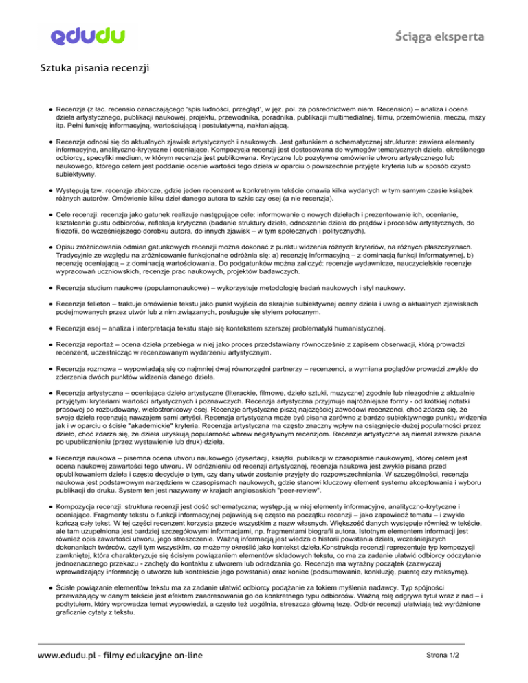 Ściąga eksperta Sztuka pisania recenzji Recenzja (z łac. recensio oznaczającego ‘spis ludności, przegląd’, w jęz. pol. za pośrednictwem niem. Recension) – analiza i ocena dzieła artystycznego, publikacji naukowej, projektu, przewodnika, poradnika, publikacji multimedialnej, filmu, przemówienia, meczu, mszy itp. Pełni funkcję informacyjną, wartościującą i postulatywną, nakłaniającą. Recenzja odnosi się do aktualnych zjawisk artystycznych i naukowych. Jest gatunkiem o schematycznej strukturze: zawiera elementy informacyjne, analityczno-krytyczne i oceniające. Kompozycja recenzji jest dostosowana do wymogów tematycznych dzieła, określonego odbiorcy, specyfiki medium, w którym recenzja jest publikowana. Krytyczne lub pozytywne omówienie utworu artystycznego lub naukowego, którego celem jest poddanie ocenie wartości tego dzieła w oparciu o powszechnie przyjęte kryteria lub w sposób czysto subiektywny. Występują tzw. recenzje zbiorcze, gdzie jeden recenzent w konkretnym tekście omawia kilka wydanych w tym samym czasie książek różnych autorów. Omówienie kilku dzieł danego autora to szkic czy esej (a nie recenzja). Cele recenzji: recenzja jako gatunek realizuje następujące cele: informowanie o nowych dziełach i prezentowanie ich, ocenianie, kształcenie gustu odbiorców, refleksja krytyczna (badanie struktury dzieła, odnoszenie dzieła do prądów i procesów artystycznych, do filozofii, do wcześniejszego dorobku autora, do innych zjawisk – w tym społecznych i politycznych). Opisu zróżnicowania odmian gatunkowych recenzji można dokonać z punktu widzenia różnych kryteriów, na różnych płaszczyznach. Tradycyjnie ze względu na zróżnicowanie funkcjonalne odróżnia się: a) recenzję informacyjną – z dominacją funkcji informatywnej, b) recenzję oceniającą – z dominacją wartościowania. Do podgatunków można zaliczyć: recenzje wydawnicze, nauczycielskie recenzje wypracowań uczniowskich, recenzje prac naukowych, projektów badawczych. Recenzja studium naukowe (popularnonaukowe) – wykorzystuje metodologię badań naukowych i styl naukowy. Recenzja felieton – traktuje omówienie tekstu jako punkt wyjścia do skrajnie subiektywnej oceny dzieła i uwag o aktualnych zjawiskach podejmowanych przez utwór lub z nim związanych, posługuje się stylem potocznym. Recenzja esej – analiza i interpretacja tekstu staje się kontekstem szerszej problematyki humanistycznej. Recenzja reportaż – ocena dzieła przebiega w niej jako proces przedstawiany równocześnie z zapisem obserwacji, którą prowadzi recenzent, uczestnicząc w recenzowanym wydarzeniu artystycznym. Recenzja rozmowa – wypowiadają się co najmniej dwaj równorzędni partnerzy – recenzenci, a wymiana poglądów prowadzi zwykle do zderzenia dwóch punktów widzenia danego dzieła. Recenzja artystyczna – oceniająca dzieło artystyczne (literackie, filmowe, dzieło sztuki, muzyczne) zgodnie lub niezgodnie z aktualnie przyjętymi kryteriami wartości artystycznych i poznawczych. Recenzja artystyczna przyjmuje najróżniejsze formy - od krótkiej notatki prasowej po rozbudowany, wielostronicowy esej. Recenzje artystyczne piszą najczęściej zawodowi recenzenci, choć zdarza się, że swoje dzieła recenzują nawzajem sami artyści. Recenzja artystyczna może być pisana zarówno z bardzo subiektywnego punktu widzenia jak i w oparciu o ścisłe "akademickie" kryteria. Recenzja artystyczna ma często znaczny wpływ na osiągnięcie dużej popularności przez dzieło, choć zdarza się, że dzieła uzyskują popularność wbrew negatywnym recenzjom. Recenzje artystyczne są niemal zawsze pisane po upublicznieniu (przez wystawienie lub druk) dzieła. Recenzja naukowa – pisemna ocena utworu naukowego (dysertacji, książki, publikacji w czasopiśmie naukowym), której celem jest ocena naukowej zawartości tego utworu. W odróżnieniu od recenzji artystycznej, recenzja naukowa jest zwykle pisana przed opublikowaniem dzieła i często decyduje o tym, czy dany utwór zostanie przyjęty do rozpowszechniania. W szczególności, recenzja naukowa jest podstawowym narzędziem w czasopismach naukowych, gdzie stanowi kluczowy element systemu akceptowania i wyboru publikacji do druku. System ten jest nazywany w krajach anglosaskich "peer-review". Kompozycja recenzji: struktura recenzji jest dość schematyczna; występują w niej elementy informacyjne, analityczno-krytyczne i oceniające. Fragmenty tekstu o funkcji informacyjnej pojawiają się często na początku recenzji – jako zapowiedź tematu – i zwykle kończą cały tekst. W tej części recenzent korzysta przede wszystkim z nazw własnych. Większość danych występuje również w tekście, ale tam uzupełniona jest bardziej szczegółowymi informacjami, np. fragmentami biografii autora. Istotnym elementem informacji jest również opis zawartości utworu, jego streszczenie. Ważną informacją jest wiedza o historii powstania dzieła, wcześniejszych dokonaniach twórców, czyli tym wszystkim, co możemy określić jako kontekst dzieła.Konstrukcja recenzji reprezentuje typ kompozycji zamkniętej, która charakteryzuje się ścisłym powiązaniem elementów składowych tekstu, co ma za zadanie ułatwić odbiorcy odczytanie jednoznacznego przekazu - zachęty do kontaktu z utworem lub odradzania go. Recenzja ma wyraźny początek (zazwyczaj wprowadzający informację o utworze lub kontekście jego powstania) oraz koniec (podsumowanie, konkluzję, puentę czy maksymę). Ścisłe powiązanie elementów tekstu ma za zadanie ułatwić odbiorcy podążanie za tokiem myślenia nadawcy. Typ spójności przeważający w danym tekście jest efektem zaadresowania go do konkretnego typu odbiorców. Ważną rolę odgrywa tytuł wraz z nad – i podtytułem, który wprowadza temat wypowiedzi, a często też uogólnia, streszcza główną tezę. Odbiór recenzji ułatwiają też wyróżnione graficznie cytaty z tekstu. www.