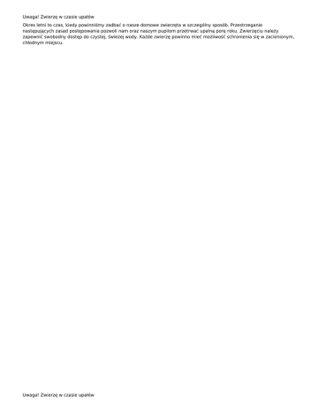 Uwaga! Zwierzę w czasie upałów Okres letni to czas, kiedy powinniśmy zadbać o nasze domowe zwierzęta w szczególny sposób. Przestrzeganie następujących zasad postępowania pozwoli nam oraz naszym pupilom przetrwać upalną porę roku. Zwierzęciu należy zapewnić swobodny dostęp do czystej, świeżej wody. Każde zwierzę powinno mieć możliwość schronienia się w zacienionym, chłodnym miejscu. Uwaga! Zwierzę w czasie upałów