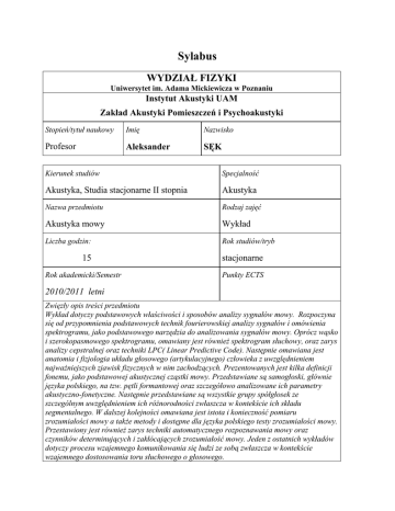 Sylabus WYDZIAŁ FIZYKI Uniwersytet im. Adama Mickiewicza w Poznaniu Instytut Akustyki UAM Zakład Akustyki Pomieszczeń i Psychoakustyki Stopień/tytuł naukowy Imię Nazwisko Profesor Aleksander SĘK Kierunek studiów Specjalność Akustyka, Studia stacjonarne II stopnia Akustyka Nazwa przedmiotu Rodzaj zajęć Akustyka mowy Wykład Liczba godzin: Rok studiów/tryb 15 Rok akademicki/Semestr stacjonarne Punkty ECTS 2010/2011 letni Zwięzły opis treści przedmiotu Wykład dotyczy podstawowych właściwości i sposobów analizy sygnałów mowy. Rozpoczyna się od przypomnienia podstawowych technik fourierowskiej analizy sygnałów i omówienia spektrogramu, jako podstawowego narzędzia do analizowania sygnałów mowy. Oprócz wąsko i szerokopasmowego spektrogramu, omawiany jest również spektrogram słuchowy, oraz zarys analizy cepstralnej oraz techniki LPC( Linear Predictive Code). Następnie omawiana jest anatomia i fizjologia układu głosowego (artykulacyjnego) człowieka z uwzględnieniem najważniejszych zjawisk fizycznych w nim zachodzących. Prezentowanych jest kilka definicji fonemu, jako podstawowej akustycznej cząstki mowy. Przedstawiane są samogłoski, głównie języka polskiego, na tzw. pętli formantowej oraz szczegółowo analizowane ich parametry akustyczno-fonetyczne. Następnie przedstawiane są wszystkie grupy spółgłosek ze szczególnym uwzględnieniem ich różnorodności zwłaszcza w kontekście ich składu segmentalnego. W dalszej kolejności omawiana jest istota i konieczność pomiaru zrozumiałości mowy a także metody i dostępne dla języka polskiego testy zrozumiałości mowy. Przestawiony jest również zarys techniki automatycznego rozpoznawania mowy oraz czynników determinujących i zakłócających zrozumiałość mowy. Jeden z ostatnich wykładów dotyczy procesu wzajemnego komunikowania się ludzi ze sobą zwłaszcza w kontekście wzajemnego dostosowania toru słuchowego o głosowego. Szczegółowa tematyka zajęć 1. Sygnały mowy i sposoby ich analizy 2. Spektrogramy wąsko- i szerokopasmowe oraz spektrogram słuchowy. Formanty 3. Analiza cepstralna, i technika LPC w zarysie. Programy do analizy sygnałów mowy 4. Anatomia, fizjologia funkcjonowanie toru (układu) głosowego. Drgania fałdów głosowych 5. Metody modelowania toru głosowego 6. Dystynktywne cechy mowy. Alofon akustyczny. Fonem – różne definicje 7. Samogłoski i pętla formantowa. Widmowe cechy samogłosek polskich 8. Spółgłoski (zwarte, trące, zwarto-trące, nosowe, boczne itd.) – sposoby wytwarzania i zasadnicze cechy akustyczno fonetyczne 9. Percepcja mowy: modele, koartykulacja, percepcja kategorialna, dualna, 10. mowa sinusoidalna – mod mowy 11. Zrozumiałość mowy: podstawowe techniki i metody wyznaczania zrozumiałości mowy 12. Testy zrozumiałości mowy na przykładzie Polskiego Testu Zdaniowego 13. Uwarunkowania, zjawiska i czynniki determinujące zrozumiałość mowy w warunkach rzeczywistych. Sposób oceniania (wymagania) Udział w ocenie końcowej ocena ciągła (bieżące przygotowanie do zajęć i aktywność) 0 śródsemestralne kolokwia pisemne/ustne 0 końcowe zaliczenie pisemne/ustne 80 egzamin pisemny egzamin ustny 20 kontrola obecności praca końcowa semestralna/roczna inne: zaliczenie równolegle prowadzonego laboratorium akustyki mowy Literatura podstawowa Jassem, W. (1973). Podstawy fonetyki akustycznej (PWN, Warszawa). Basztura, C. (1988), Źródła sygnały i obrazy akustyczne, WKŁ Warszawa Ostaszewska, D. I Tambor, J. (2008), Fonetyka i fonologia współczesnego języka polskiego, PWN Warszawa Literatura rozszerzona Moore, B.C.J (1998), Wprowadzenie do psychologii słyszenia, PWN, Poznań Sapożkow, M.A. (1966), Sygnał mowy w telekomunikacji i cybernetyce, WNT Warszawa