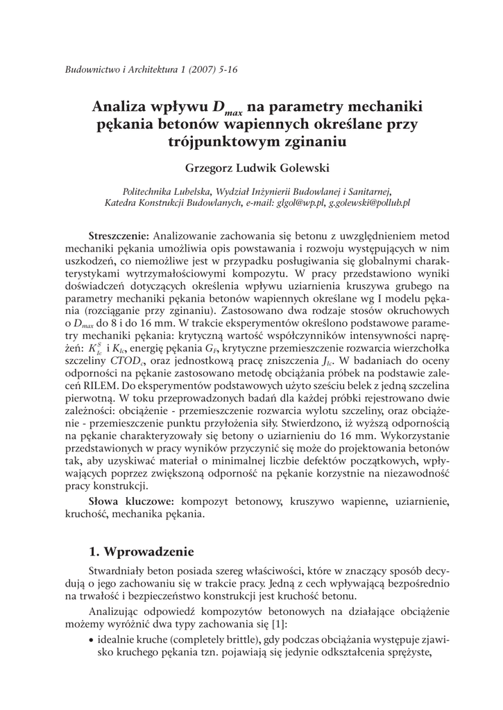 Budownictwo i Architektura 1 (2007) 5-16 Analiza wpływu Dmax na parametry mechaniki pękania betonów wapiennych określane przy trójpunktowym zginaniu Grzegorz Ludwik Golewski Politechnika Lubelska, Wydział Inżynierii Budowlanej i Sanitarnej, Katedra Konstrukcji Budowlanych, e-mail: [email protected], [email protected] Streszczenie: Analizowanie zachowania się betonu z uwzględnieniem metod mechaniki pękania umożliwia opis powstawania i rozwoju występujących w nim uszkodzeń, co niemożliwe jest w przypadku posługiwania się globalnymi charakterystykami wytrzymałościowymi kompozytu. W pracy przedstawiono wyniki doświadczeń dotyczących określenia wpływu uziarnienia kruszywa grubego na parametry mechaniki pękania betonów wapiennych określane wg I modelu pękania (rozciąganie przy zginaniu). Zastosowano dwa rodzaje stosów okruchowych o Dmax do 8 i do 16 mm. W trakcie eksperymentów określono podstawowe parametry mechaniki pękania: krytyczną wartość współczynników intensywności naprężeń: K IcS i KIc, energię pękania GF, krytyczne przemieszczenie rozwarcia wierzchołka szczeliny CTODc, oraz jednostkową pracę zniszczenia JIc. W badaniach do oceny odporności na pękanie zastosowano metodę obciążania próbek na podstawie zaleceń RILEM. Do eksperymentów podstawowych użyto sześciu belek z jedną szczelina pierwotną. W toku przeprowadzonych badań dla każdej próbki rejestrowano dwie zależności: obciążenie - przemieszczenie rozwarcia wylotu szczeliny, oraz obciążenie - przemieszczenie punktu przyłożenia siły. Stwierdzono, iż wyższą odpornością na pękanie charakteryzowały się betony o uziarnieniu do 16 mm. Wykorzystanie przedstawionych w pracy wyników przyczynić się może do projektowania betonów tak, aby uzyskiwać materiał o minimalnej liczbie defektów początkowych, wpływających poprzez zwiększoną odporność na pękanie korzystnie na niezawodność pracy konstrukcji. Słowa kluczowe: kompozyt betonowy, kruszywo wapienne, uziarnienie, kruchość, mechanika pękania. 1. Wprowadzenie Stwardniały beton posiada szereg właściwości, które w znaczący sposób decydują o jego zachowaniu się w trakcie pracy. Jedną z cech wpływającą bezpośrednio na trwałość i bezpieczeństwo konstrukcji jest kruchość betonu. Analizując odpowiedź kompozytów betonowych na działające obciążenie możemy wyróżnić dwa typy zachowania się [1]: • idealnie kruche (completely brittle), gdy podczas obciążania występuje zjawisko kruchego pękania tzn. pojawiają się jedynie odkształcenia sprężyste, 6 Grzegorz Ludwik Golewski • półkruche (semi brittle), gdy zniszczenie materiału poprzedzone jest powstawaniem zarówno małych odkształceń sprężystych jak i plastycznych określanych zwyczajowo jako deformacje quasi-plastyczne. Kruchość betonu decydujący wpływ ma na zachowanie się materiału w miejscach jego struktury, w których występują defekty. W takich kompozytach o zniszczeniu pod wpływem działania obciążeń zewnętrznych decydować mogą wszelkie nieciągłości materiałowe, oraz lokalne skokowe różnice właściwości mechanicznych materiału. W pobliżu defektów betonu takich jak: szczelina, pustka powietrzna, rysa, nieciągłość w sieci krystalicznej, korozja wewnątrzmateriałowa itp. występują pod wpływem obciążenia zewnętrznego lokalne spiętrzenia naprężeń, które mogą spowodować gwałtowną propagację uszkodzenia, prowadząc w skrajnym przypadku do zniszczenia całego elementu. Najbardziej niebezpiecznymi koncentratorami naprężeń są najdrobniejsze szczeliny o ostrych końcach. W wierzchołkach tych szczelin występują, bowiem największe spiętrzenia naprężeń. Ważnym problemem badawczym w analizie zniszczenia betonów jest zagadnienie powstawania mikrodefektów tzw. mechanika uszkodzeń (damage mechanics), oraz zagadnienie rozwoju (propagacji) lub inaczej wzrostu uszkodzeń tzw. mechanika pękania (fracture mechanics). Proces rozwoju uszkodzeń może być opisany przy zastosowaniu parametrów liniowo - sprężystej lub nieliniowej mechaniki pękania [2]. Podstawowe charakterystyki betonu, takie jak wytrzymałość na ściskanie, wytrzymałość na rozciąganie czy moduł Younga, nie dają dostatecznych informacji mogących określić próg naprężenia wywołującego rozwój rys. Analizowanie zachowania się betonów z uwzględnieniem metod mechaniki pękania umożliwia opis powstawania i rozwoju uszkodzeń, co niemożliwe jest w przypadku posługiwania się globalnymi charakterystykami wytrzymałościowymi kompozytu. Istotą problemu jest, bowiem określenie poziomu obciążeń zewnętrznych, przy, których nastąpi niestabilny rozwój rys w elemencie. Parametry mechaniki pękania pozwalają na ocenę odporności na pękanie betonów, co w zasadniczy sposób decyduje o trwałości i bezpieczeństwie konstrukcji. W liniowej mechanice pękania i analizie na poziomie mikroskali materiał traktujemy jako układ atomów, tworzących sieć krystalograficzną. Atomy te w stanie bezobciążeniowym znajdują się w pewnych odległościach od siebie wynikających ze spełnienia warunków równowagi. Defekty materiałowe traktujemy jako nieciągłości w budowie wewnętrznej kompozytu. Oddziaływanie obciążeń mechanicznych na materiał powoduje chwilowe zaburzenie stanu równowagi sieci krystalicznej, a na brzegach lub w wierzchołkach nieciągłości pojawiają się spiętrzenia naprężeń, które inicjują powstawanie bądź rozwój istniejących uszkodzeń. W kontekście powyższych rozważań należy zwrócić szczególną uwagę na występujące w betonie rodzaje defektów struktury omówione np. w pracach [3-5]. Uwzględniając pory, mikropęknięcia, dyslokacje i inkluzje występujące głównie w matrycy cementowej, oraz w warstwie stykowej kruszywo – zaprawa, można określić krytyczną wartość naprężeń powodujących pękanie kompozytów betonowych. 2. Wła