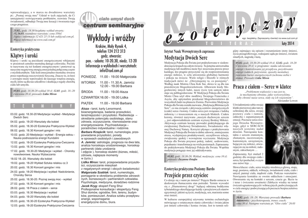 wprowadzający, a w marcu na dwudniowe warsztaty pt.: „Poznaj swoją moc” Udział w tych zajęciach, da Ci umiejętności rozwiązywania problemów, rozwinie Twoją świadomość, odbuduje Twoją moc kreacji i tworzenia tego czego pragniesz. 25.02., godz. 18.30 bezpłatny wykład otwarty; 15, 16.03. weendowe warsztaty; cena 350zł. Zapisy i informacje 12 421 23 13 lub [email protected], Więcej informacji na www.cud.com.pl Ezoteryka praktyczna Klątwy i uroki Klątwy i uroki są pociskami energetycznymi wbijanymi w przestrzeń astralno-mentalną danego człowieka. Pociski te nazywana się też kodami energetycznym i ponieważ są nasycone negatywną energią emocjonalną połączoną często z myślokształtem. Taki kod emocjonalno-mentalny stwarza przez reperkusję rzeczywistość fizyczną. Znaczy to, że ktoś z zewnątrz może wprowadzić do naszego wnętrza energię, myśli, które są dla nas szkodliwe i skutkują z reguły chorobą ciała lub umysłu. 05.03. godz. 18.30-20 wykład 10 zł; 12.03. godz. 18.-20 ćwiczenia 20 zł; prowadzi Lidia Miron T E R M I N Y 03.02. godz. 18.30-20 Medytacja i wykład - Medytacja Dwóch Serc 04.02. godz. 18-20 Warsztaty dla kobiet 05.02. godz. 18.30-20 Ezoteryka Praktyczna-Wykład 06.02. godz. 18.30 Koncert gongów i mis 10.02. godz. 20 Medytacja i wykład - Energia seksu Nauka podnoszenia energii Kundalini 12.02. godz. 18-20 Ezoteryka Praktyczna-Ćwiczenia 13.02. godz. 18.30 Koncert gongów i mis 17.02. godz. 18.30-20 Medytacja i wykład - Choroby nowotworowe, Nauka Wybaczania 18.02 18.-20. Warsztaty dla kobiet 19.02. godz. 18-20 Wykład Sztuka relaksu cz.3 20.02. godz. 18.30 Koncert gongów i mis 24.02. godz. 18-20 Medytacja i wykład: Nadciśnienie, Choroby Serca 25.02. godz. 18.30-20. Poznaj swoją moc - wykład 27.02. godz. 18.30 Koncert gongów i mis 28.02. godz. 18 Praca z ciałem - serce 03.03. godz. 18.30 Medytacja i wykład 04.03. godz. 18-20 Warsztaty dla kobiet 05.03. godz. 18.30-20 Ezoteryka Praktyczna-Wykład 12.03. godz. 18-20 Ezoteryka Praktyczna-Ćwiczenia Wykłady i wróżby Kraków, Mały Rynek 4, telefon 124 212 313 godz. otwarcia: pon. - sobota: 10-20.30, niedz. 12-20 Informacje o wykładach i warsztatach: [email protected] PONIEDZ. 11.00 - 19.00 Małgorzata WTOREK 11.00 - 11.30 A. Jamróz 12.00 - 19.00 Barbara ŚRODA 11.00 - 19.00 Aisza CZWARTEK16.00 - 19.00 Lidka PIĄTEK 11.00 - 19.00 Barbara Aisza - tarot, karty Lenormand, bioenergoterapia, badanie przeszłości, teraźniejszości i przyszłości. Radiestezja – określanie potencjału osobistego, stanu zdrowia, oczyszczanie, równoważenie oraz energetyzowanie. Psychoedukacja – poradnictwo indywidualne i rodzinne. Barbara Krząścik: tarot, numerologia, przepowiadanie przyszłości, porady w sprawach osobistych i zawodowych A. Jamróz: astrologia, prognoza na dwa lata, analiza horoskopu urodzeniowego, horoskop partnerski (data urodzenia i zdjęcie ), horoskop stuletni (biznes, miłość, zdrowie, najlepsze momenty w życiu.) Lidka Miron: tarot, przepowiadanie przyszłości, oczyszczanie mieszkań z negatywnych energii i obcych świadomości Małgorzata Szablak: tarot, numerologia, pomaganie w określaniu problemów zdrowotnych, biznesowych i partnerskich człowieka. Psychologia, medycyna, doradztwo rodzinne Jacek Kryg: ekspert Feng Shui Profesjonalne konsultacje i ekspertyzy Feng Shui domów, ogrodów, firm, terenu, budynków, pomieszczeń. Analiza szlaku przepływu energii, wspomaganie energetyczne domu, biura. KALENDARZ y n z c y r e ezot egz. bezpłatny. Zapraszamy również na www.cud.com.pl T U I Istytut Nauk Wewnętrznych zaprasza: Medytacja Dwóch Serc Medytacja Pokoju dla Świata jest praktykowana w siedemdziesięciu krajach na całym świecie. Ta potężna uniwersalna medytacja lub modlitwa może być stosowana prawie przez każdego, kto pragnie przyczynić się do rozprzestrzeniania energii miłości, w celu utworzenia globalnej harmonii i pokoju na świecie. Wiele religii i filozofii w różnych tradycjach mówi że: „Otrzymujemy to, co posiejemy”. Według nauk Mistrza Choa Kok Sui, słowa te są dla nas prawdziwym błogosławieństwem. Albowiem kiedy błogosławimy innych ludzi, nasze życie tym samym także staje się pobłogosławione. W Medytacji Pokoju dla Świata Mistrz Choa użył słów modlitwy Świętego Franciszka z Asyżu, aby optymalnie przekazać błogosławieństwo do wszystkich ludzi na planecie Ziemia. Pierwotnie Medytacja Pokoju dla Świata została nazwana „Medytacją Bliźniaczych Serc”, co ma związek z aktywacją centrów energetycznych (czakr) serca i korony. Czakra serca jest związana z ludzką miłością i z troszczeniem się o naszych bliskich. Czakra korony, również nazywana „naszym duchowym sercem „, jest odpowiednikiem centrum wyższej Boskiej Miłości. Aktywacja centrum korony prowadzi praktykującego do zwiększonej Duchowej Świadomości, Świadomości własnej Duchowej Natury. Korzyści płynące z praktykowania Medytacji Pokoju dla Świata to dobre zdrowie, zmniejszenie stresu, wydajniejsza produktywność, szczęśliwsze relacje, zwiększony spokój i wewnętrzne wyciszenie. Medytacja Pokoju dla Świata przynosi pokój, radość, uzdrowienie, pojednanie i transformacje na wielu poziomach. Zapraszamy do praktykowania Medytacji Pokoju dla Świata. Wspólna medytacja potęguje moc jej oddziaływania. 03.02. godz. 18.30-20; Wykład, medytacja; cena 10 zł; prowadzi Zuzanna Ostafin Ezoteryka praktyczna Poziomy Bardo Przejście przez czyściec Co dzieje się z nami po śmierci? Pojęcie Bardo oznacza w dosłownym tłumaczeniu stan pośredni. Termin wywodzi się z „Diamentowej drogi” będącej odmianą buddyzmu tybetańskiego określającego każdy z przejściowych stanów egzystencji: jakimi są życie, medytację, sen, marzenia senne oraz śmierć. W kulturze europejskiej używamy terminu eschatologia mówiącego o ostatecznym stanie człowieka i świata jakim jest śmierć człowieka i koniec świata. J