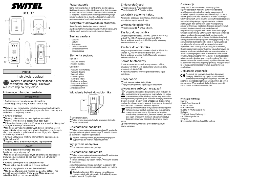 BCC 37 1 Przeznaczenie Zmiana głośności Gwarancja Niania elektroniczna służy do monitorowania dziecka w pokoju. Nadajnik umieszczony blisko dziecka transmituje dźwięki wydawane przez dziecko do odbiornika. Każde inne użycie uznawane jest za niezgodne z przeznaczeniem. Nieautoryzowane modyfikacje i zmiany konstrukcji nie są dozwolone. Pod żadnym pozorem nie powinno się otwierać urządzenia i naprawiać go samemu. Naciśnij klawisz [9] Zwiększ głośność. Naciśnij klawisz [10] Zmniejsz głośność. Sprzęt SWITEL jest produkowany i testowany zgodnie z najnowocześniejszymi metodami. Zastosowanie dokładnie wyselekcjonowanych materiałów i wysoko zaawansowanych technologii zapewnia bezproblemowe działanie i długi czas pracy. Warunki gwarancji nie mają zastosowania do baterii stosowanych w tych w produktach. Okres gwarancji wynosi 24 miesiące od zakupu. Wszystkie braki wynikające z użytych materiałów lub błędów produkcyjnych, które ujawnią się w czasie trwania gwarancji zostaną wyeliminowane nieodpłatnie. Prawa do roszczeń w ramach gwarancji ulegają anulowaniu w przypadku ingerencji urządzeniach kupującego lub osób trzecich. Zniszczenia będące wynikiem nieprawidłowego użytkowania lub stosowania, normalnego zużycia, nieodpowiedniego ustawienia lub przechowywania, nieprawidłowego podłączania lub instalacji, działania siły wyższej lub innych czynników zewnętrznych nie podlegają gwarancji. W przypadku reklamacji zastrzegamy sobie prawo do naprawy uszkodzonych elementów, ich wymiany lub wymiany całych urządzeń. Wymienione części lub urządzenia pozostają naszą własnością. Roszczenia za zniszczenia są wyłączone w przypadkach gdy nie ma dowodów umyślnego zaniedbania leżącego po stronie producenta. Jeżeli urządzenie przejawia oznaki uszkodzenia w czasie trwania gwarancji, należy urządzenie SWITEL zwrócić do punktu sprzedaży, w którym zostało zakupione, wraz z dowodem zakupu. Wszystkie prawa do reklamacji w ramach gwarancji, zgodnie z niniejszą umową, są realizowane wyłącznie przez punkty sprzedaży. Po upływie dwóch lat od zakupu żadne reklamacje w ramach gwarancji nie będą uwzględniane. Korzystaj w odpowiednim otoczeniu Sprawdź przepisy obowiązujące w danej lokalizacji. Zapobiegaj nadmiernemu wystawieniu na dym, brud, wibracje, chemikalia, wilgoć, gorąco i bezpośrednie promienie słoneczne. 2 34 Zestaw zawiera 5 - 6 Elementy zestawu 7 10 11 9 8 POLSKI Instrukcja obsługi Prosimy o dokładne przeczytanie zawartych informacji i zachowanie instrukcji na przyszłość. Odbiornik Nadajnik Akumulatory Zasilacz do nadajnika Zasilacz do odbiornika Instrukcja obsługi • • Informacje o bezpieczeństwie Nadajnik 1Wskaźnik działania 2Gniazdo zasilacza Odbiornik 3Wskaźnik poziomu hałasu 4Wskaźnik działania 5Wskaźnik odbioru 6Zaczep do paska 7Komora na baterie 8Podłączenie zasilacza 9Zwiększanie głośności 10Zmniejszanie głośności 11Przełącznik wł./wył. Wkładanie baterii do odbiornika OSTRZEŻENIE! • Śmiertelne ryzyko uduszenia się kablem Dzieci mogą zaplątać się w kable i udusić się. Upewnij się, że jednostki monitorowania dziecka i kable zasilające są w miejscu niedostępnym dla dzieci, tzn. są one oddalone co najmniej o metr. • Ryzyko eksplozji! Używaj tylko zasilaczy zawartych w zestawie! Używaj tylko baterii z zestawu lub tego typu! Z bateriami należy obchodzić się ze starannością i korzystać z nich jak zostało przedstawione. Nigdy nie używaj standardowych baterii i akumulatorów razem. Nigdy nie używaj razem baterii o różnych pojemnościach lub stopniach naładowani razem. Nigdy nie używaj uszkodzonych baterii. • Ryzyko udławienia małymi elementami, opakowaniem i folią ochronną! Trzymaj dzieci z dala od produktu i opakowania. UWAGA! • Ryzyko pożaru od wtyczek zasilacza! Zasilacze mogą się zagrzać. Nigdy nie pozostawiaj żadnych obiektów na zasilaczach Upewnij się, że dostęp do zasilaczy nie jest utrudniony przez meble itp. • Ryzyko potknięcia o źle położony kabel! Połóż kable tak, by nikt się o nie nie potknął! • Baterie - ryzyko dla zdrowia i środowiska! Nigdy nie otwieraj, nie niszcz i nie połykaj baterii i nie pozwól by zanieczyściły środowisko. Mogą zawierać szkodliwe i toksyczne metale ciężkie. Otwórz komorę baterii. Podłącz wtyczkę akumulatorów i włóż akumulatory do środka. Zamknij komorę baterii. Uruchamianie nadajnika Podłącz wtyczkę zasilacza do gniazda zasilacza [2] w nadajniku i podłącz zasilacz do gniazda elektrycznego. Wskaźnik działania [1] zaświeci się i urządzenie będzie działać. Nadajnik transmituje również, gdy odbiornik jest wyłączony. Sygnały mogą być odebrane przez inne jednostki. Wyłączanie nadajnika Odłącz zasilacz z gniazda elektrycznego. Uruchamianie odbiornika Podłącz wtyczkę zasilacza do gniazda zasilacza [8] w odbiorniku i podłącz zasilacz do gniazda elektrycznego. Naciśnij klawisz [11] aby włączyć element. Wskaźnik działania [4] zaświeci się. Jeśli wskaźnik działania [4] miga, akumulatory są ładowane. Gdy zostaną naładowane, odbiornik może działać również bez zasilania z gniazda. Zasięg to maksymalnie 300 m ale może być zredukowany przez przeszkodę takie jak ściany itp. Jeśli odbiornik jest poza zasięgiem, wskaźnik [5] będzie migał. Wskaźnik poziomu hałasu Wskaźnik ten [3] pokazuje poziom hałasu. Im głośniej jest w otoczeniu, tym szybciej wskaźnik miga. Wyłączanie odbiornika Naciśnij klawisz [11] Wyłącz odbiornik. Zasilacz do nadajnika Energooszczędny zasilacz 5E-AD050060-E (wejście 100-240 VAC, wyjście 5 VDC, 600 mA) obciążenie zerowe to ok. 0,04 W. Średnia wydajność wynosi ok. 69,5 %. Maksymalny pobór mocy podczas działania to ok. 1,2 W. Zasilacz do odbiornika Energooszczędny zasilacz 5E-AD050060-E (wejście 100-240 VAC, wyjście 5 VDC, 600 mA) obciążenie zerowe to ok. 0,04 W. Średnia wydajno
