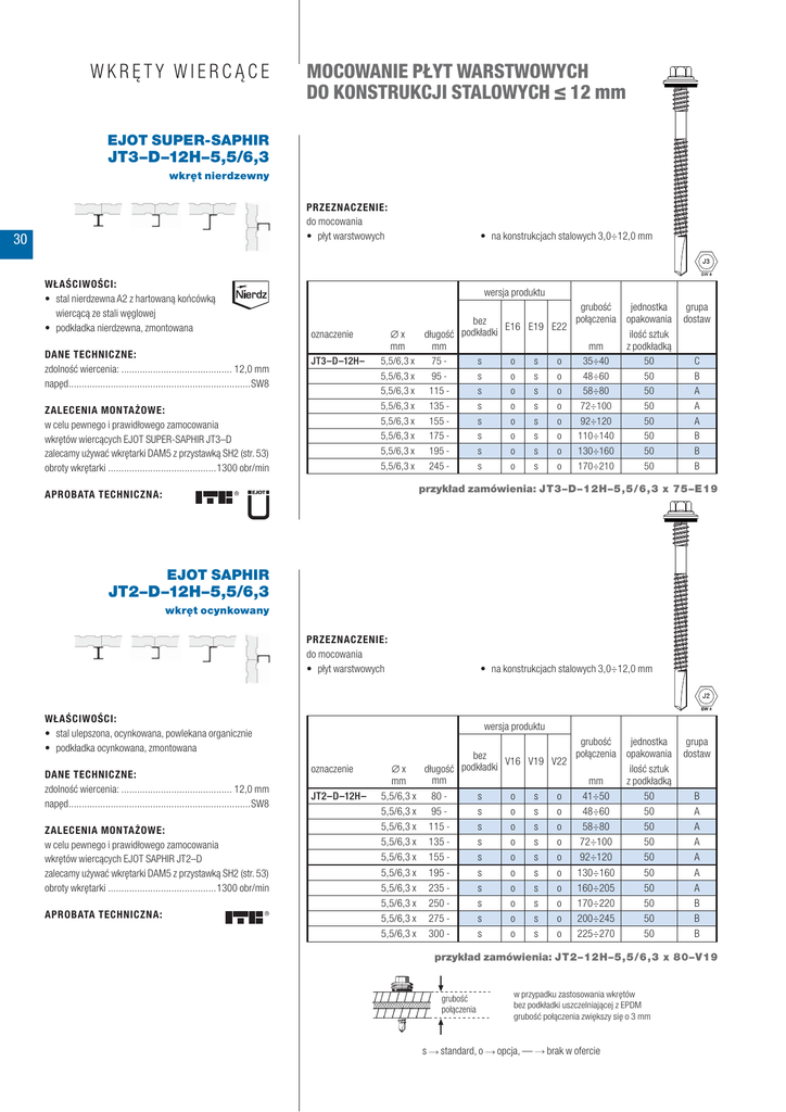 WKRĘTY WIERCĄCE MOCOWANIE PŁYT WARSTWOWYCH DO KONSTRUKCJI STALOWYCH ≤ 12 mm EJOT SUPER-SAPHIR JT3–D–12H–5,5/6,3 wkręt nierdzewny PRZEZNACZENIE: do mocowania Ř płyt warstwowych 30 WŁAŚCIWOŚCI: Ř stal nierdzewna A2 z hartowaną końcówką wiercącą ze stali węglowej Ř podkładka nierdzewna, zmontowana DANE TECHNICZNE: zdolność wiercenia: .......................................... 12,0 mm napęd.....................................................................SW8 Ř na konstrukcjach stalowych 3,0÷12,0 mm wersja produktu oznaczenie JT3–D–12H– ZALECENIA MONTAŻOWE: w celu pewnego i prawidłowego zamocowania wkrętów wiercących EJOT SUPER-SAPHIR JT3–D zalecamy używać wkrętarki DAM5 z przystawką SH2 (str. 53) obroty wkrętarki .........................................1300 obr/min x mm 5,5/6,3 x 5,5/6,3 x 5,5/6,3 x 5,5/6,3 x 5,5/6,3 x 5,5/6,3 x 5,5/6,3 x 5,5/6,3 x grubość jednostka połączenia opakowania bez E16 E19 E22 długość podkładki ilość sztuk mm mm z podkładką 75 s o s o 35÷40 50 95 s o s o 48÷60 50 115 s o s o 58÷80 50 135 s o s o 72÷100 50 155 s o s o 92÷120 50 175 s o s o 110÷140 50 195 s o s o 130÷160 50 245 s o s o 170÷210 50 grupa dostaw C B A A A B B B przykład zamówienia: JT3–D–12H–5,5/6,3 x 75–E19 APROBATA TECHNICZNA: EJOT SAPHIR JT2–D–12H–5,5/6,3 wkręt ocynkowany PRZEZNACZENIE: do mocowania Ř płyt warstwowych WŁAŚCIWOŚCI: Ř stal ulepszona, ocynkowana, powlekana organicznie Ř podkładka ocynkowana, zmontowana DANE TECHNICZNE: zdolność wiercenia: .......................................... 12,0 mm napęd.....................................................................SW8 ZALECENIA MONTAŻOWE: w celu pewnego i prawidłowego zamocowania wkrętów wiercących EJOT SAPHIR JT2–D zalecamy używać wkrętarki DAM5 z przystawką SH2 (str. 53) obroty wkrętarki .........................................1300 obr/min APROBATA TECHNICZNA: Ř na konstrukcjach stalowych 3,0÷12,0 mm wersja produktu oznaczenie JT2–D–12H– x mm 5,5/6,3 x 5,5/6,3 x 5,5/6,3 x 5,5/6,3 x 5,5/6,3 x 5,5/6,3 x 5,5/6,3 x 5,5/6,3 x 5,5/6,3 x 5,5/6,3 x grubość jednostka połączenia opakowania bez V16 V19 V22 długość podkładki ilość sztuk mm mm z podkładką 80 s o s o 41÷50 50 95 s o s o 48÷60 50 115 s o s o 58÷80 50 135 s o s o 72÷100 50 155 s o s o 92÷120 50 195 s o s o 130÷160 50 235 s o s o 160÷205 50 250 s o s o 170÷220 50 275 s o s o 200÷245 50 300 s o s o 225÷270 50 grupa dostaw B A A A A A A B B B przykład zamówienia: JT2–12H–5,5/6,3 x 80–V19 grubość połączenia s standard, o w przypadku zastosowania wkrętów bez podkładki uszczelniającej z EPDM grubość połączenia zwiększy się o 3 mm opcja, — brak w ofercie