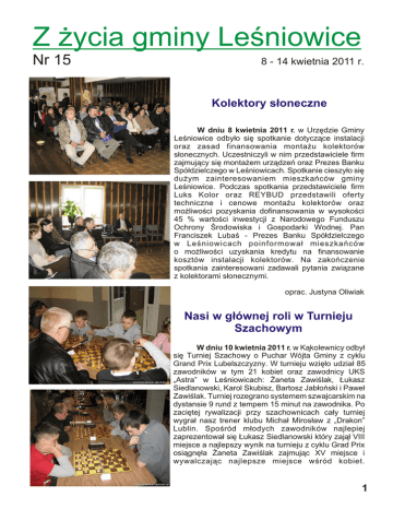 Z ¿ycia gminy Leœniowice Nr 15 8 - 14 kwietnia 2011 r. Kolektory s³oneczne W dniu 8 kwietnia 2011 r. w Urzêdzie Gminy Leœniowice odby³o siê spotkanie dotycz¹ce instalacji oraz zasad finansowania monta¿u kolektorów s³onecznych. Uczestniczyli w nim przedstawiciele firm zajmuj¹cy siê monta¿em urz¹dzeñ oraz Prezes Banku Spó³dzielczego w Leœniowicach. Spotkanie cieszy³o siê du¿ym zainteresowaniem mieszkañców gminy Leœniowice. Podczas spotkania przedstawiciele firm Luks Kolor oraz REYBUD przedstawili oferty techniczne i cenowe monta¿u kolektorów oraz mo¿liwoœci pozyskania dofinansowania w wysokoœci 45 % wartoœci inwestycji z Narodowego Funduszu Ochrony Œrodowiska i Gospodarki Wodnej. Pan Franciszek Lubaœ - Prezes Banku Spó³dzielczego w Leœniowicach poinformowa³ mieszkañców o mo¿liwoœci uzyskania kredytu na finansowanie kosztów instalacji kolektorów. Na zakoñczenie spotkania zainteresowani zadawali pytania zwi¹zane z kolektorami s³onecznymi. oprac. Justyna Oliwiak Nasi w g³ównej roli w Turnieju Szachowym W dniu 10 kwietnia 2011 r. w K¹kolewnicy odby³ siê Turniej Szachowy o Puchar Wójta Gminy z cyklu Grand Prix Lubelszczyzny. W turnieju wziê³o udzia³ 85 zawodników w tym 21 kobiet oraz zawodnicy UKS „Astra” w Leœniowicach: ¯aneta Zawiœlak, £ukasz Siedlanowski, Karol Skubisz, Bartosz Jab³oñski i Pawe³ Zawiœlak. Turniej rozegrano systemem szwajcarskim na dystansie 9 rund z tempem 15 minut na zawodnika. Po zaciêtej rywalizacji przy szachownicach ca³y turniej wygra³ nasz trener klubu Micha³ Miros³aw z „Drakon” Lublin. Spoœród m³odych zawodników najlepiej zaprezentowa³ siê £ukasz Siedlanowski który zaj¹³ VIII miejsce a najlepszy wynik na turnieju z cyklu Grad Prix osi¹gnê³a ¯aneta Zawiœlak zajmuj¹c XV miejsce i wywalczaj¹c najlepsze miejsce wœród kobiet. 1 W poszczególnych kategoriach nasi zawodnicy zajêli nastêpuj¹ce miejsca: * w kategorii dziewcz¹t do lat 18: I miejsce ¯aneta Zawiœlak, * w kategorii ch³opców do lat 14: I miejsce £ukasz Siedlanowski, VIII miejsce Karol Jab³oñski, X miejsce Bartosz Jab³oñski * w kategorii ch³opców do lat 10: X miejsce Pawe³ Zawiœlak Oprac. Wies³aw Radziêciak Narada dyrektorów W dniu 11 kwietnia 2011 r. w Szkole Podstawowej w Leœniowicach odby³a siê narada dyrektorów szkó³, któr¹ zorganizowa³ Pan Wies³aw Radziêciak Wójt Gminy. Podczas spotkania przed³o¿one zosta³y: Informacja dyrektorów z wykorzystania urlopów pracowników za 2010 r., Informacja z realizacji projektu „Radosna Szko³a” oraz Informacja z wykorzystania œrodków przeznaczonych na dofinansowanie doskonalenia zawodowego nauczycieli w 2010 r. Ponadto podczas narady omówione zosta³o Zarz¹dzenie Nr 10/10 z dnia 22.02.2010 roku w sprawie trybu, sposobu i terminu sporz¹dzania arkuszy organizacyjnych szkó³, któro bêdzie obowi¹zywa³o w roku szkolnym 2011/2012, a tak¿e dokonano analizy projektu wniosku o dotacje ze œrodków Wojewódzkiego Funduszu Ochrony Œrodowiska i Gospodarki Wodnej w Lublinie na zadania z zakresu edukacji ekologicznej. Omówione zosta³y równie¿ sprawy bie¿¹ce zwi¹zane z funkcjonowaniem szkó³. Oprac. Agnieszka Raczyñska Spotkanie organizacyjne z przedsiêbiorcami W dniu 12 kwietnia 2011 r. odby³o siê spotkanie Wójta Gminy z przedsiêbiorcami zainteresowanymi obs³ug¹ handlow¹ imprez kulturalnych zaplanowanych do organizacji W 2011 r. W wyniku dyskusji i z³o¿onych specyfikacji wymagañ handlowych ustalono, ¿e obs³ug¹ handlow¹ imprezy „Gminny Dzieñ Stra¿aka” prowadziæ bêdzie Pan Pawe³ Klasura a Gminne Œwiêto Ludowe, Festiwal „Dzieñ Konia” i Gminne Do¿ynki prowadziæ bêdzie Pani Krystyna Tatys. Oprac. Jadwiga Lisowska 2 Narada pracowników Urzêdu Gminy Leœniowice W dniu 13 kwietnia 2011 r. odby³a siê narada zorganizowana przez Wójta Gminy w którym, udzia³ wziêli Przewodnicz¹cy Rady Gminy, Sekretarz, kierownicy oraz pracownicy referatów i jednostek organizacyjnych gminy. Podczas narady przed³o¿one zosta³o Sprawozdanie z wykonania bud¿etu gminy za 2010 r. oraz Informacja z realizacji uchwa³y Rady Gminy Leœniowice Nr XVI/102/08 w sprawie przyst¹pienia Gminy Leœniowice do realizacji rekultywacji sk³adowiska odpadów komunalnych po³o¿onego w miejscowoœci Leœniowice oraz ponoszenia kosztów zwi¹zanych z realizacj¹ inwestycji. Ponadto przed³o¿one zosta³y informacje: z wykorzystania urlopów przez pracowników w 2010 r., z przebiegu wyborów so³tysów oraz Informacja pracowników urzêdu gminy z wykonywania swoich zakresów czynnoœci tj. Pani Marty Psuji, Pani Justyny Oliwiak, Pani Malwiny Stañkowskiej. Na zakoñczenie omówione zosta³y sprawy bie¿¹ce zwi¹zane z funkcjonowaniem urzêdu. Oprac. Agnieszka Raczyñska Podsumowanie Kampanii Walnych Zebrañ Sprawozdawczych OSP W dniu 14 kwietnia 2011 r. odby³o siê posiedzenie Zarz¹du Oddzia³u Gminnego Zwi¹zku Ochotniczych Stra¿y Po¿arnych RP w Leœniowicach, na którym podsumowano kampaniê walnych zebrañ sprawozdawczo-wyborczych ze wszystkich jednostek dzia³aj¹cych na terenie gminy. Podczas posiedzenia omówiono osi¹gniêcia jednostek oraz zatwierdzono Plan dzia³ania Zarz¹du Oddzia³u Gminnego na 2011 r., w którym uwzglêdniono wyposa¿enie i remont remiz OSP oraz zakup sprzêtu. Pojêto uchwa³ê o zwo³aniu Zjazdu Oddzia³u Gminnego na dzieñ 29 kwietnia 2011 r. a tak¿e organizacjê Gminnych Zawodów SportowoPo¿arniczych, które zaplanowano na dzieñ 8 maja br. godz. 11:00 na stadionie sportowym w Leœniowicach. oprac. Edward Szka³uba 3 Kiermasz Wielkanocny W dniu 14 kwietnia 2011 r. Lokalna Grupa Dzia³ania „Ziemi Che³mskiej" zorganizowa³a w gmachu Starostwa Powiatowego w Che³mie Kiermasz Wielkanocny, w którym udzia³ wziê³y twórczynie ludowe z terenu gminy Leœniowic: Maria To³ysz, Maria Dziedzic, El¿bieta £uczkiewicz, Ma³gorzata Dziedzicka oraz Bo¿ena Czerniej. Wszystkie Panie zaprezentowa³y swoje prace p